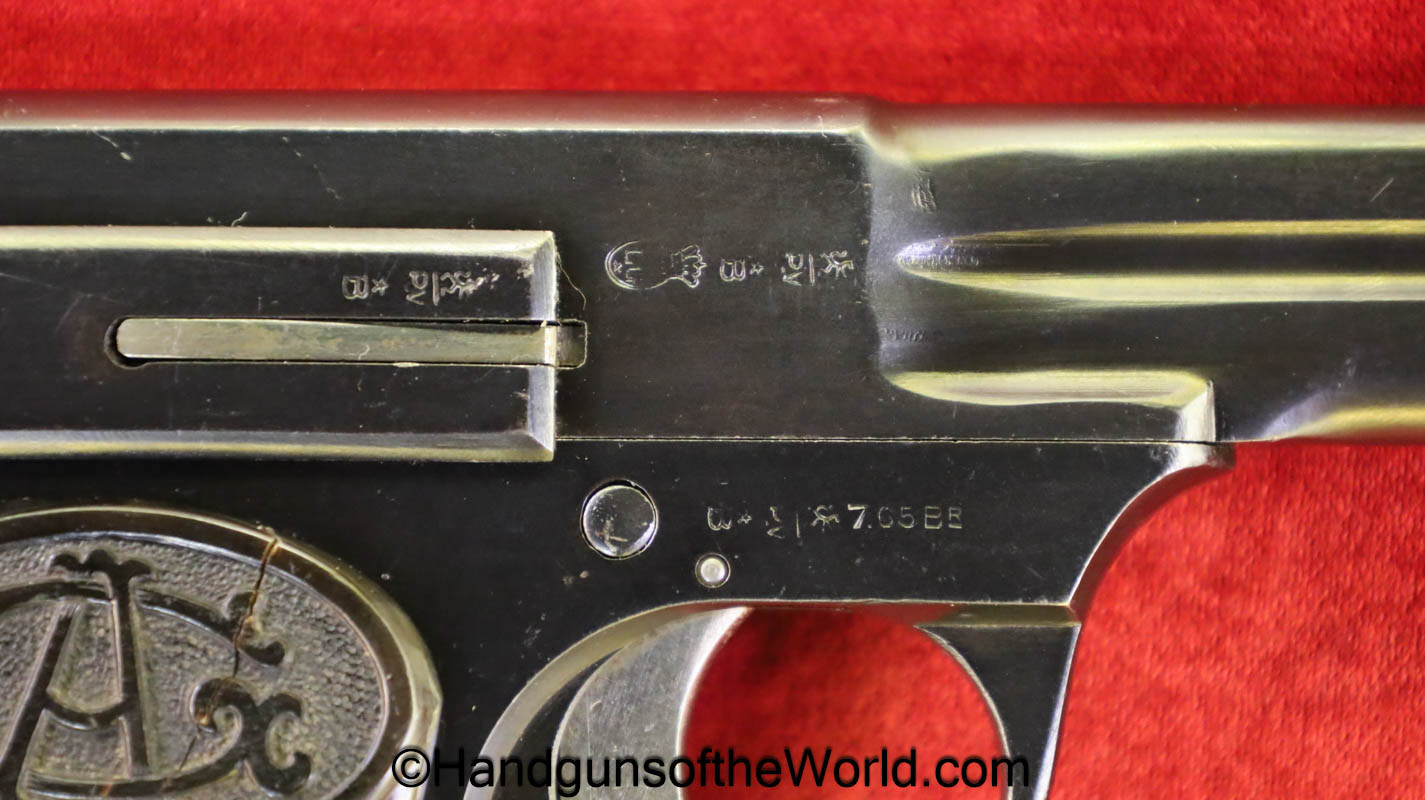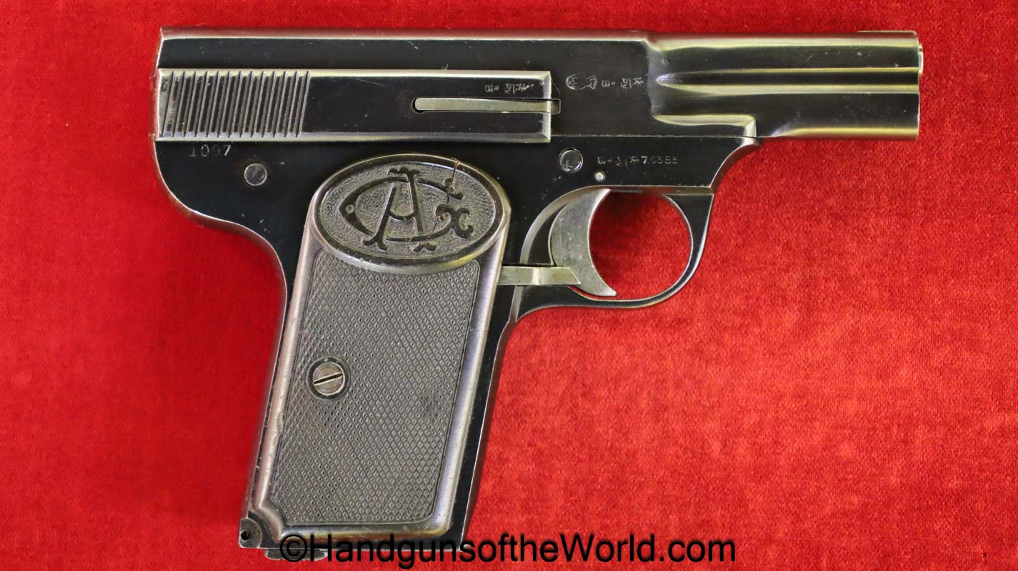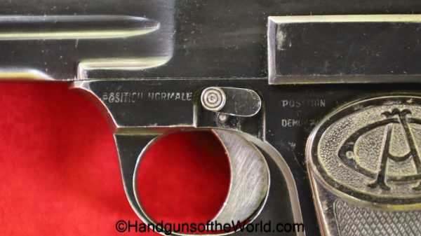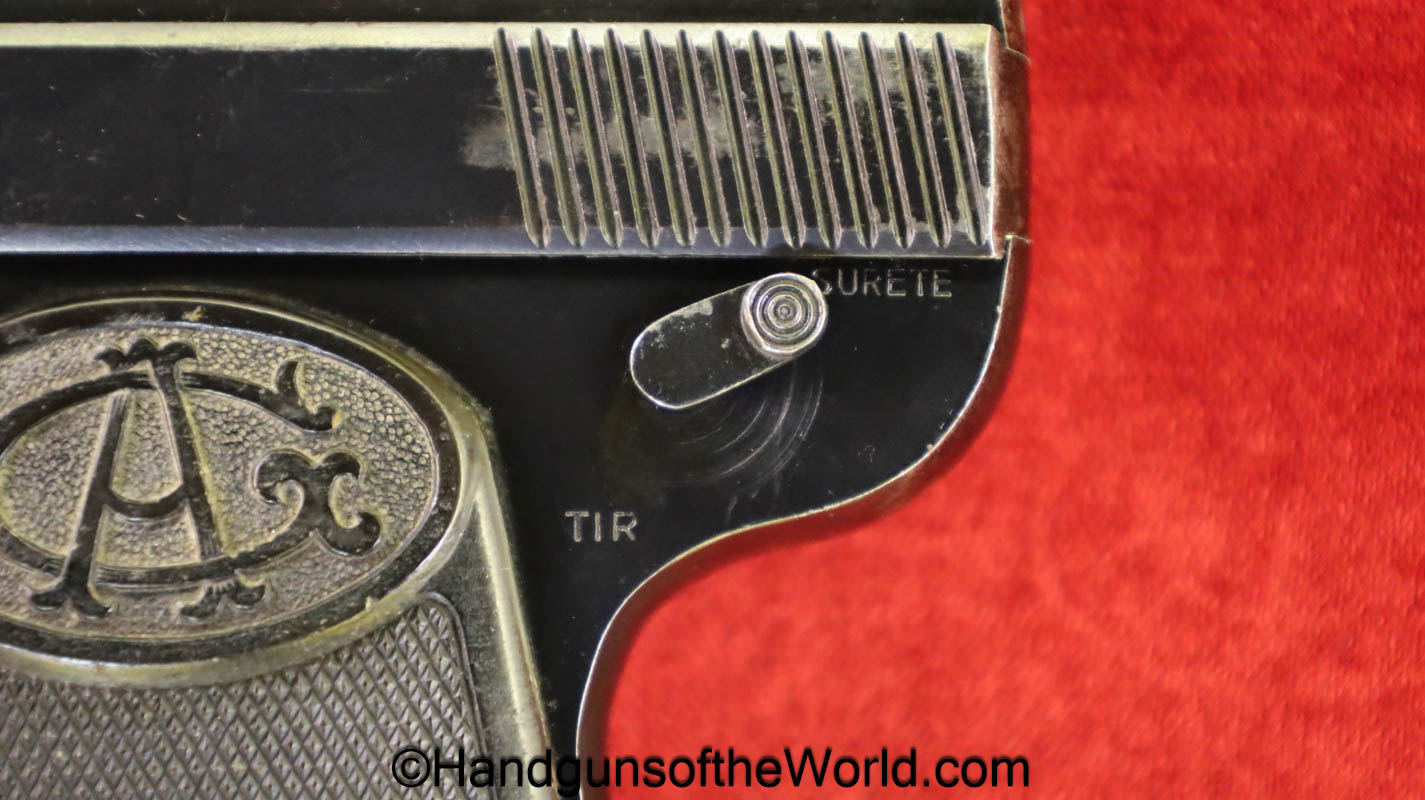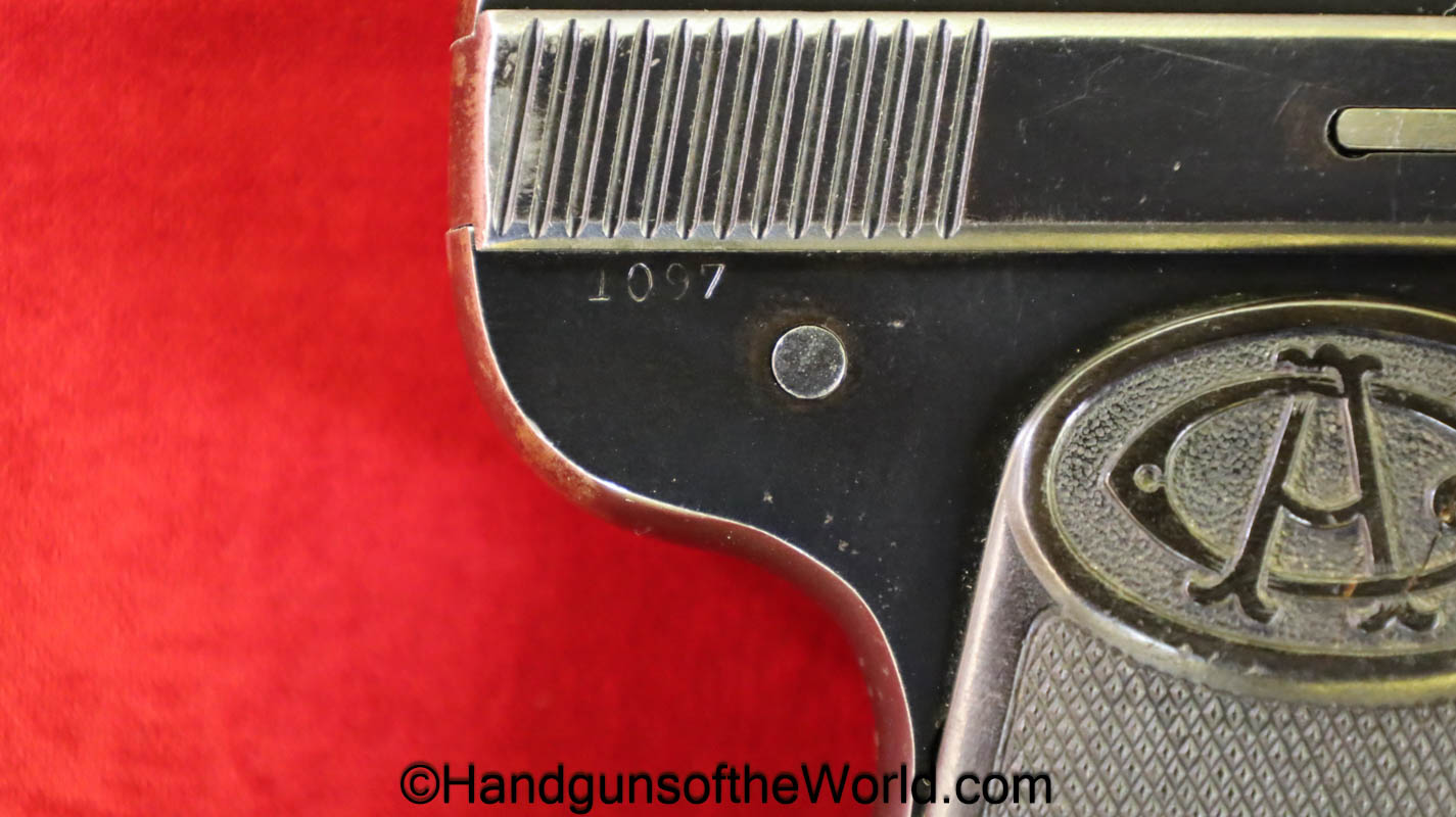 Armand Gavage Pocket, 7.65mm. This is Belgium proofed on the frame, slide and barrel, and has safety markings in French-Surete-Tir. This has the AG logo horn grips. The blue rates about 98% and the bore is VG+.