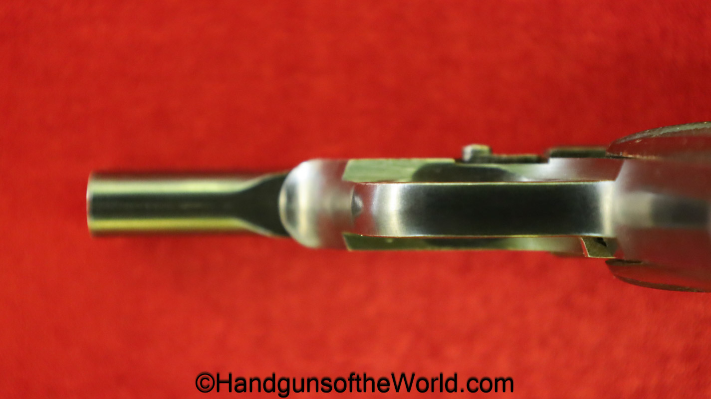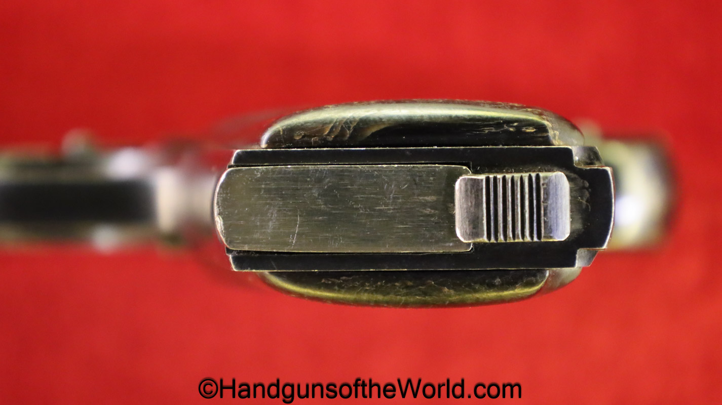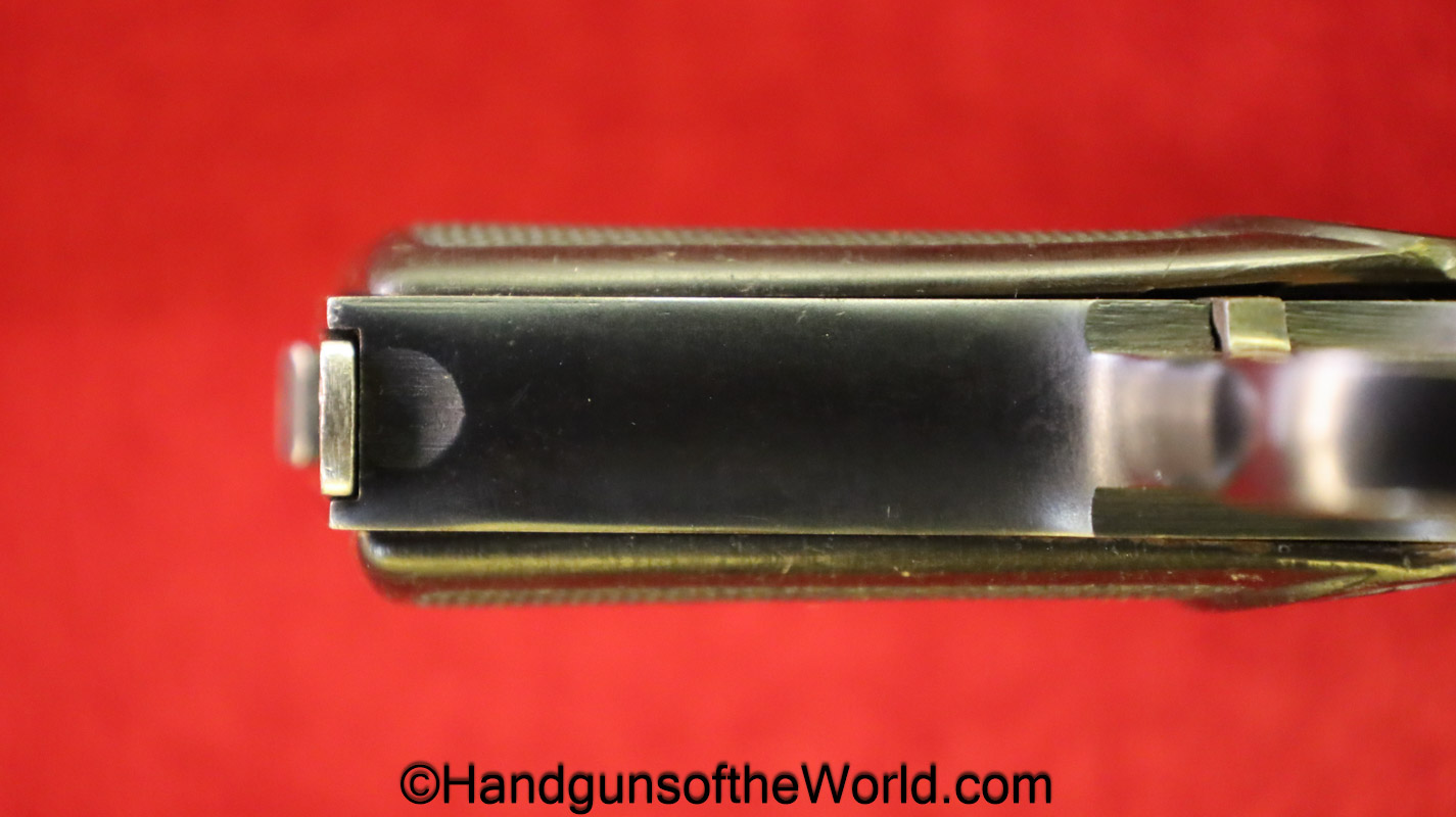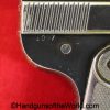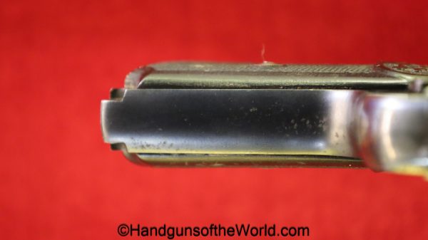 Armand Gavage Pocket, 7.65mm. This is Belgium proofed on the frame, slide and barrel, and has safety markings in French-Surete-Tir. This has the AG logo horn grips. The blue rates about 98% and the bore is VG+.