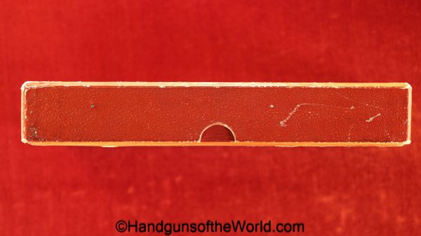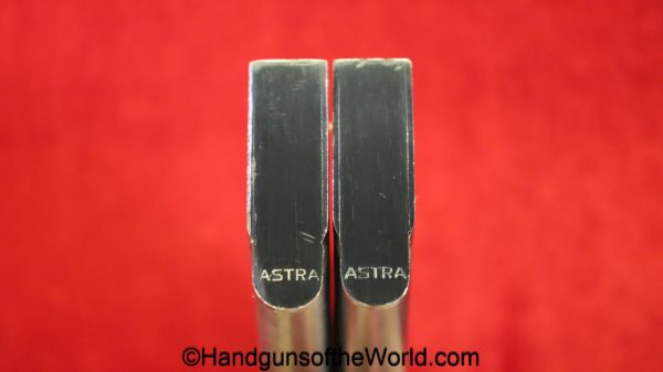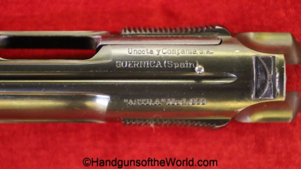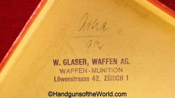 Astra 800 Condor, 9mm. This is Spanish proof/dated 1958 and has the proper black plastic, Astra logo grips. This has all matching numbers, and no importer markings. The blue rates 99+% and the bore is excellent. This was shipped in 1958 to W.Glaser in Zurich Switzerland and is so ink stamped inside the lid with their retailer information. This is also noted as 1 of 8 sold to Glaser in the Astra Firearms Book, by Antaris, Page 315. This is fantastic in the original, numbered, red cardboard box with a cleaning rod, spare original magazine and a copy of the manual. Glaser is still in business today.
