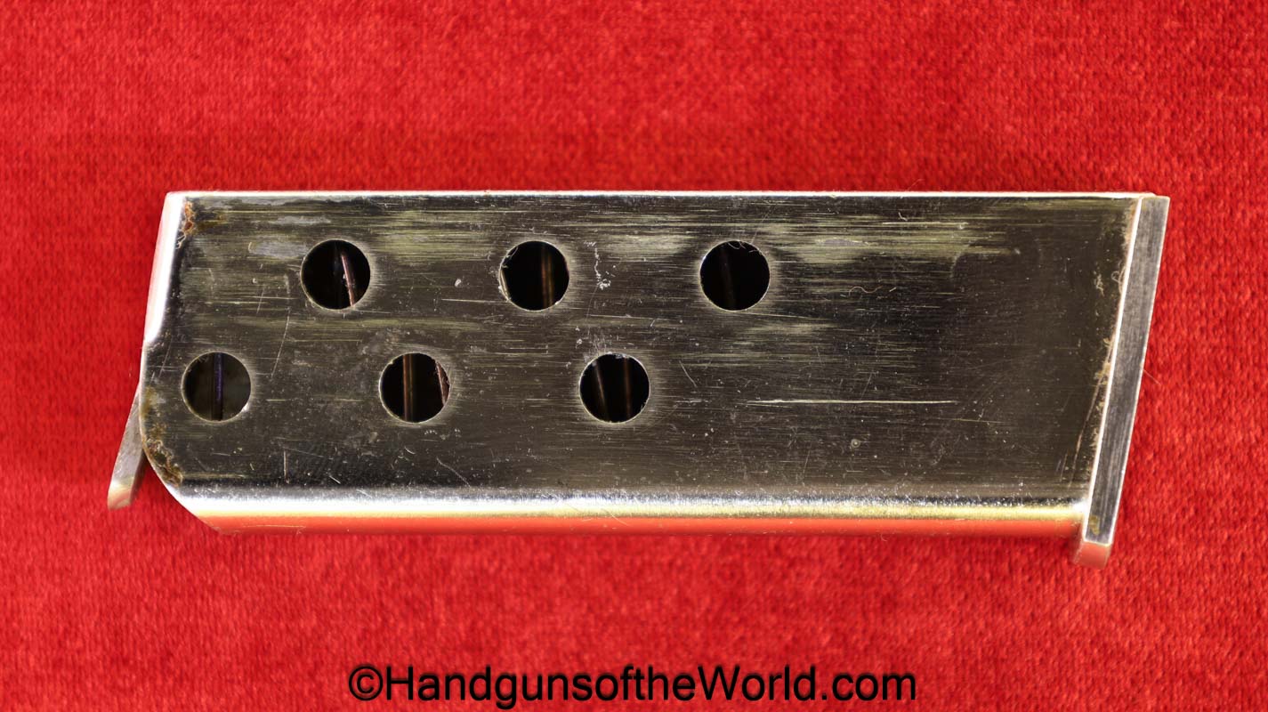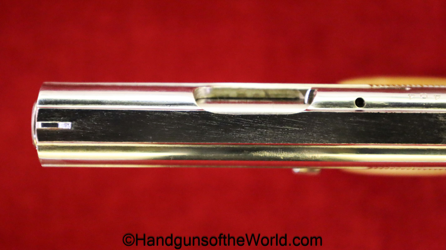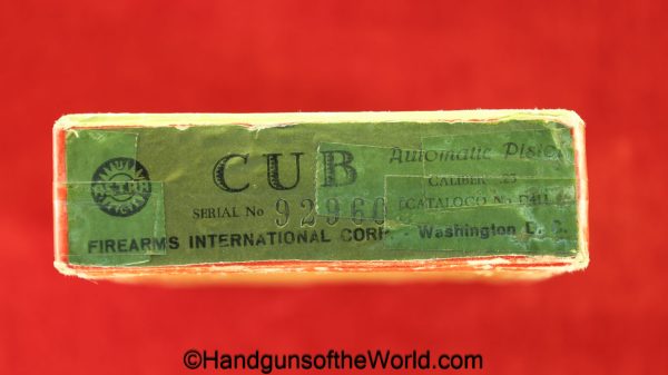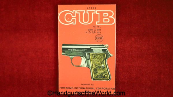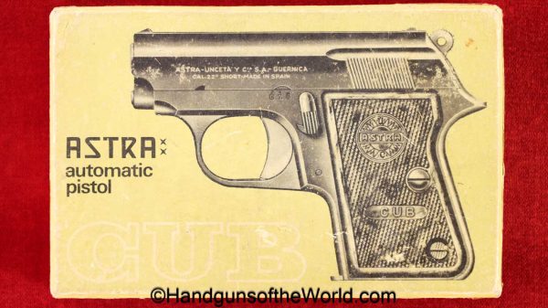 Astra Cub, 6.35mm. This is Spanish proof/dated 1966 under the white pearlite grips. This retains 99% factory nickel finish and the bore is excellent. This comes with an original cardboard box, numbered to a different pistol, with manual.