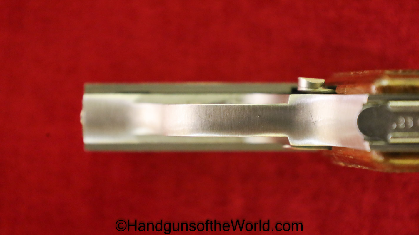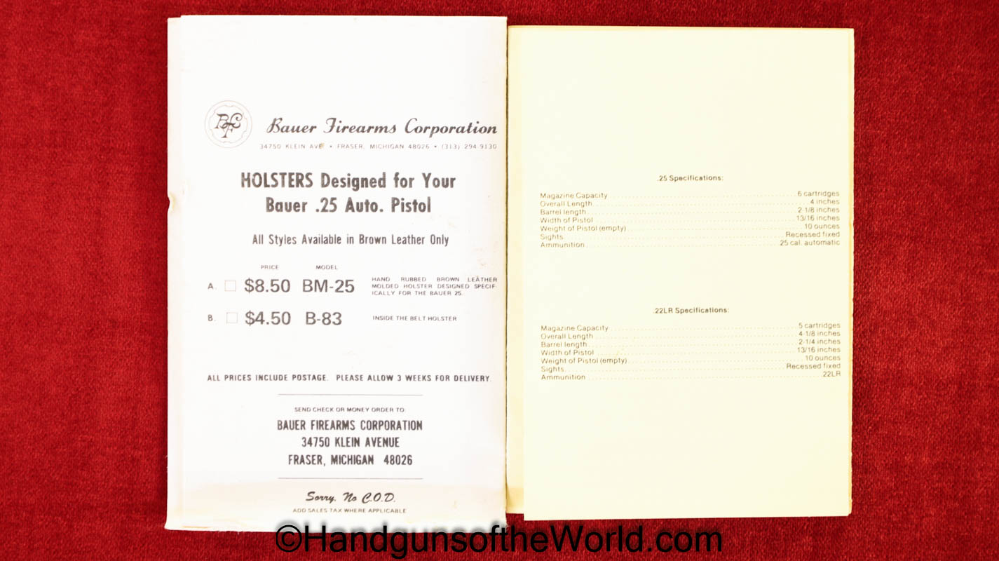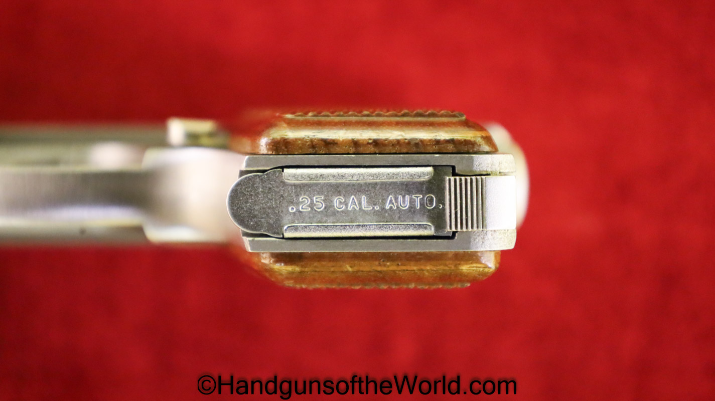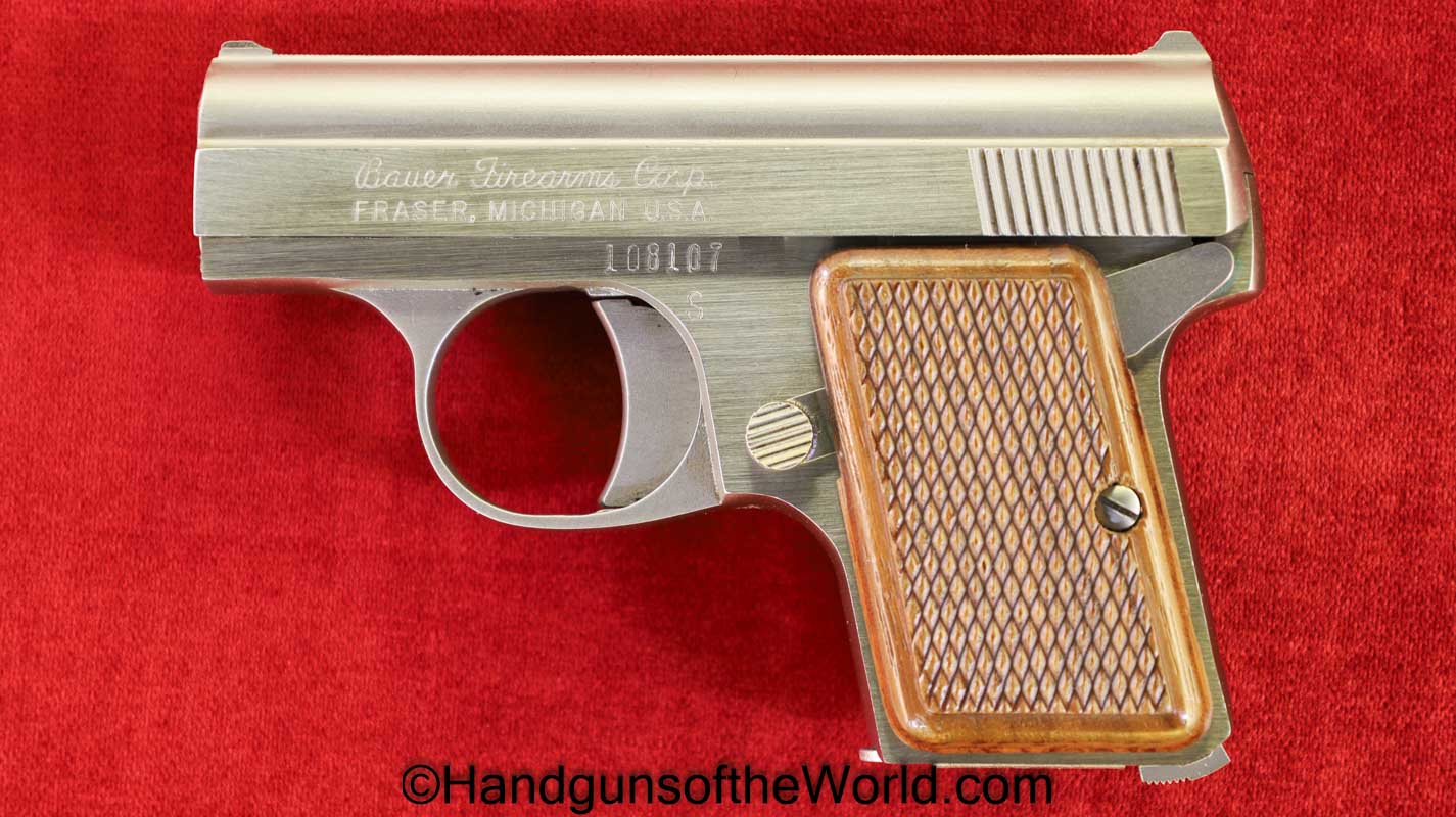 Bauer Firearms Bauer Automatic, .25 caliber. This is full stainless with checkered walnut grips. This is excellent overall and is in an original box numbered to a different pistol, and the manual is included.