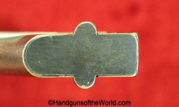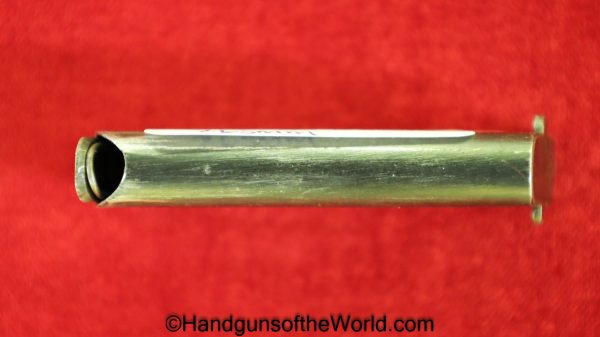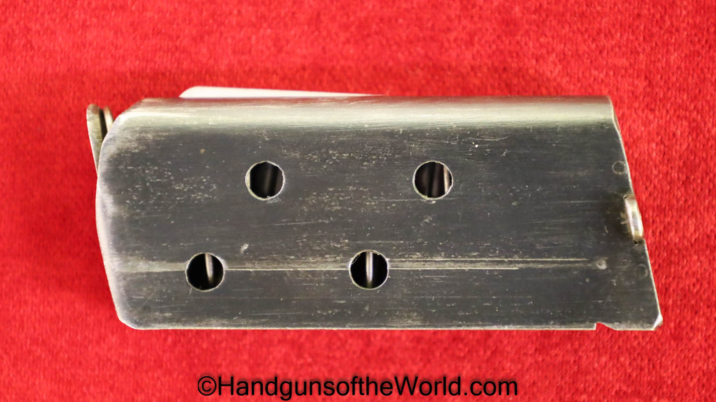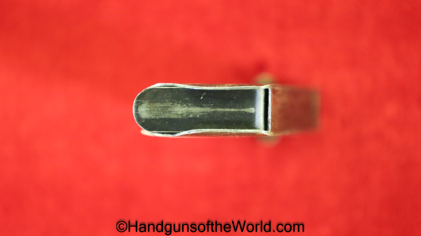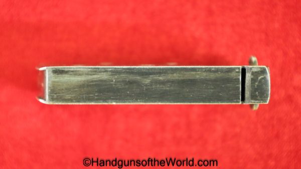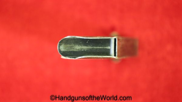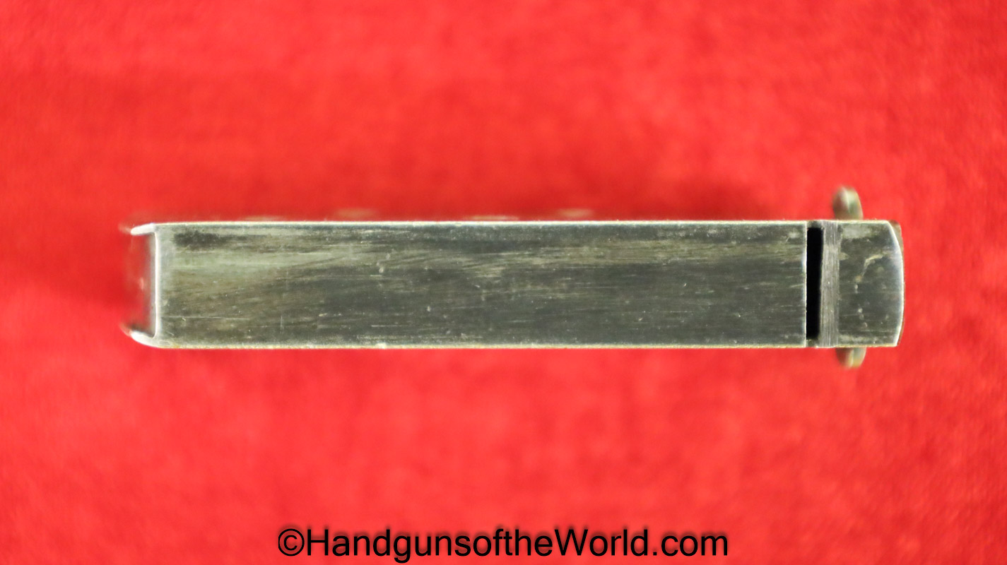 Original Bayard 1908 Pistol Magazine. Marked on the side “Cal 7.65”. Both removal tips are intact. About 95% blue remains.