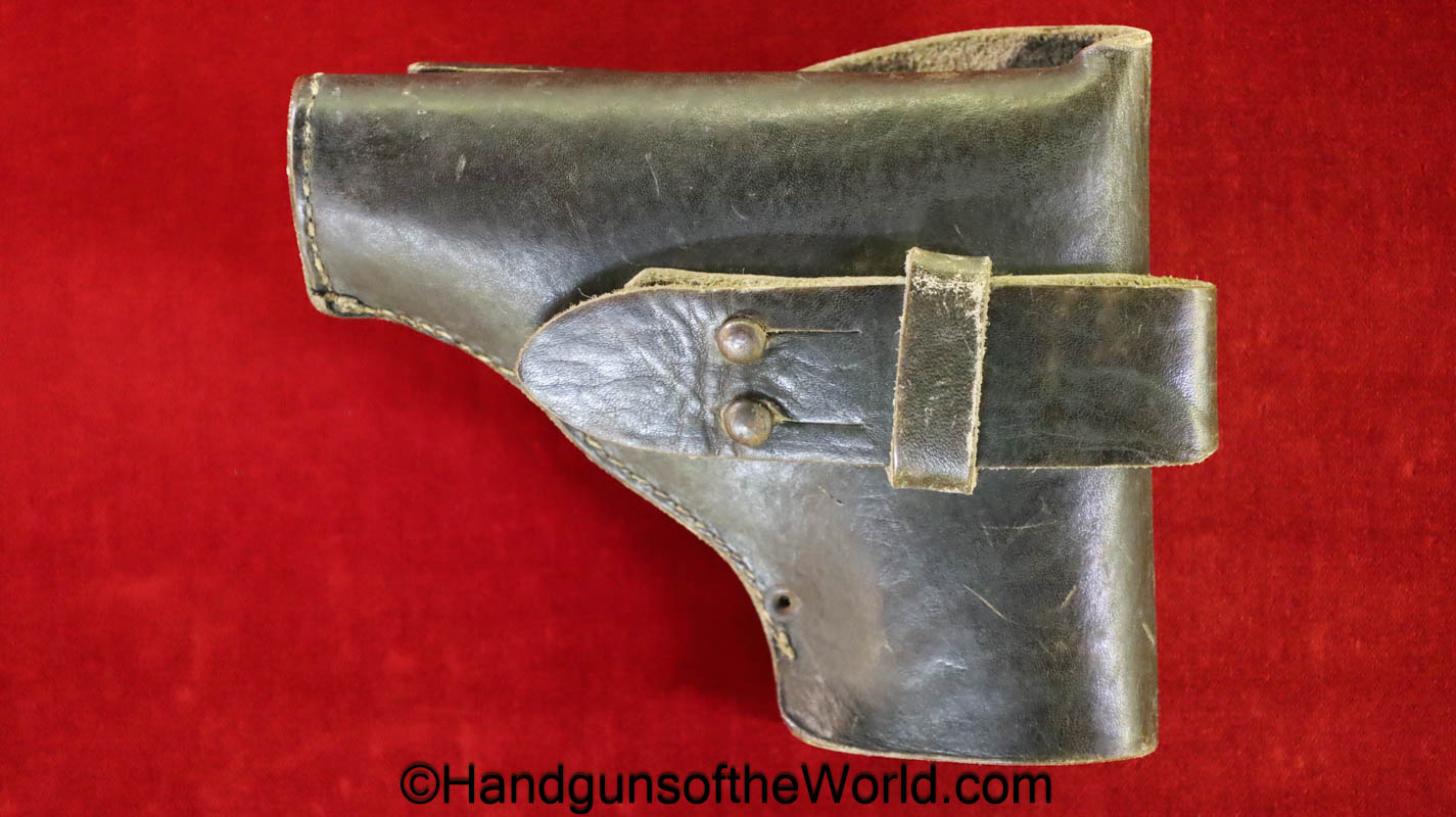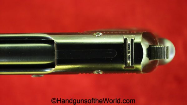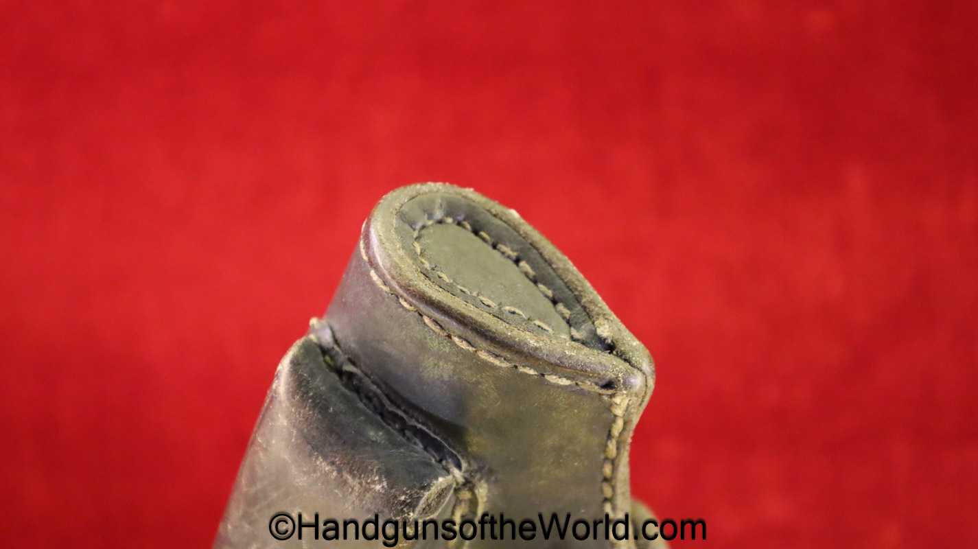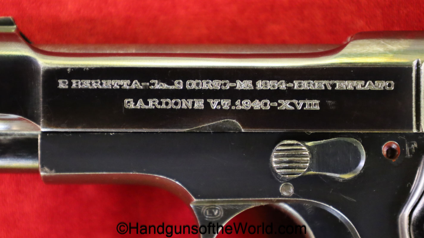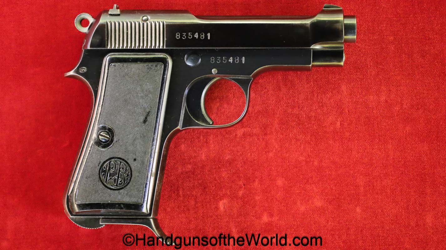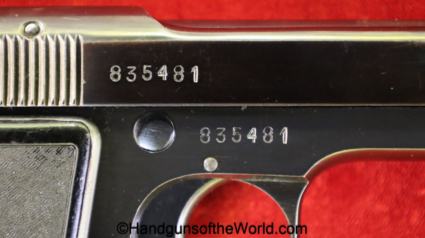 Beretta 1934, .380 caliber. This has the full slide legend and is dated 1940-XVIII. This is Italian Military Crown RE proofed on the left rear tang. This has all matching numbers, about 95% blue and an excellent bore. This full rig includes a green leather full flap holster, a spare magazine and WWII Capture paper from the Army Air Force Base, North African Division-Air Transport Command.