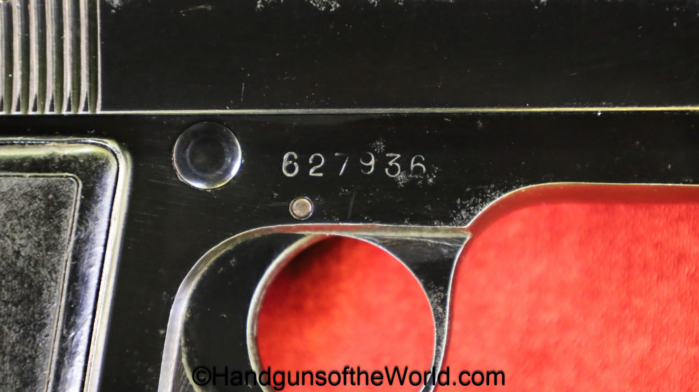 Beretta 1935, 7.65mm. This is a Very Early Post-War Italian Military RE-Proofed example. This features the post-war slide legend with black bakelite grips and retains 99% of a reblue with a F-G bore.
