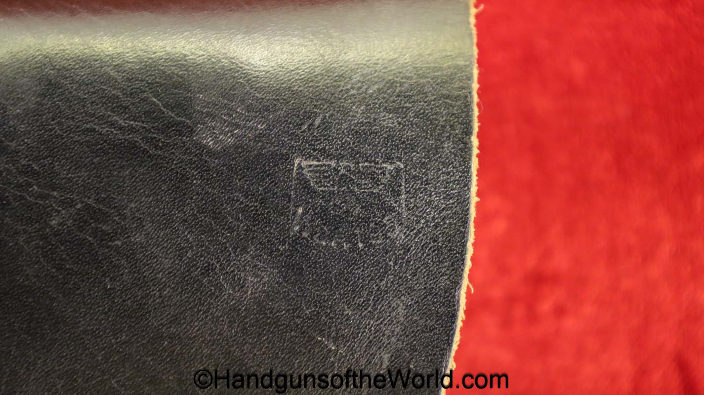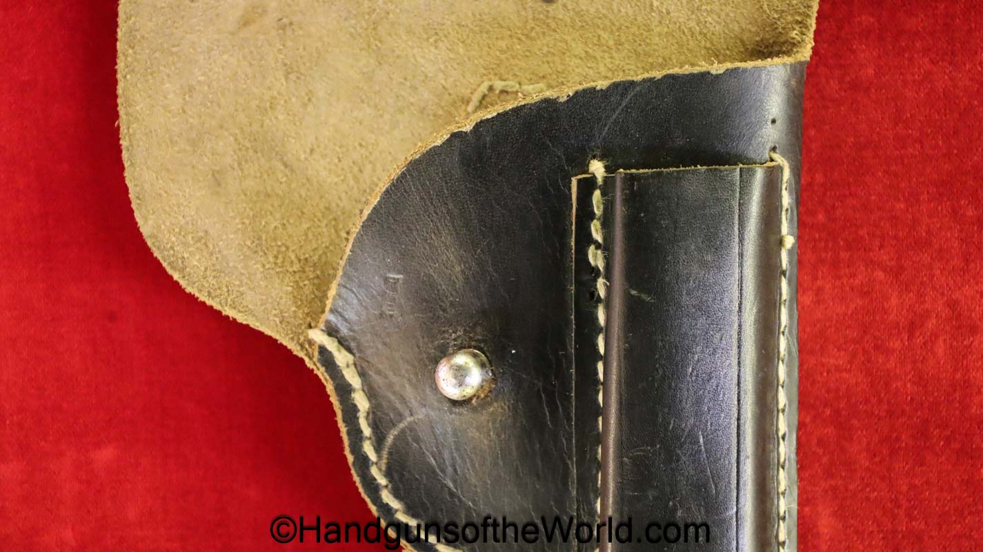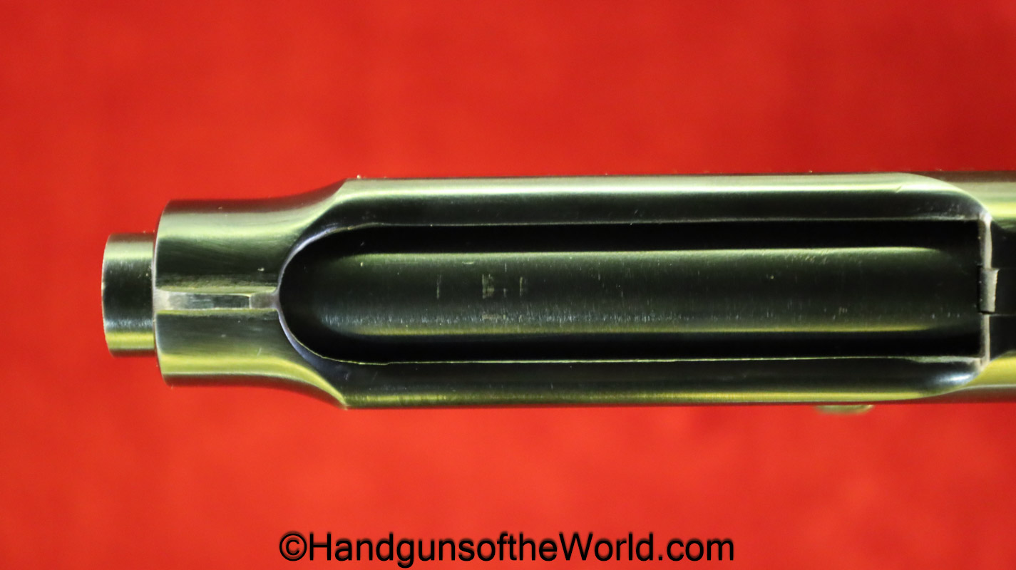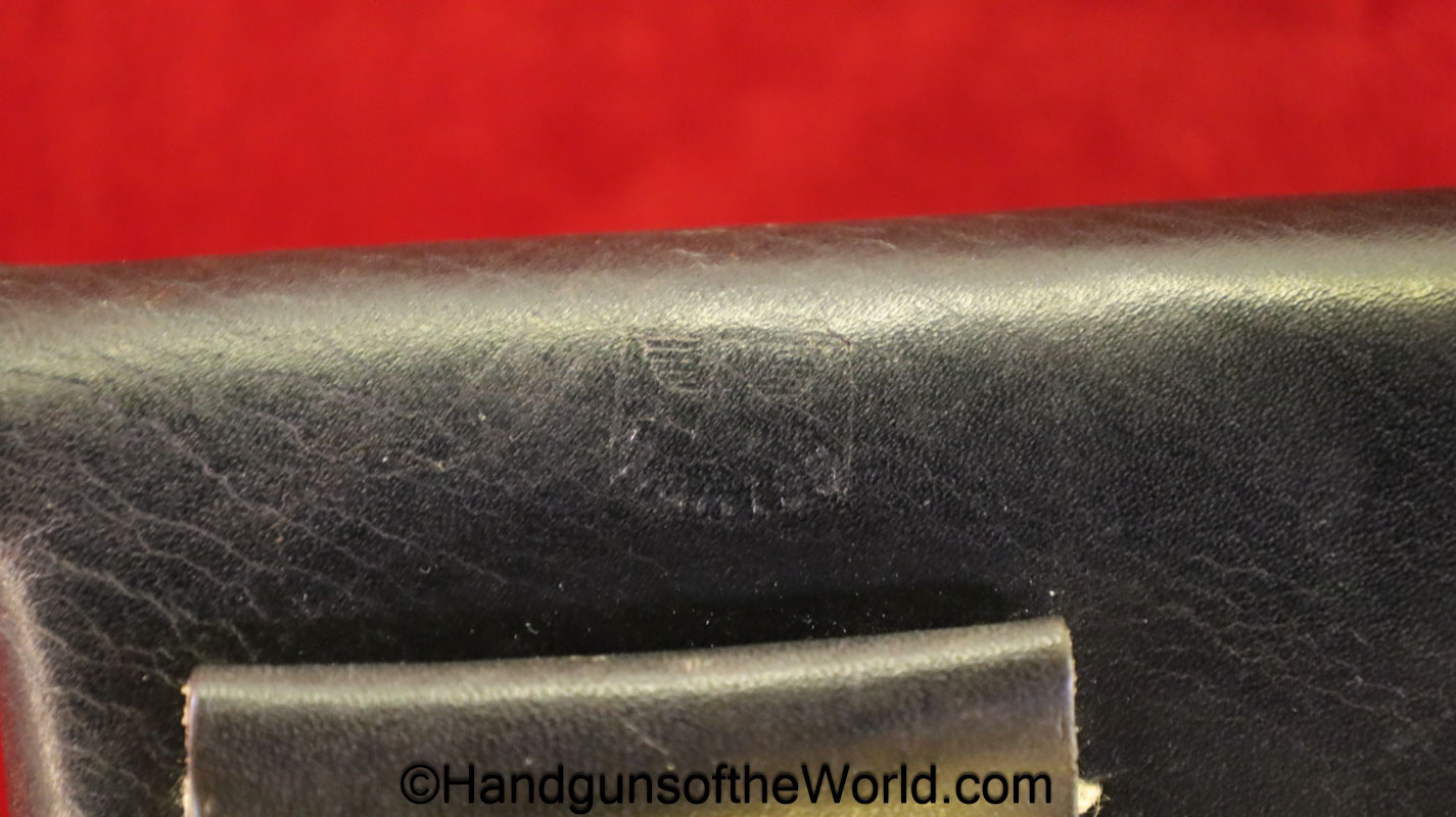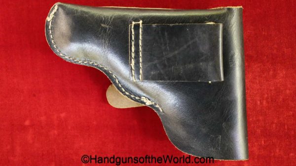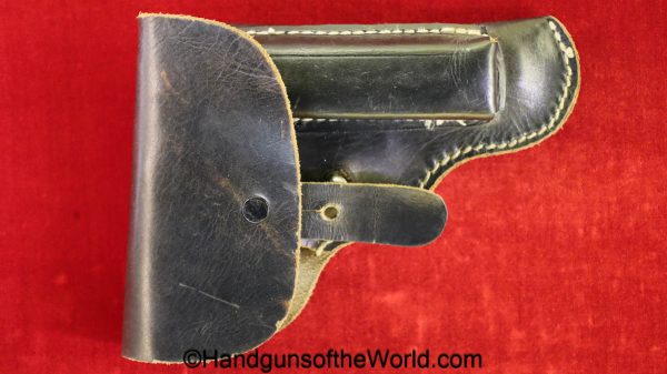 Beretta 1935, 7.65mm. This is Italian Proofed on the left rear tang, and has a blank slide, and black Bakelite grips. This has all matching numbers. The blue rates about 99% and the bore is excellent. This comes with a black leather CZ-27 holster with spurious German markings on the back.