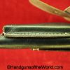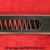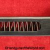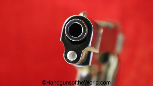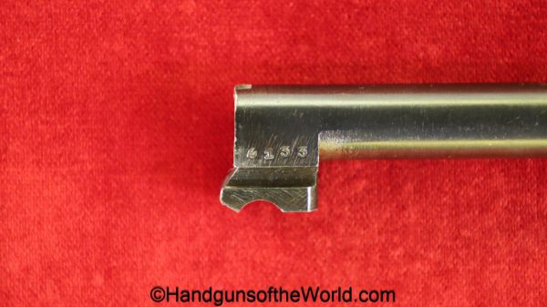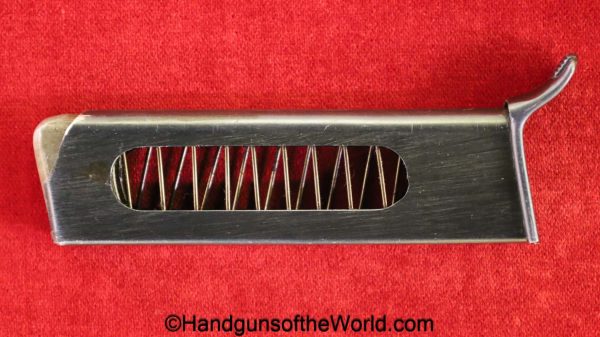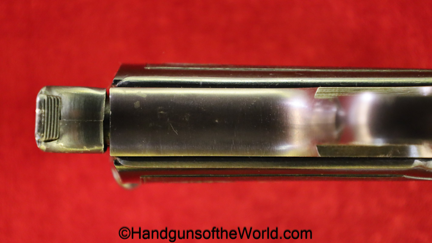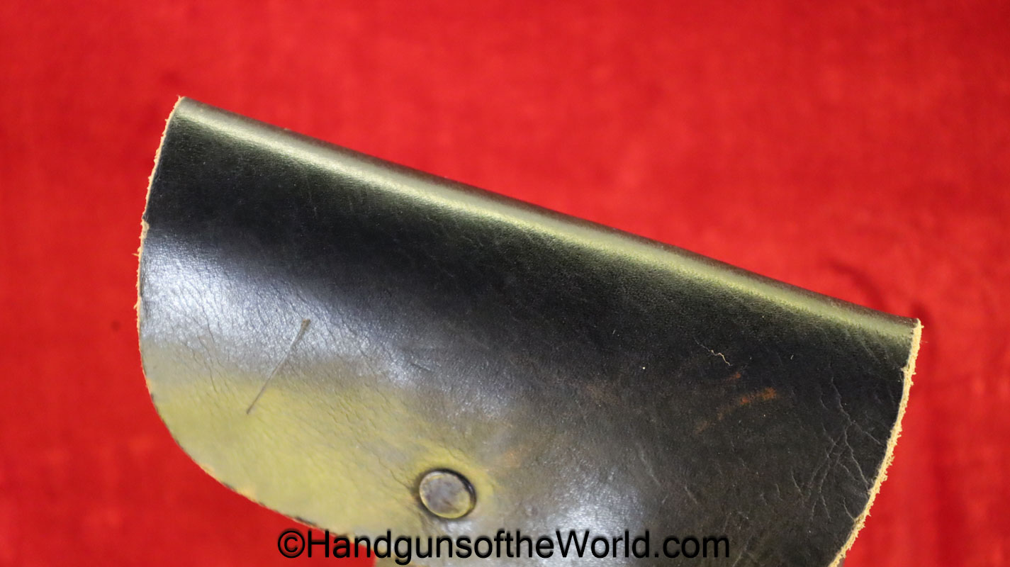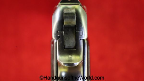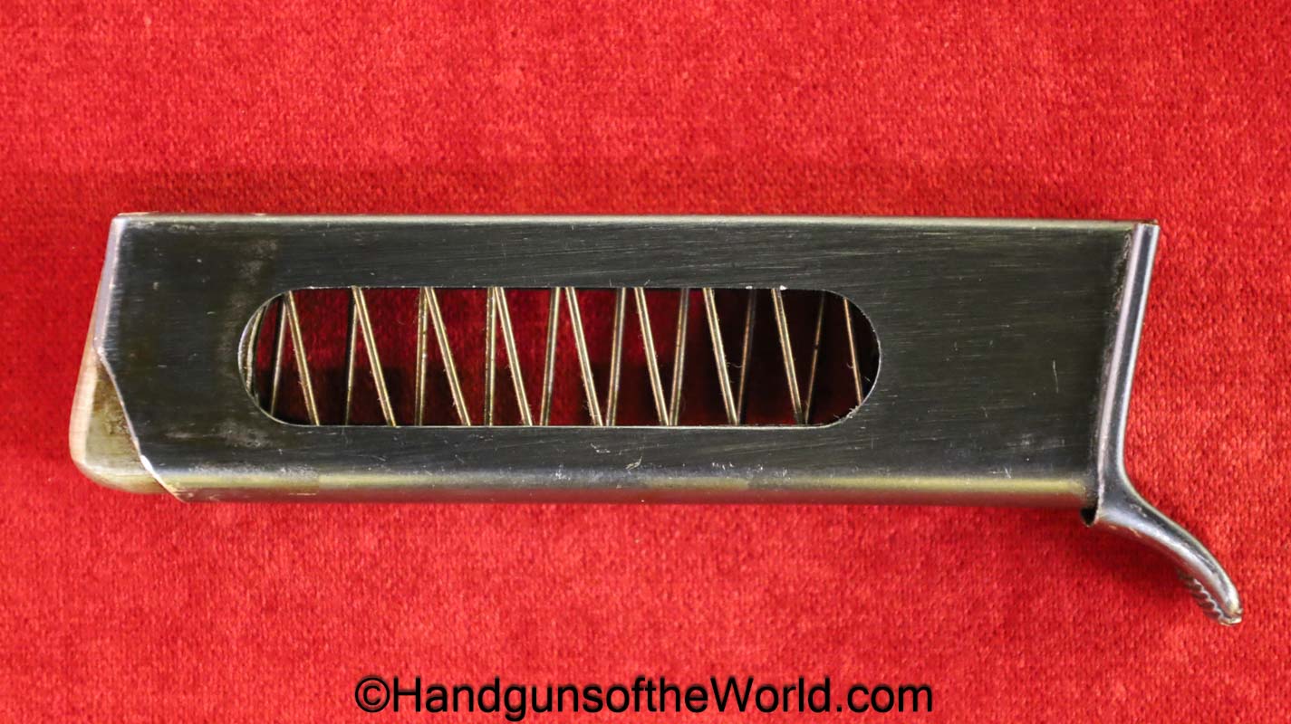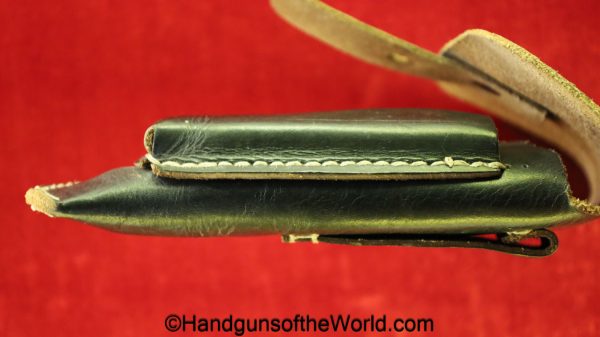 Beretta 1935, 7.65mm. This is Italian Proofed on the left rear tang, and has a blank slide, and black Bakelite grips. This has all matching numbers. The blue rates about 99% and the bore is excellent. This comes with a black leather CZ-27 holster with spurious German markings on the back.
