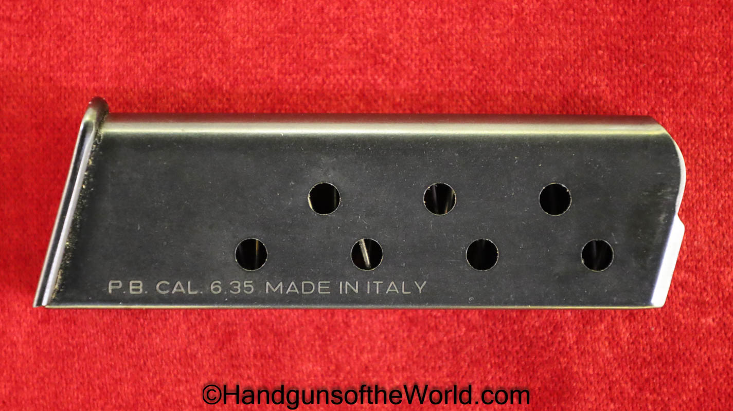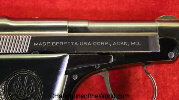 Beretta Model 20, .25 caliber. This tip up barrel pistol has the black plastic grips. The blue rates at 99+% and the bore is excellent.