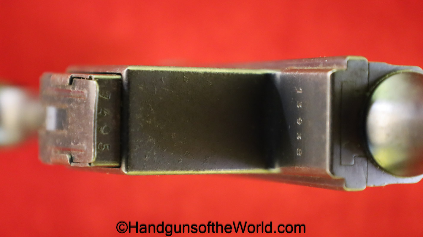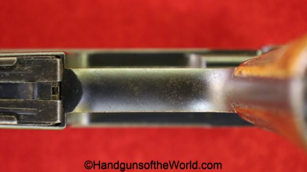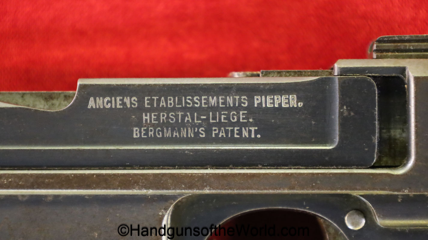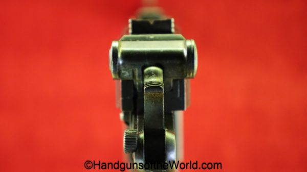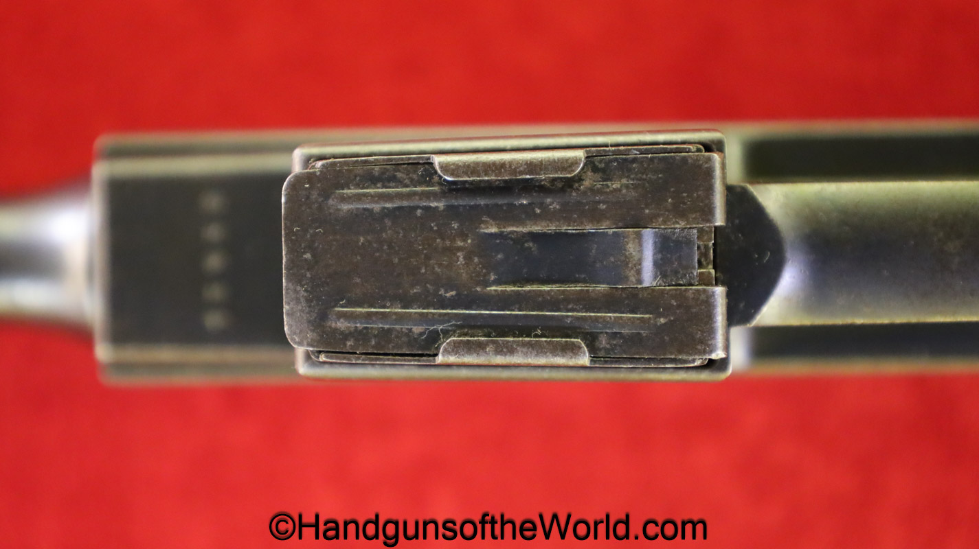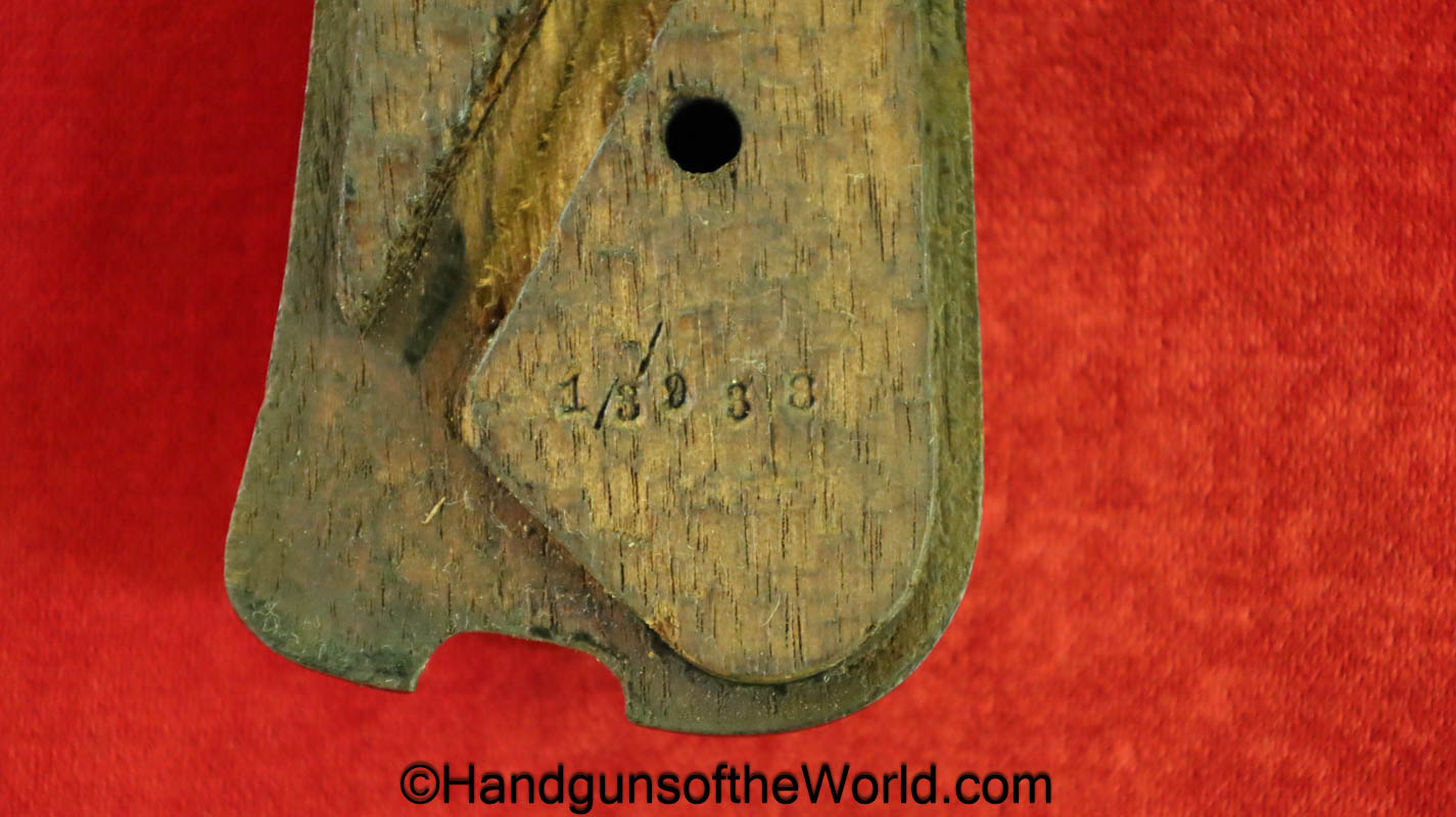 Bergmann Bayard 1908, 9mm. This has the proper checkered walnut grips. The blue rates about 60% and the bore is VG+. The magazine is from a 1910 era model.
