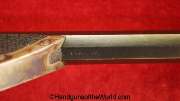 Bittner Model 1896 Repeater, or also known as an 1893 Model, but a misnomer in 7.7 Bittner caliber. This is Austrian Proof/dated 1881-98 under the barrel and has the Austrian Eagle on the chamber. This is marked “Patent Bittner-GB-W” logo on the right side of the frame. This has nice, checkered walnut grips and forearm. The blue rates about 99% on the barrel and this retains nearly all of the case colors, with minor loss on the grip straps. This has an excellent bore. Sorry-No clip is included. Antique.