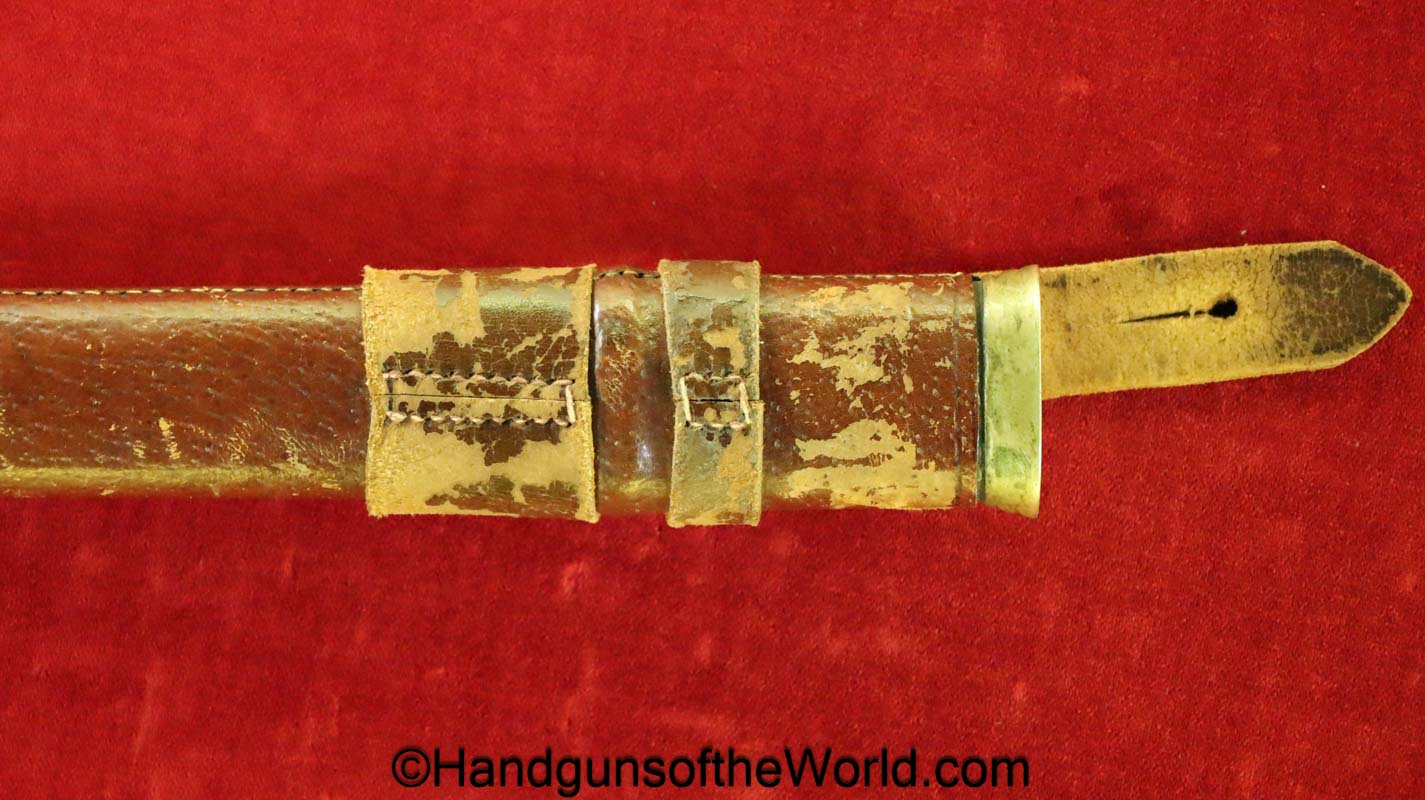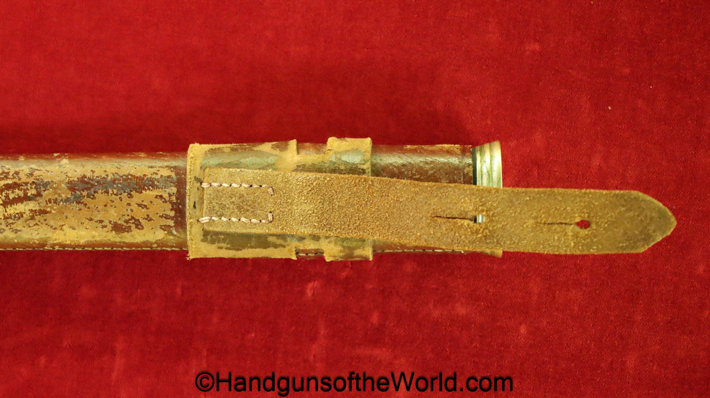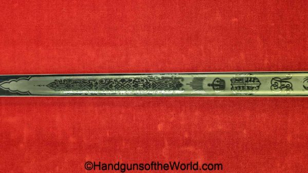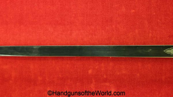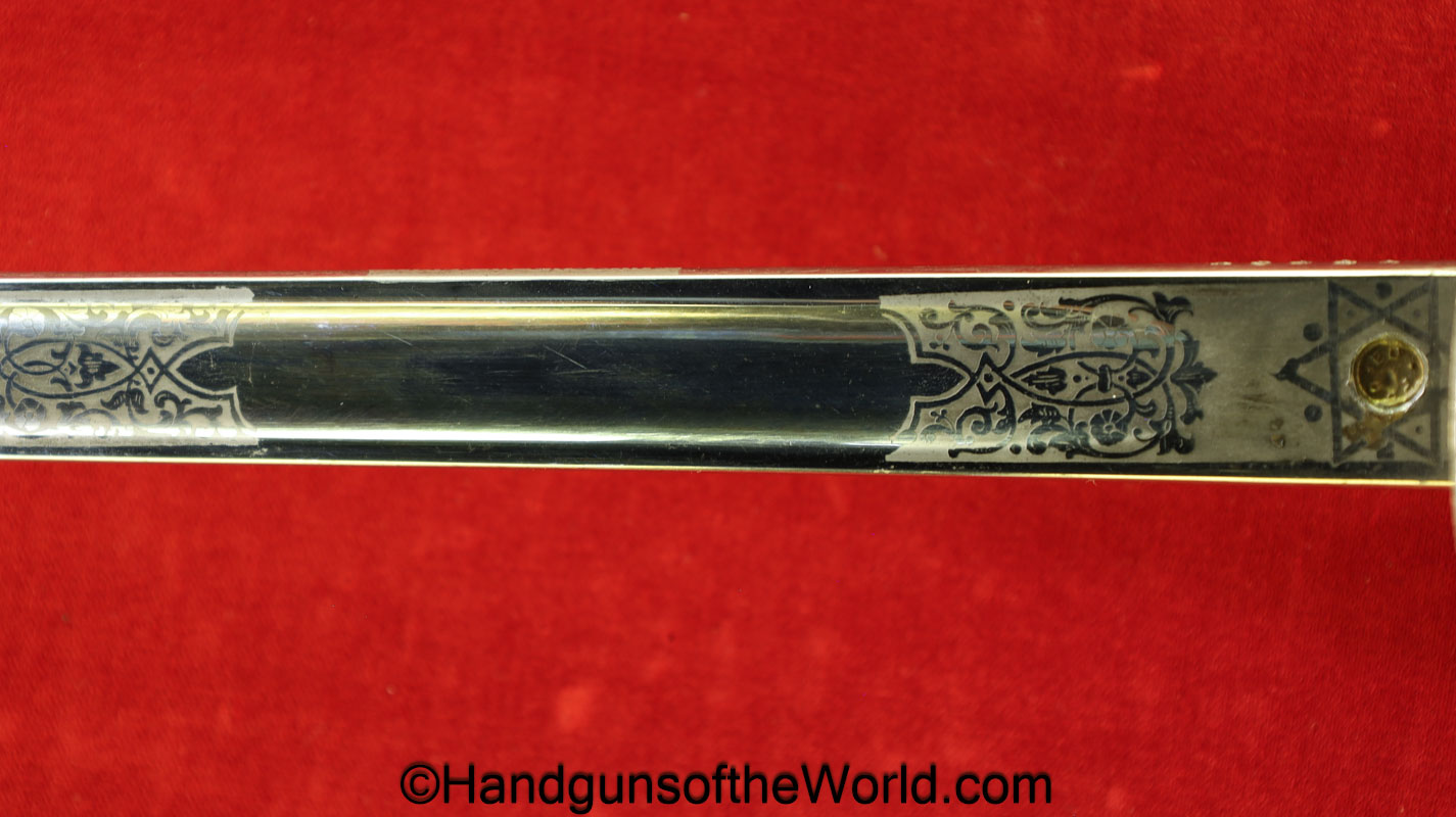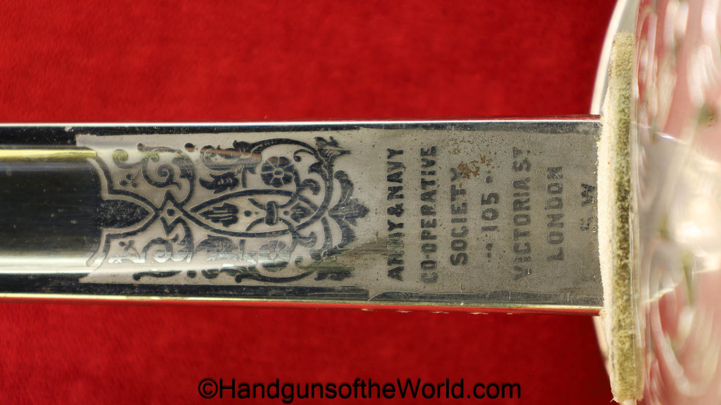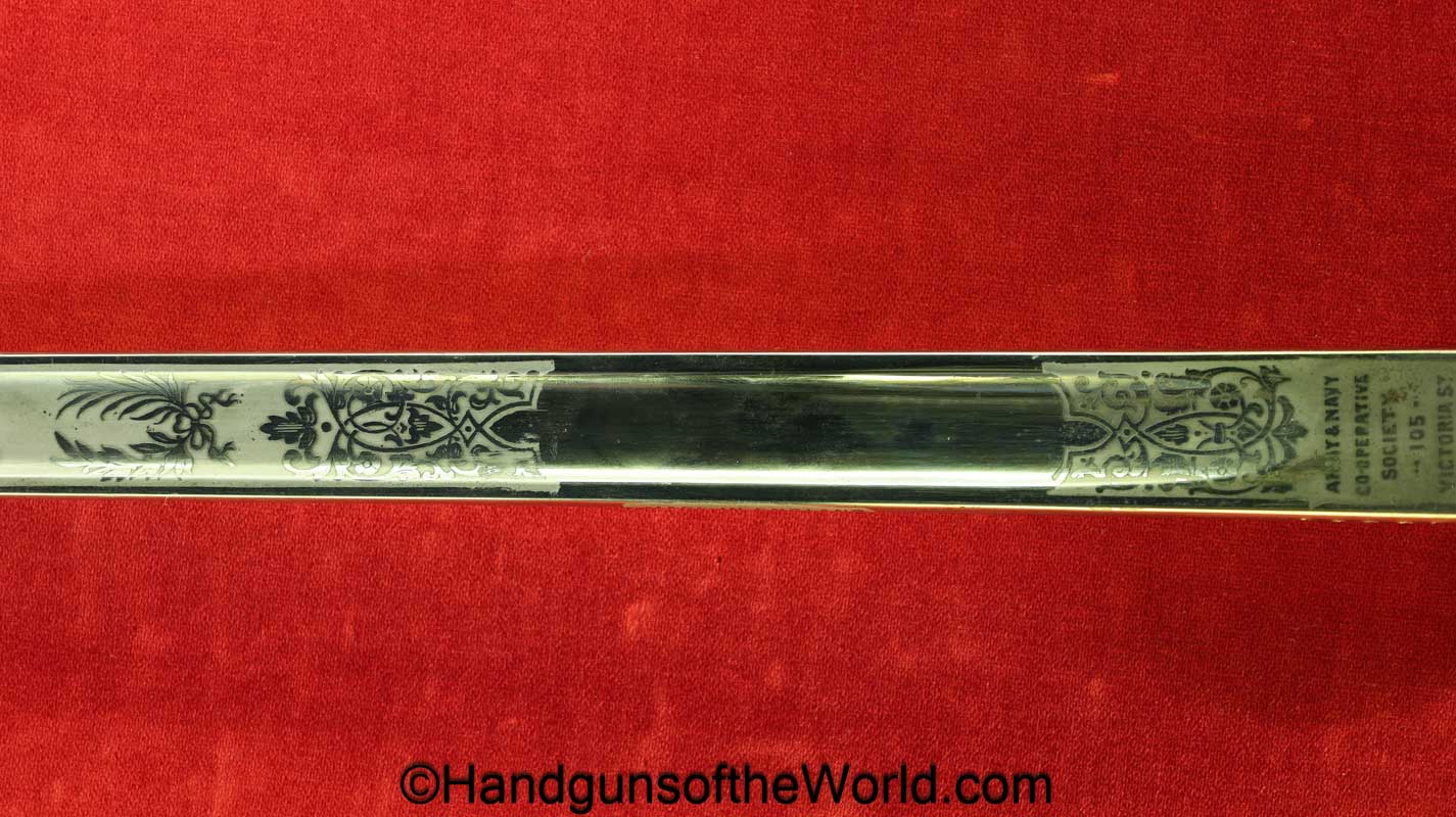 British Calvary Sword retailed by the Army & Navy Co-Operative Society. This has an etched blade and leather scabbard. Overall Excellent.