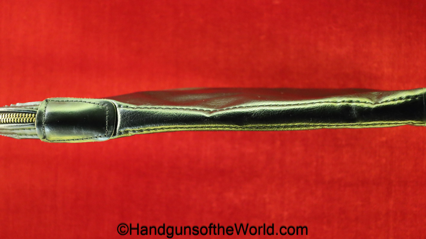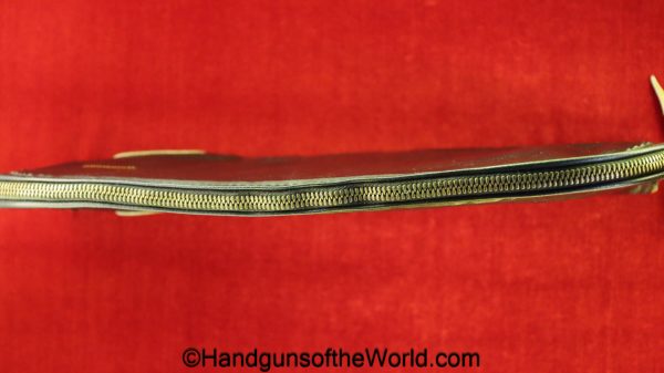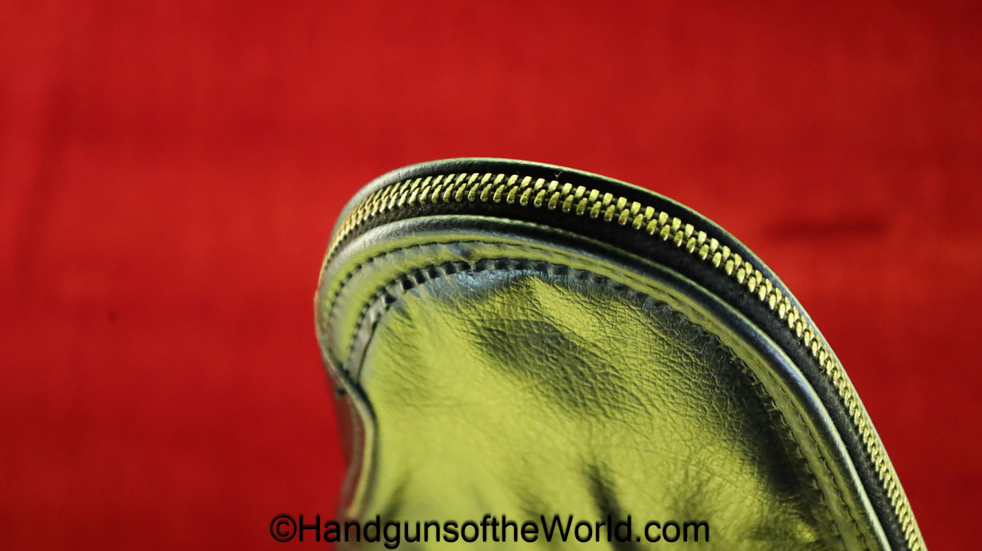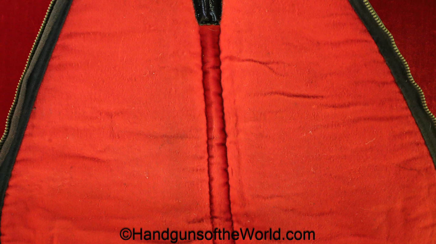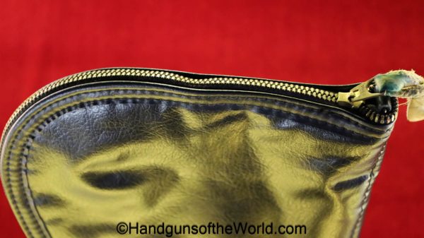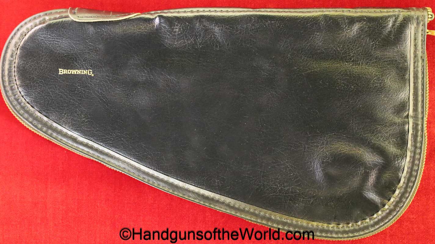Original Browning Challenger Pistol Pouch. This is black vinyl with a red felt lining for the 6 1/2″ barrel models. This is marked Browning on the side. Overall VG++.