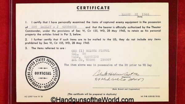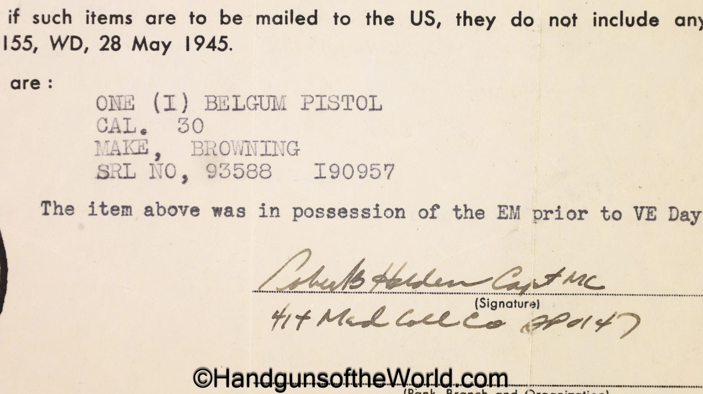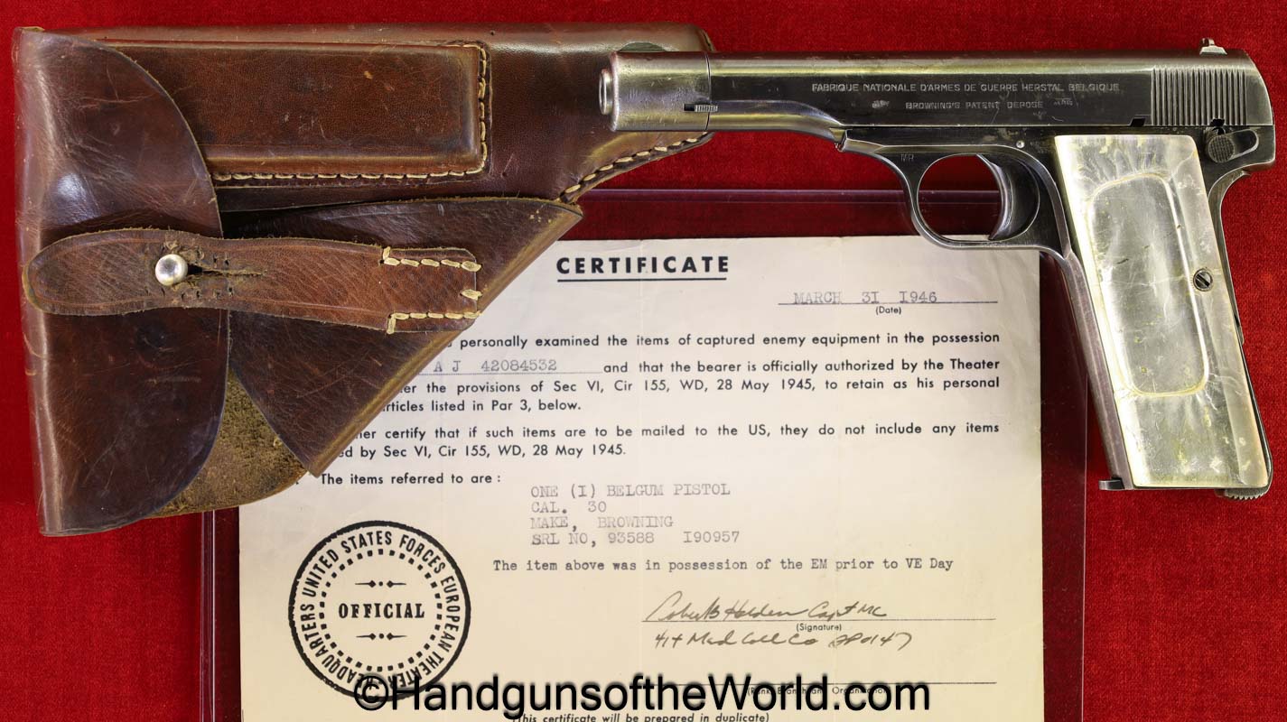 Browning FN 1922, 7.65mm, German WWII Issue with Holster and Capture Paper