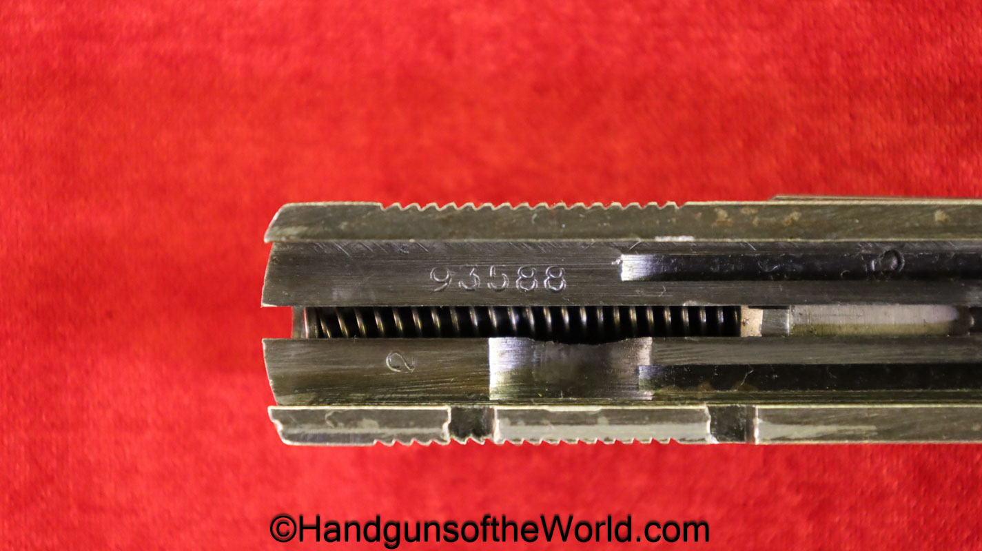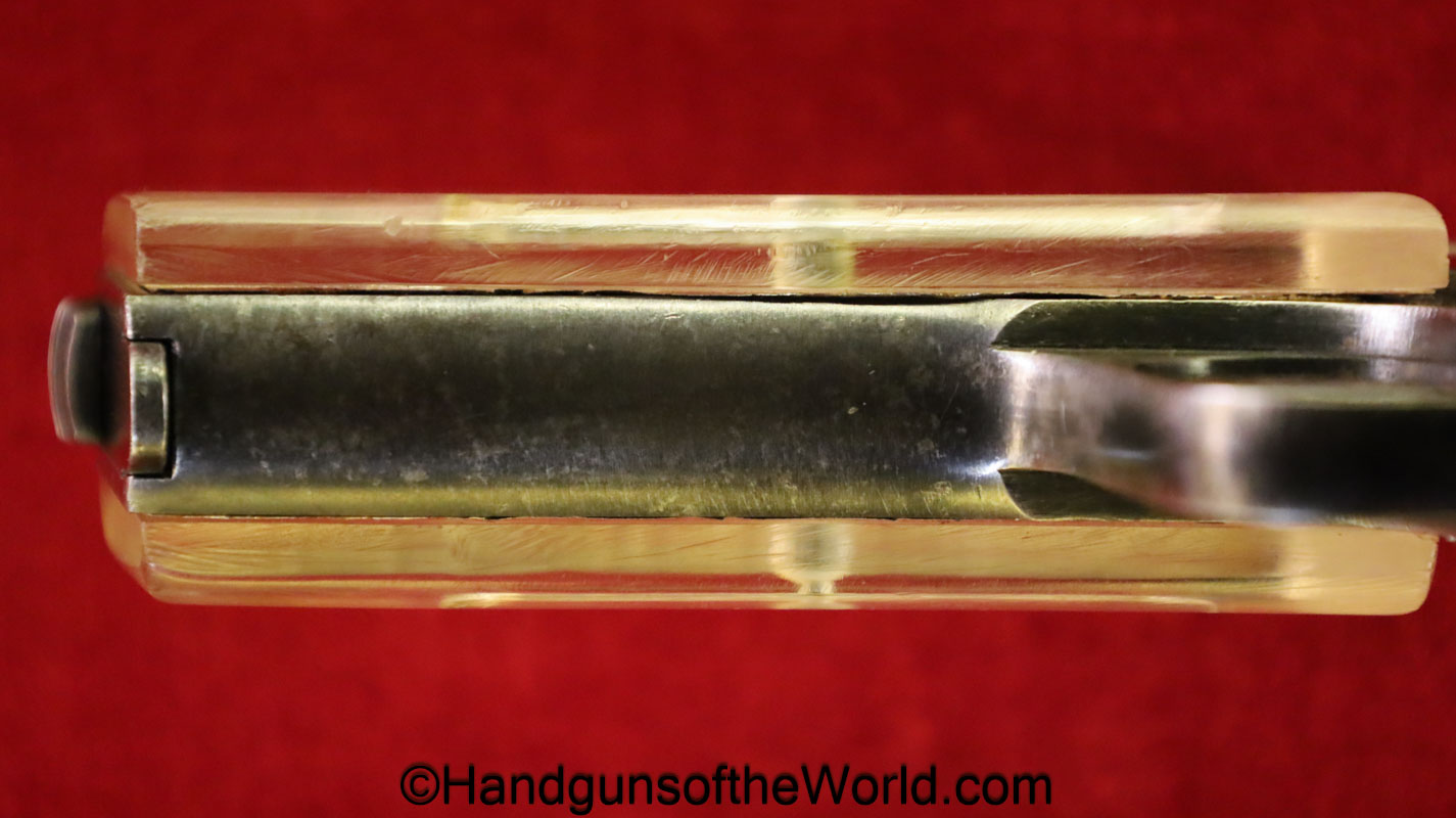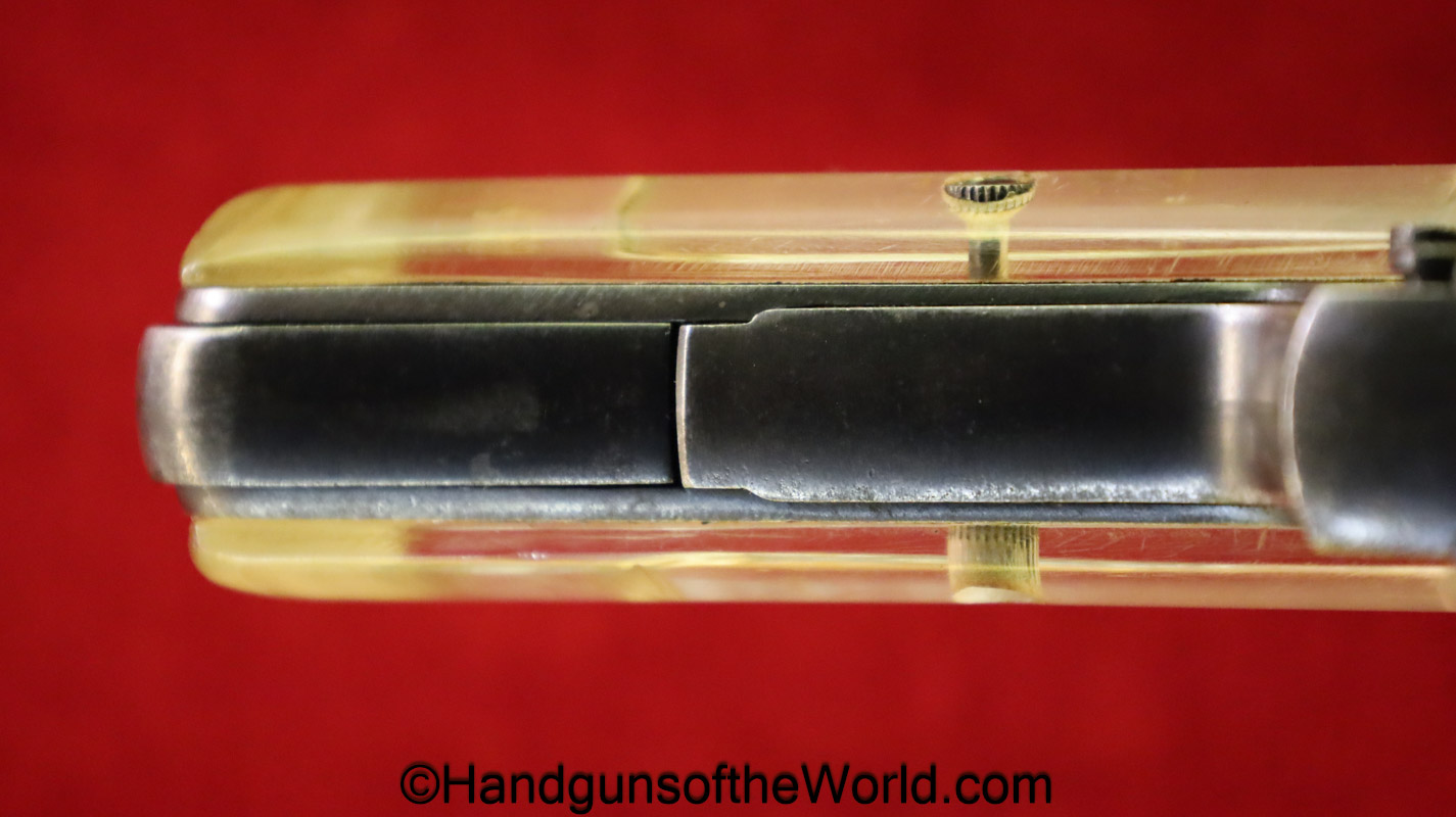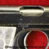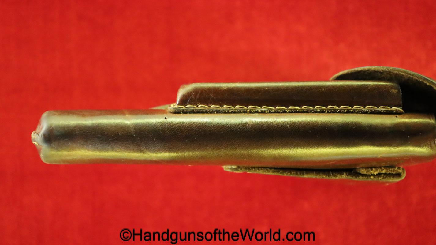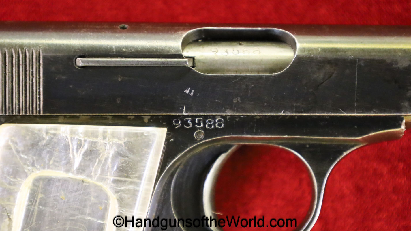 FN Browning 1922, 7.65mm. This is German WWII WaA140 proofed overall, and has GI added aircraft windshield grips with foils backing to simulate pearl. This has all matching numbers, but for the recoil spring retainer, which is from a different pistol. Interesting to note that on the included capture paper, both numbers are noted. This retains about 80% blue and the bore is excellent. This includes an unmarked brown leather breakaway holster.