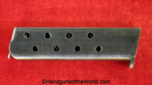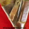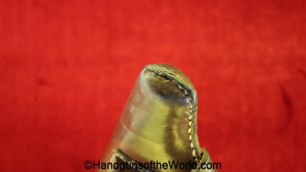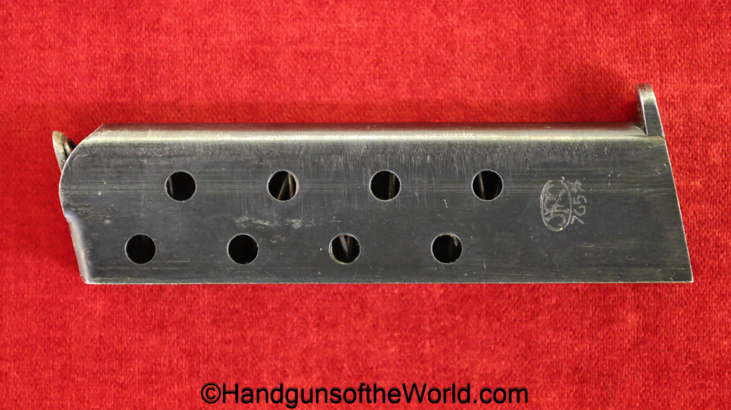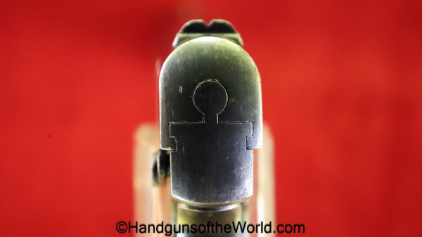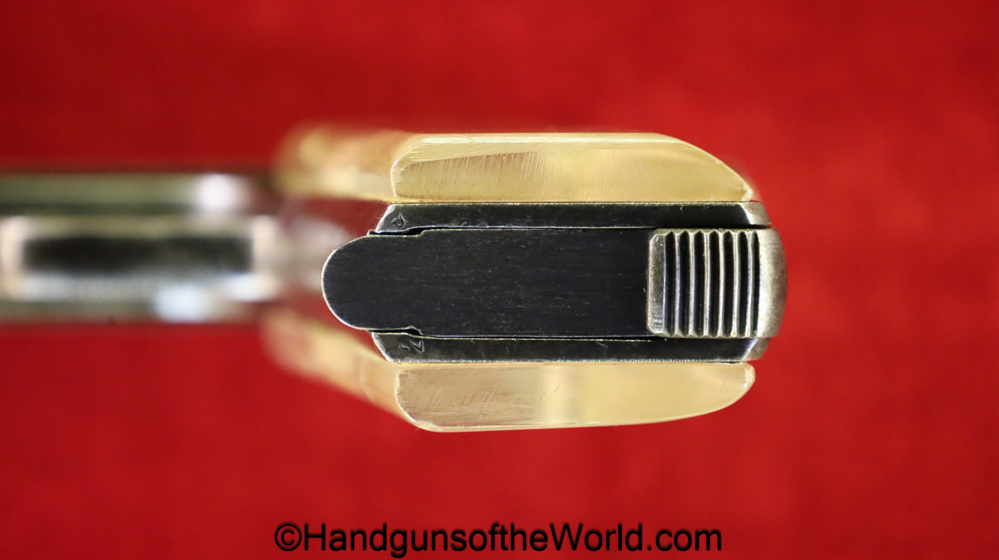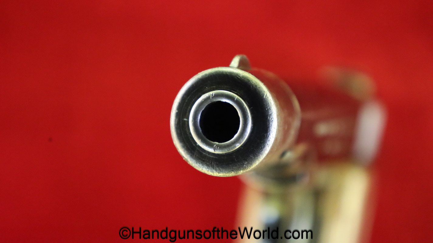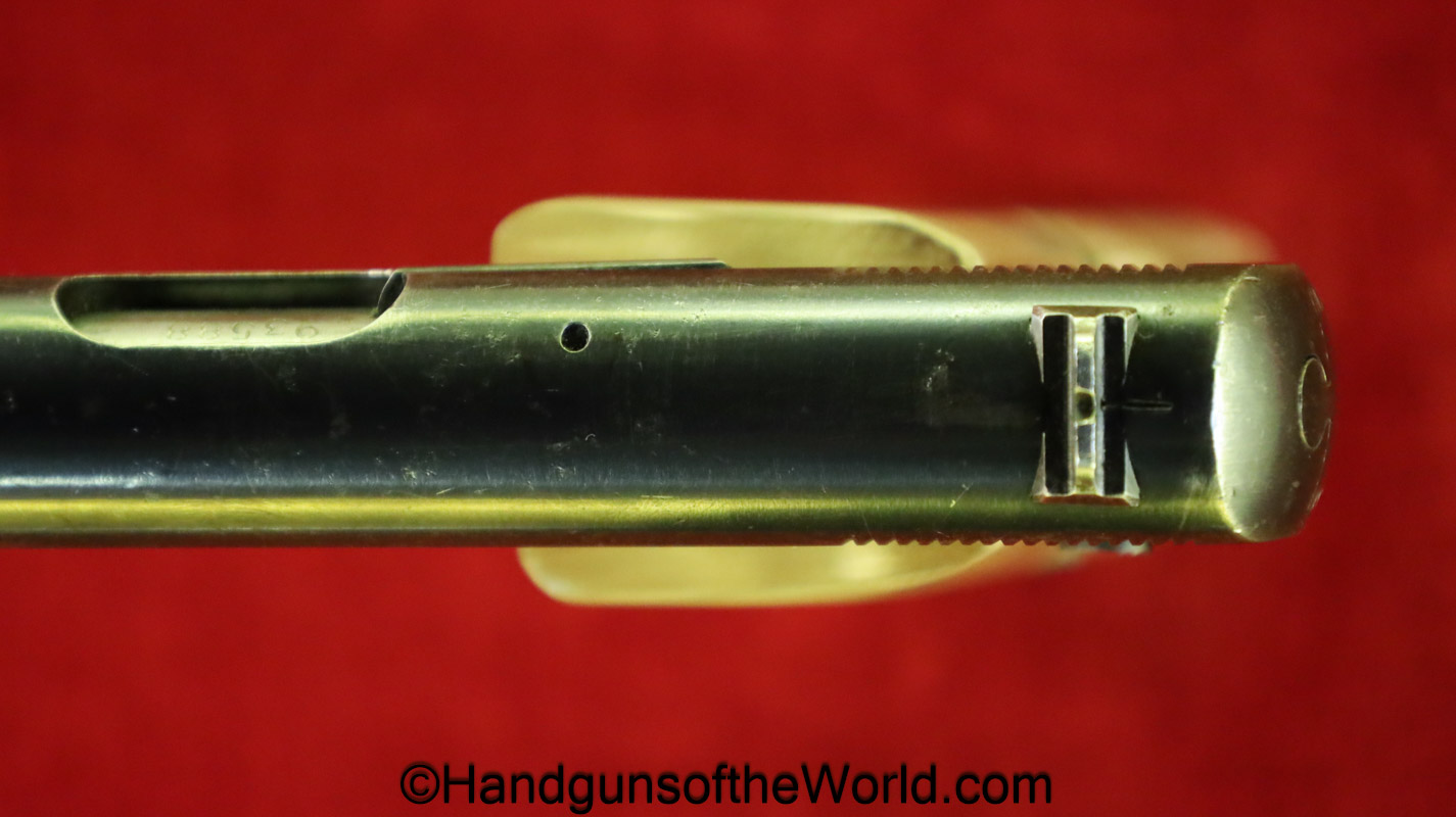 FN Browning 1922, 7.65mm. This is German WWII WaA140 proofed overall, and has GI added aircraft windshield grips with foils backing to simulate pearl. This has all matching numbers, but for the recoil spring retainer, which is from a different pistol. Interesting to note that on the included capture paper, both numbers are noted. This retains about 80% blue and the bore is excellent. This includes an unmarked brown leather breakaway holster.