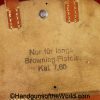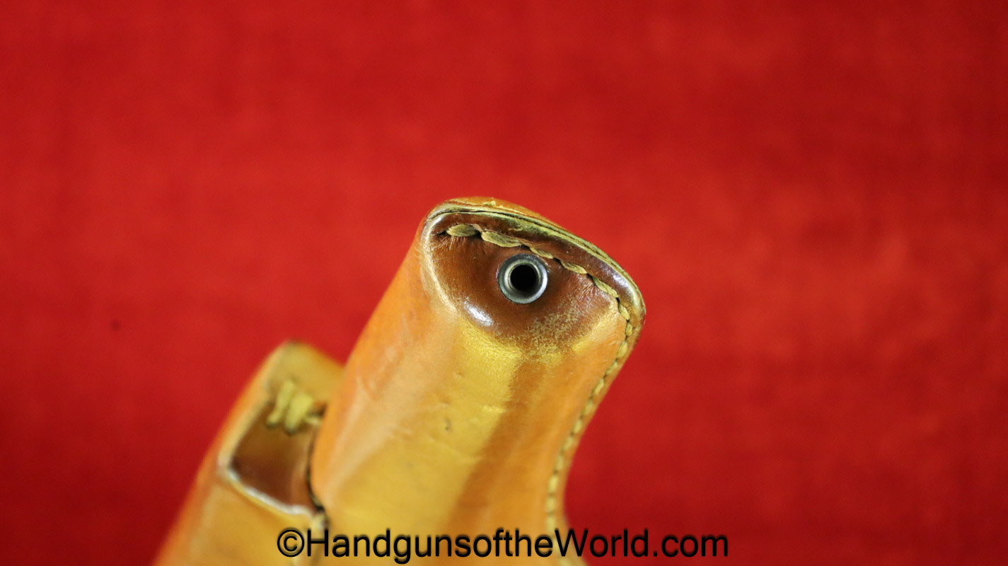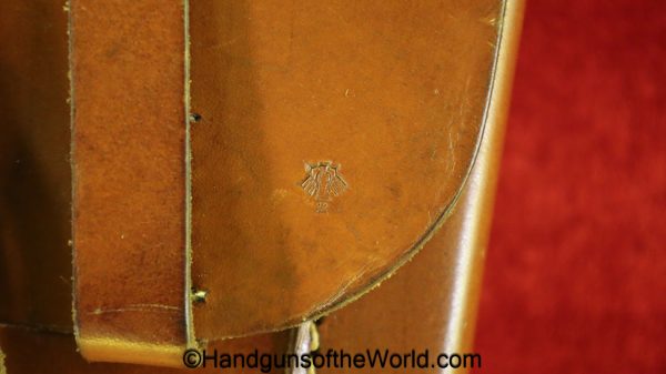 Original Browning FN 1922 Pistol Holster. This is a brown leather, Theuermann dropping pattern, with a German WWII Luftwaffe Eagle 2 proof on the front. This is maker marked & Nur fur Lange-Browning Pistole-Kal 7.65 ink stamped inside the lid. There are 2 small pin holes in the font flap, otherwise VG+.