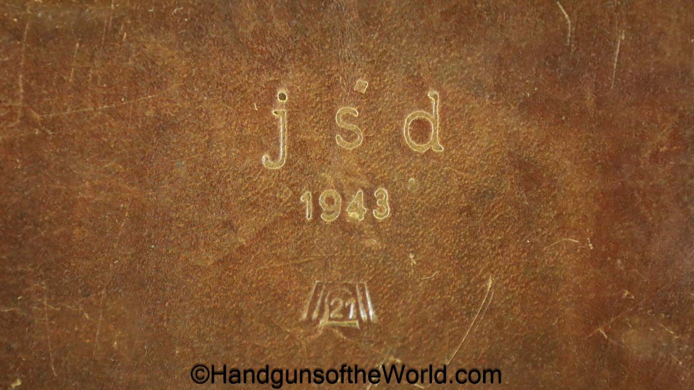 Original Browning FN 1922 Pistol Holster. This is a brown leather, Theuermann dropping pattern, with a German WWII JSD 1943-Luftwaffe Eagle 21 proof on the front. This is ink stamped Nur fur Lange-Browning Pistole-Kal 7.65 inside the lid. Overall VG-VG+.