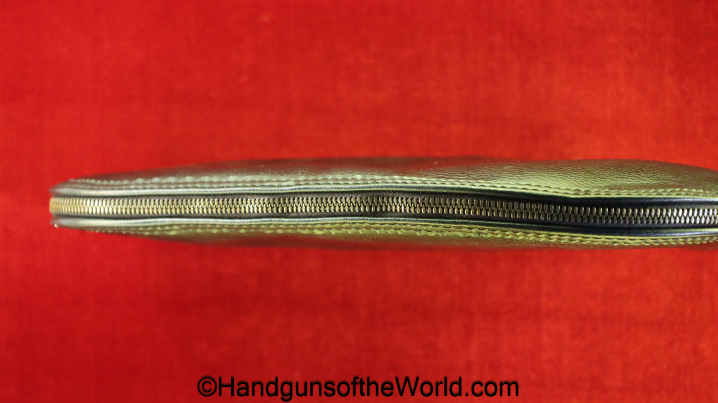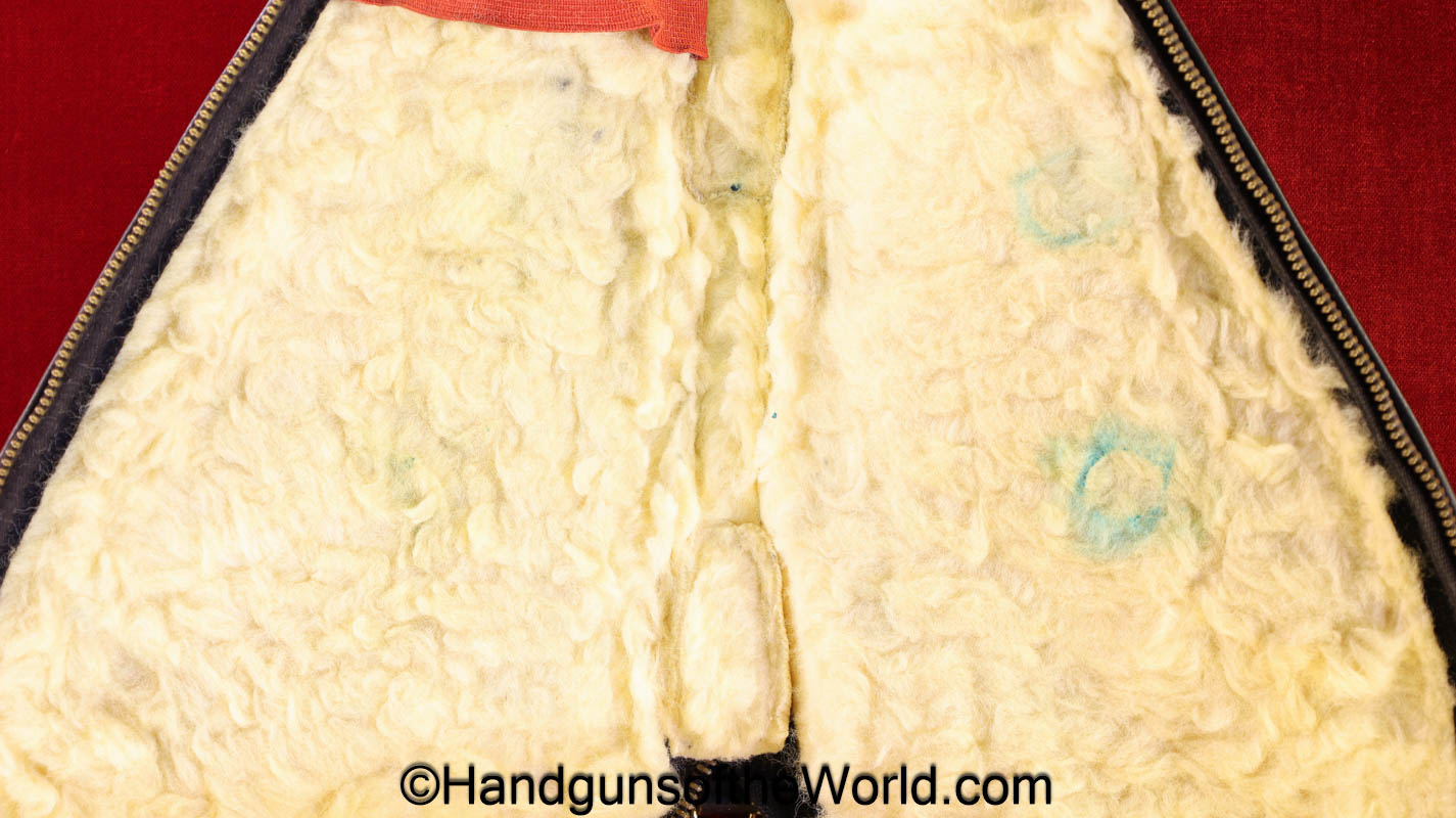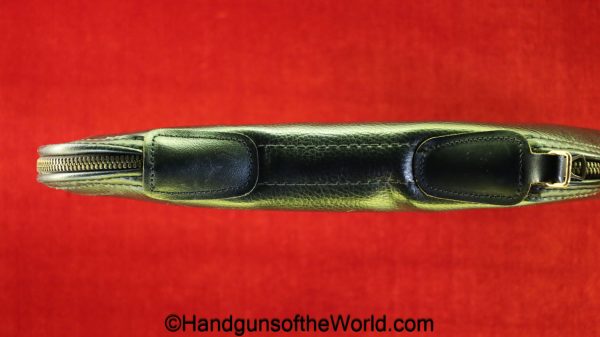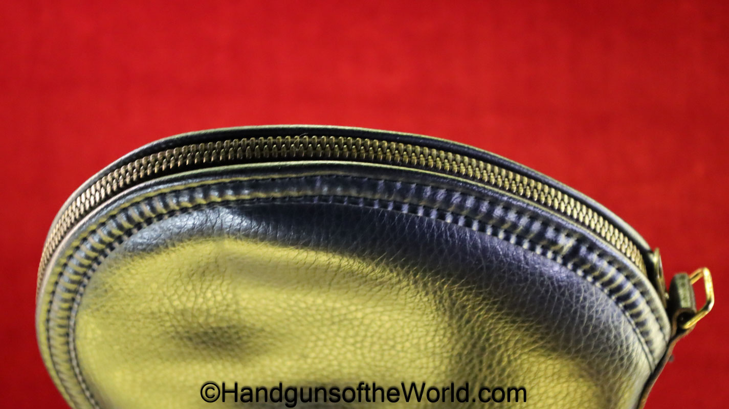 Original Browning Nomad Pistol Pouch. This is black vinyl with ivory fleece lining for the 4″ barrel models. This is marked Browning on the side. Overall VG++.