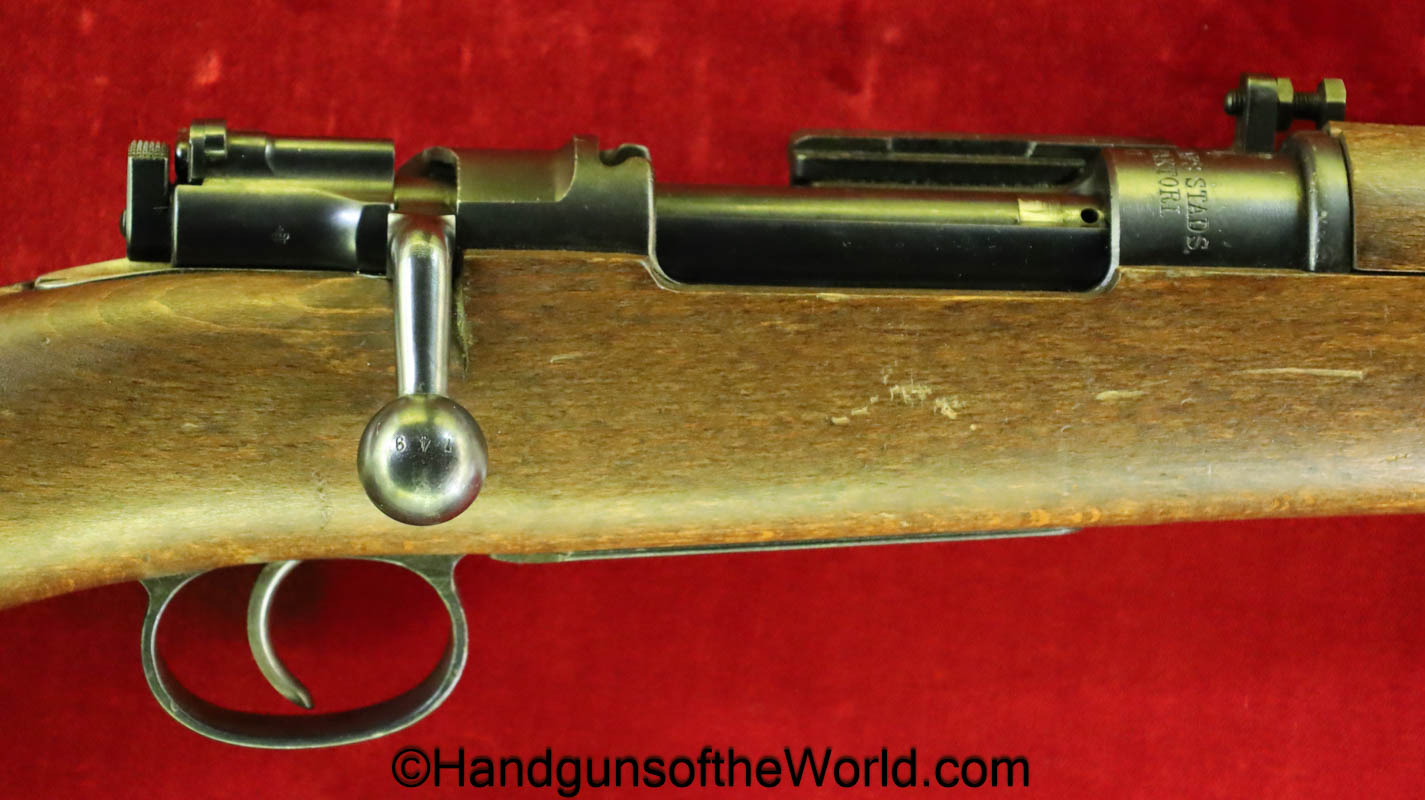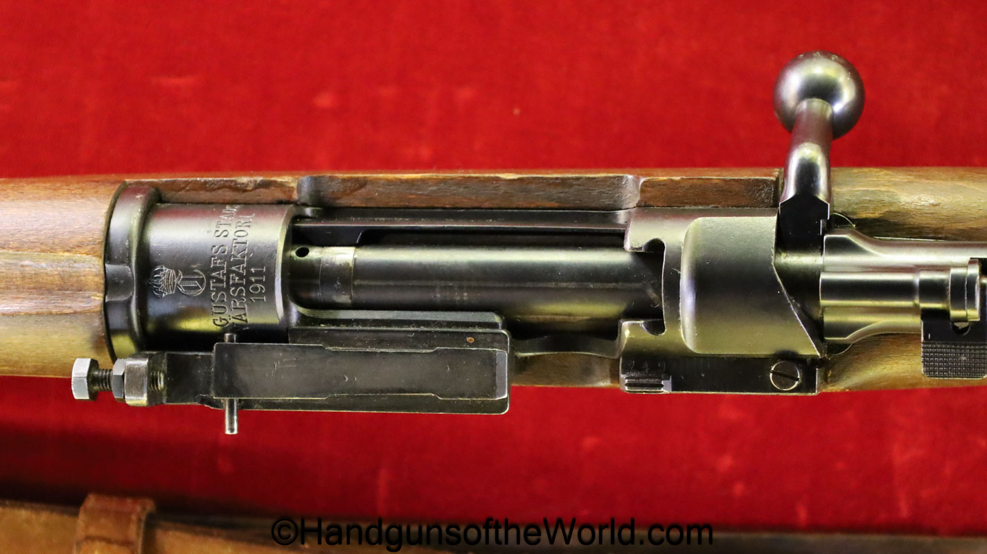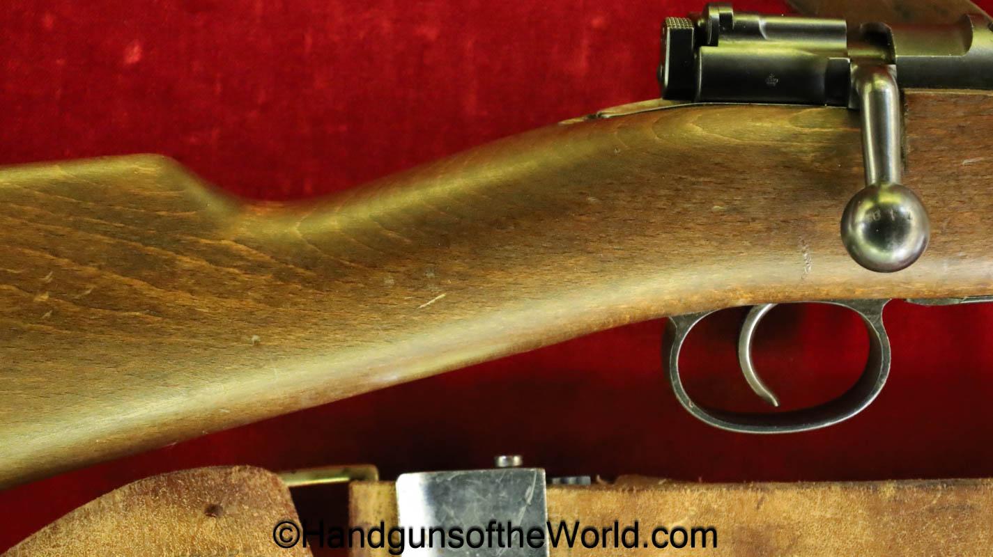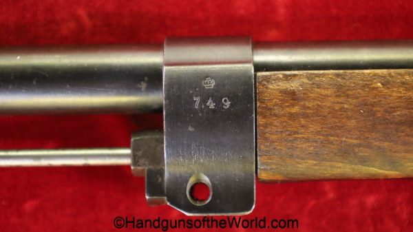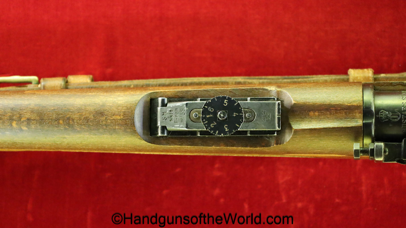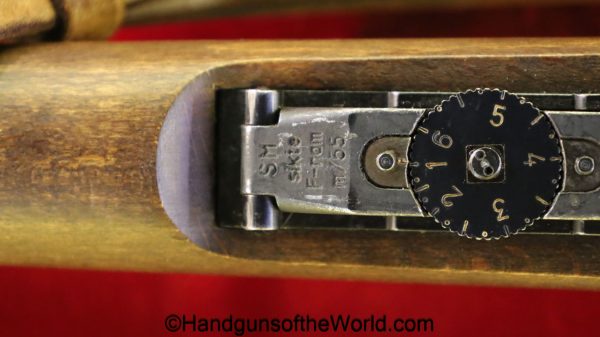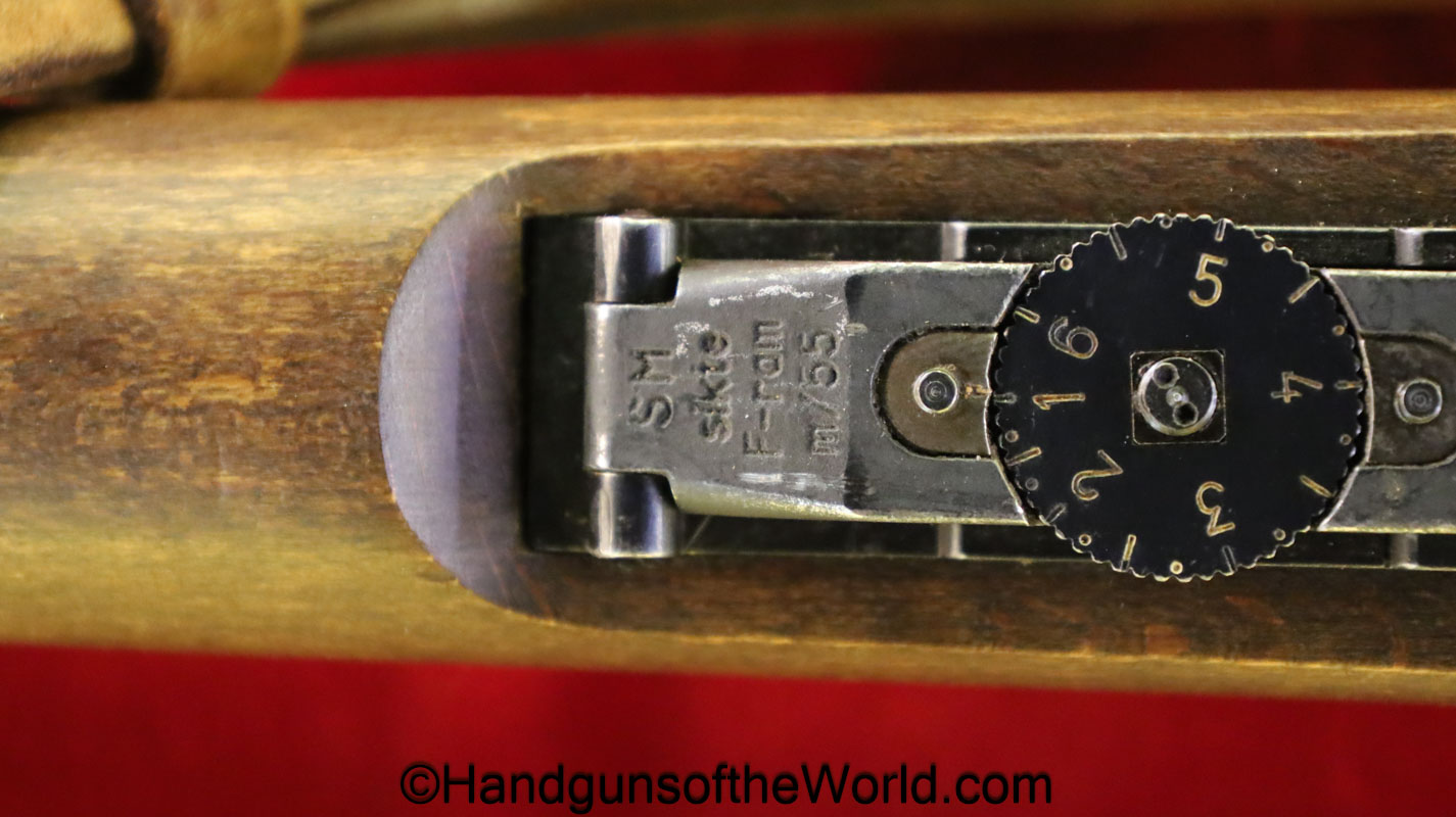Carl Gustafs Swedish M41B, 6.5mm. This sniper is an arsenal conversion from an M96 Rifle, and is chamber dated 1911. This has a matching Ajack 4×90 scope mount, dated 1942. This has an excellent wooden stock, with an import mark on the barrel, and all matching serial numbers. The blue rates about 98% and the bore is excellent. Included will be the proper matching aluminum scope can with shoulder straps, a scope cover, sling and cleaning rod.