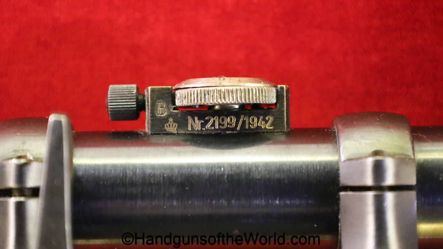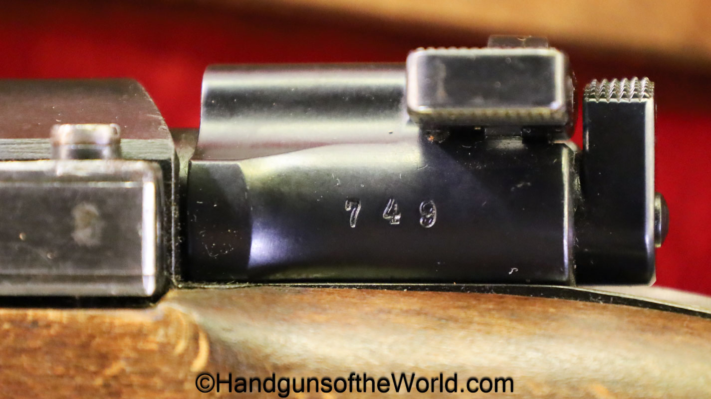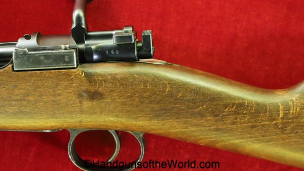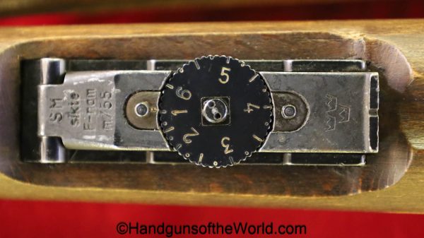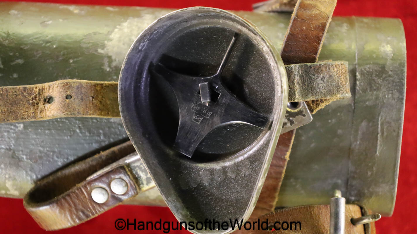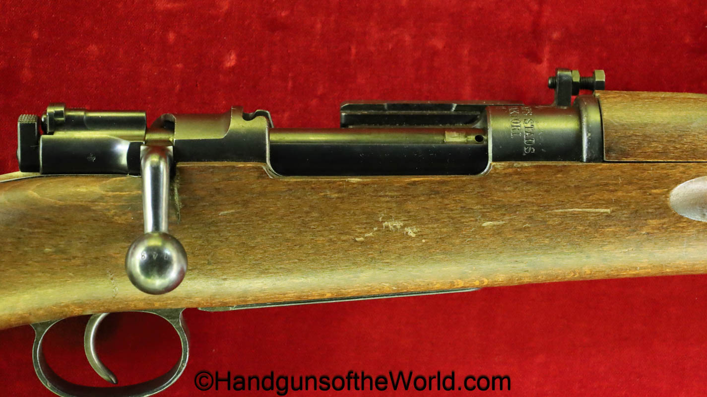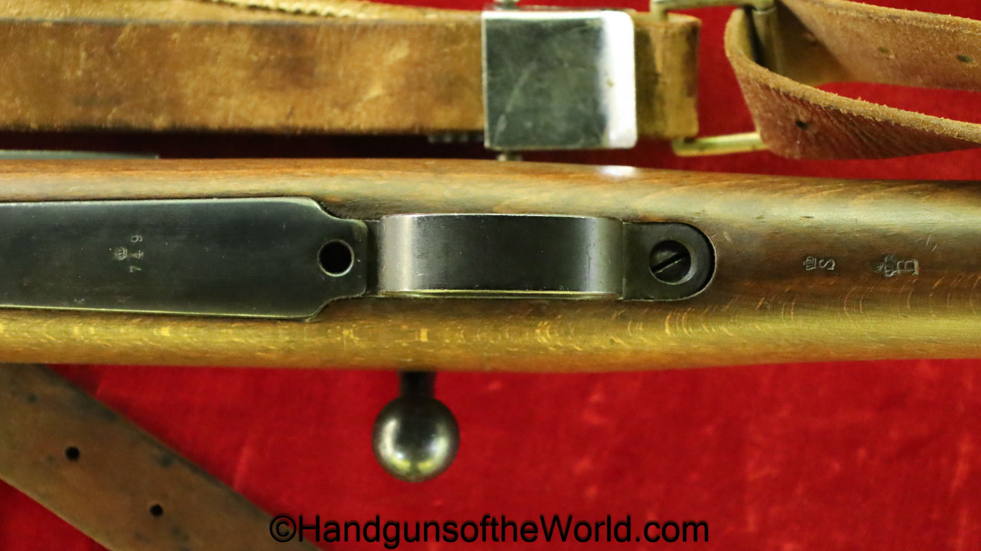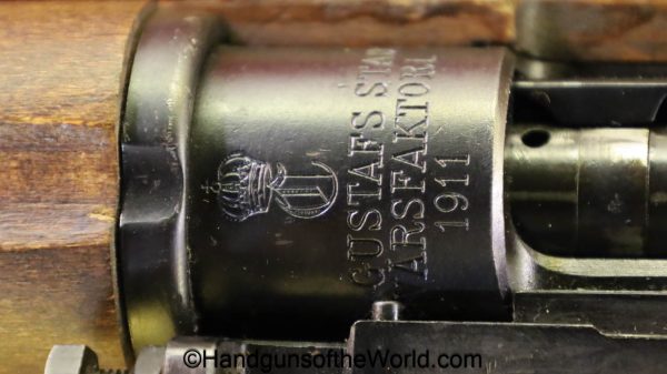 Carl Gustafs Swedish M41B, 6.5mm. This sniper is an arsenal conversion from an M96 Rifle, and is chamber dated 1911. This has a matching Ajack 4×90 scope mount, dated 1942. This has an excellent wooden stock, with an import mark on the barrel, and all matching serial numbers. The blue rates about 98% and the bore is excellent. Included will be the proper matching aluminum scope can with shoulder straps, a scope cover, sling and cleaning rod.