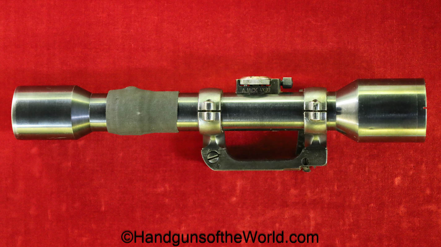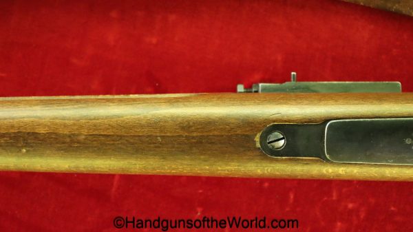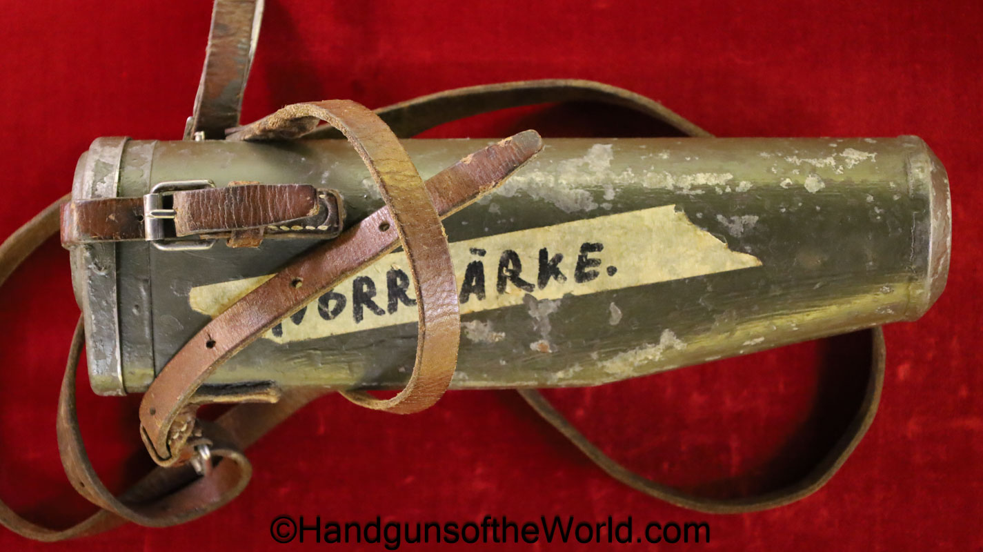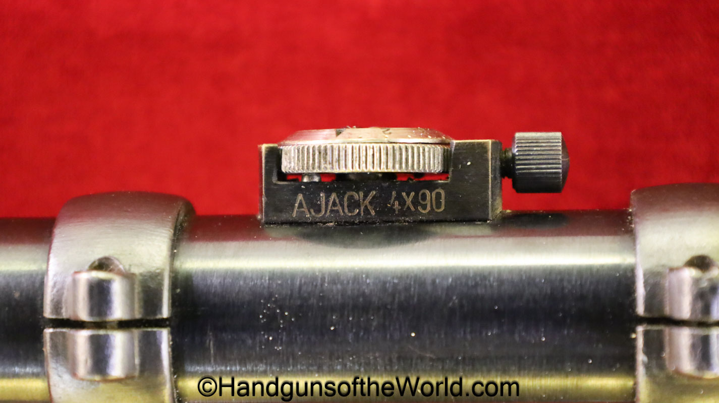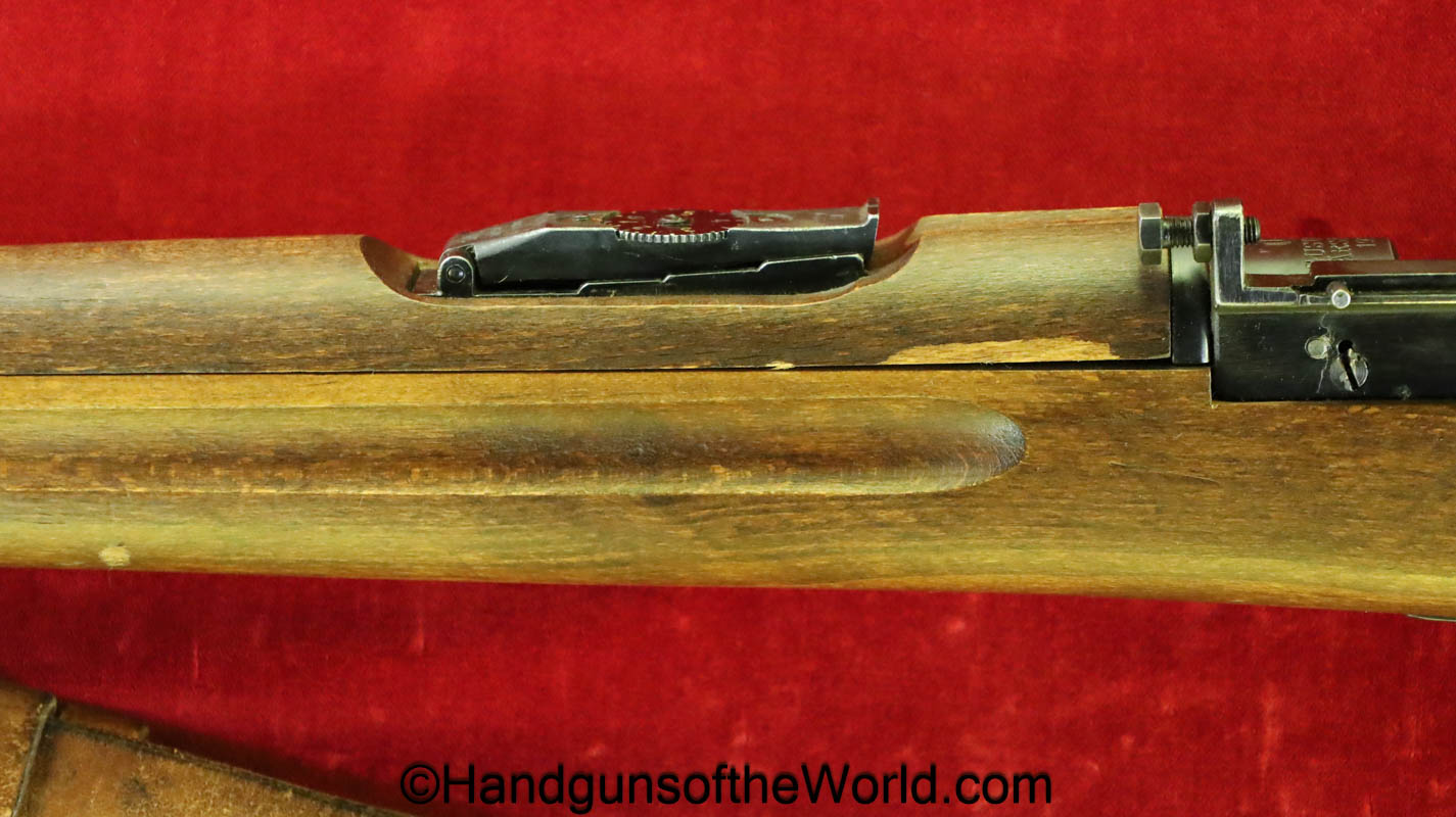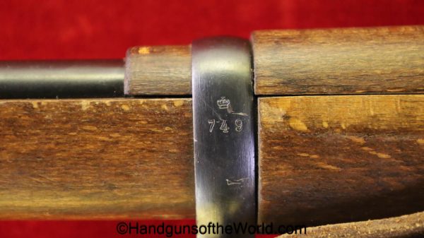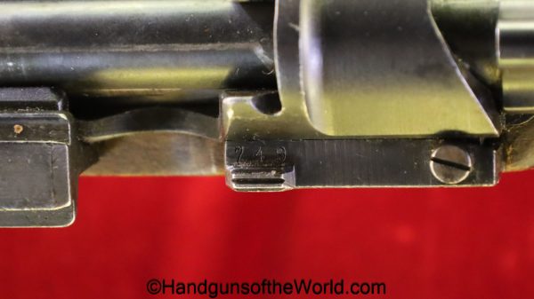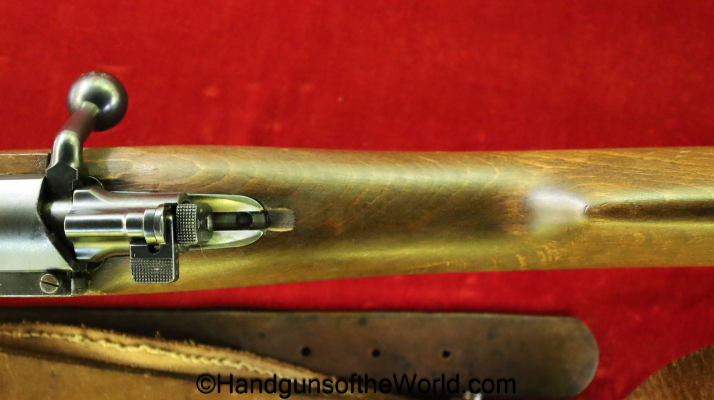 Carl Gustafs Swedish M41B, 6.5mm. This sniper is an arsenal conversion from an M96 Rifle, and is chamber dated 1911. This has a matching Ajack 4×90 scope mount, dated 1942. This has an excellent wooden stock, with an import mark on the barrel, and all matching serial numbers. The blue rates about 98% and the bore is excellent. Included will be the proper matching aluminum scope can with shoulder straps, a scope cover, sling and cleaning rod.