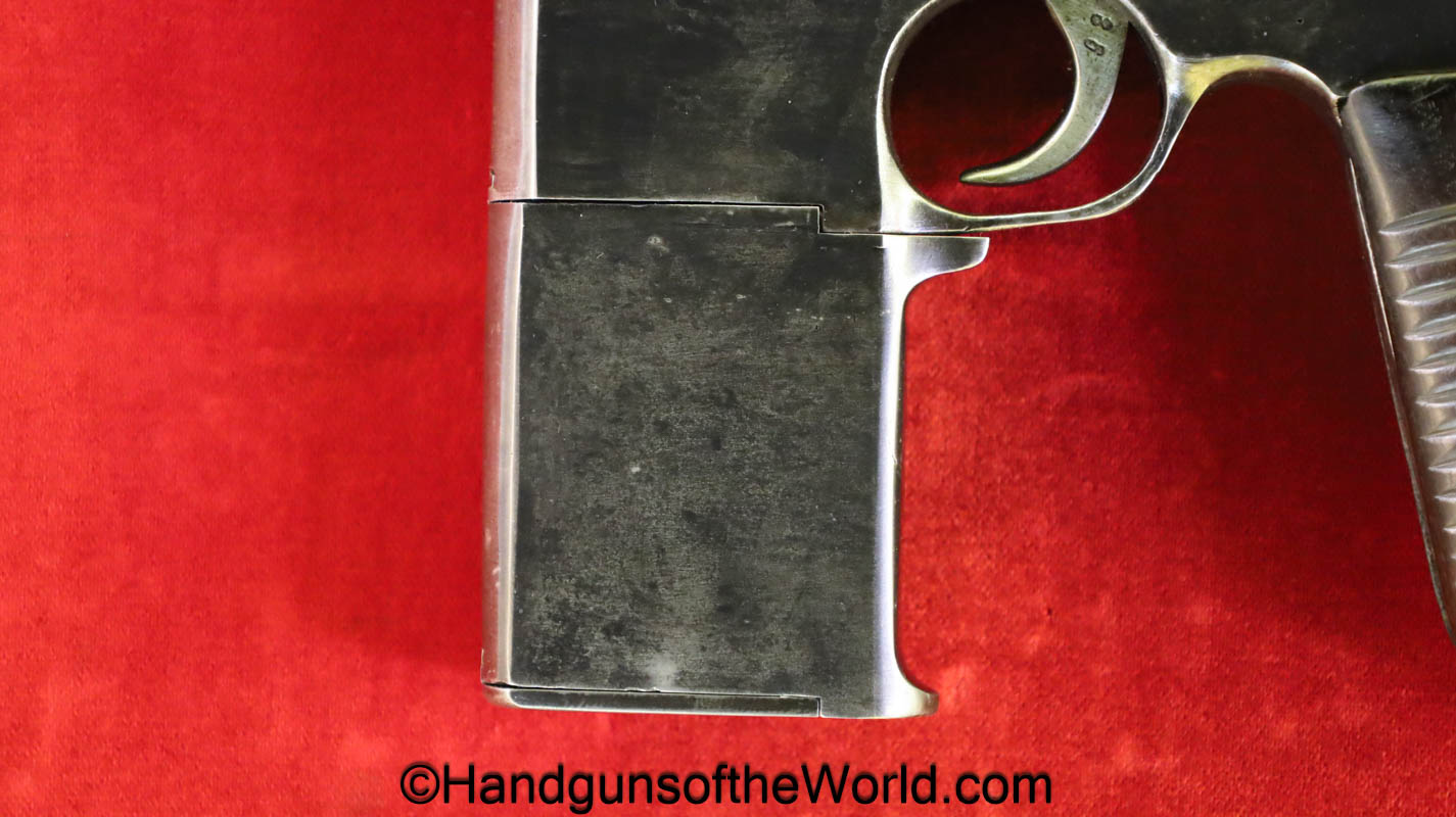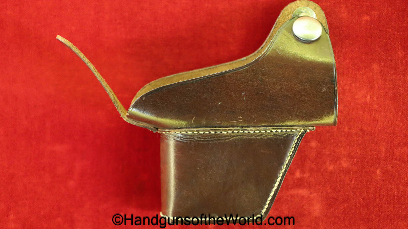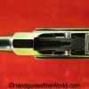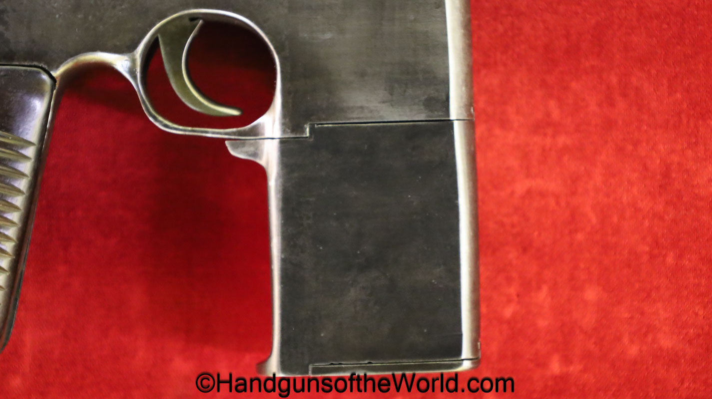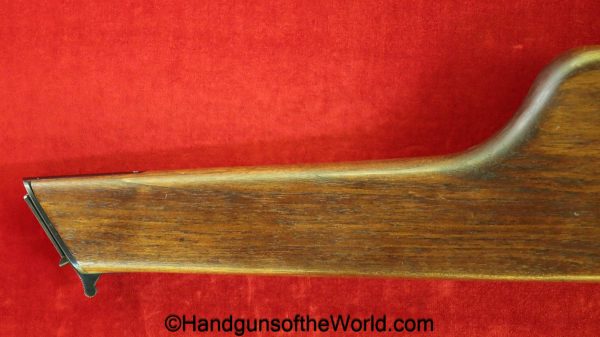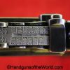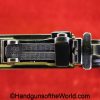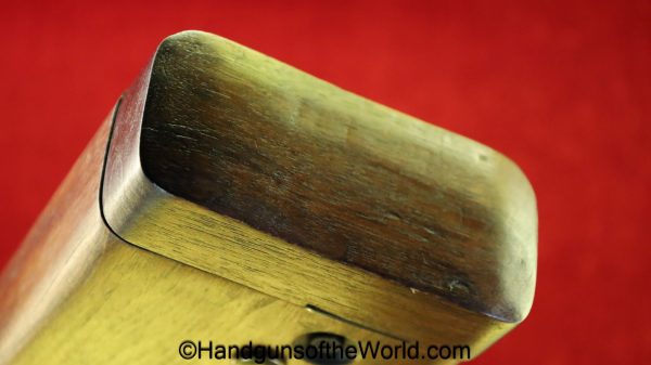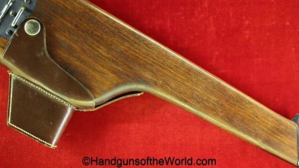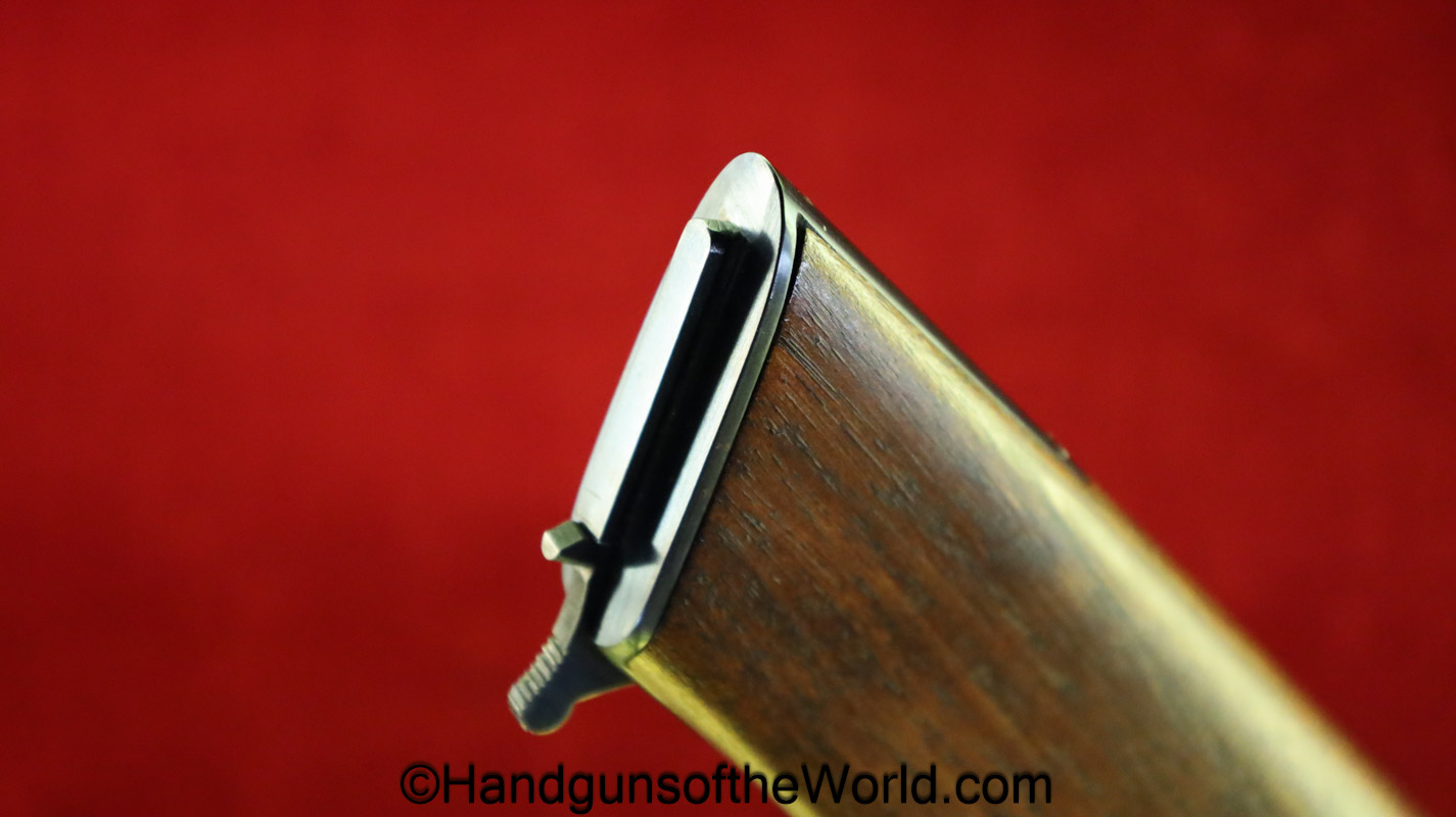 Chinese 1896 Broomhandle, 7.63mm. This is a flat side pattern with a large ring hammer. This appears to be an old, non factory conversion to 20 shot. This has new made lined walnut grips. This has 99% of an old refinish and a Vg-VG+ bore. This comes with a Chinese Pattern wooden holster shoulder stock converted to accept the 20 shot magazine with a leather boot for the extension. This will need some help mechanically, as the follower does not rise to the chamber.