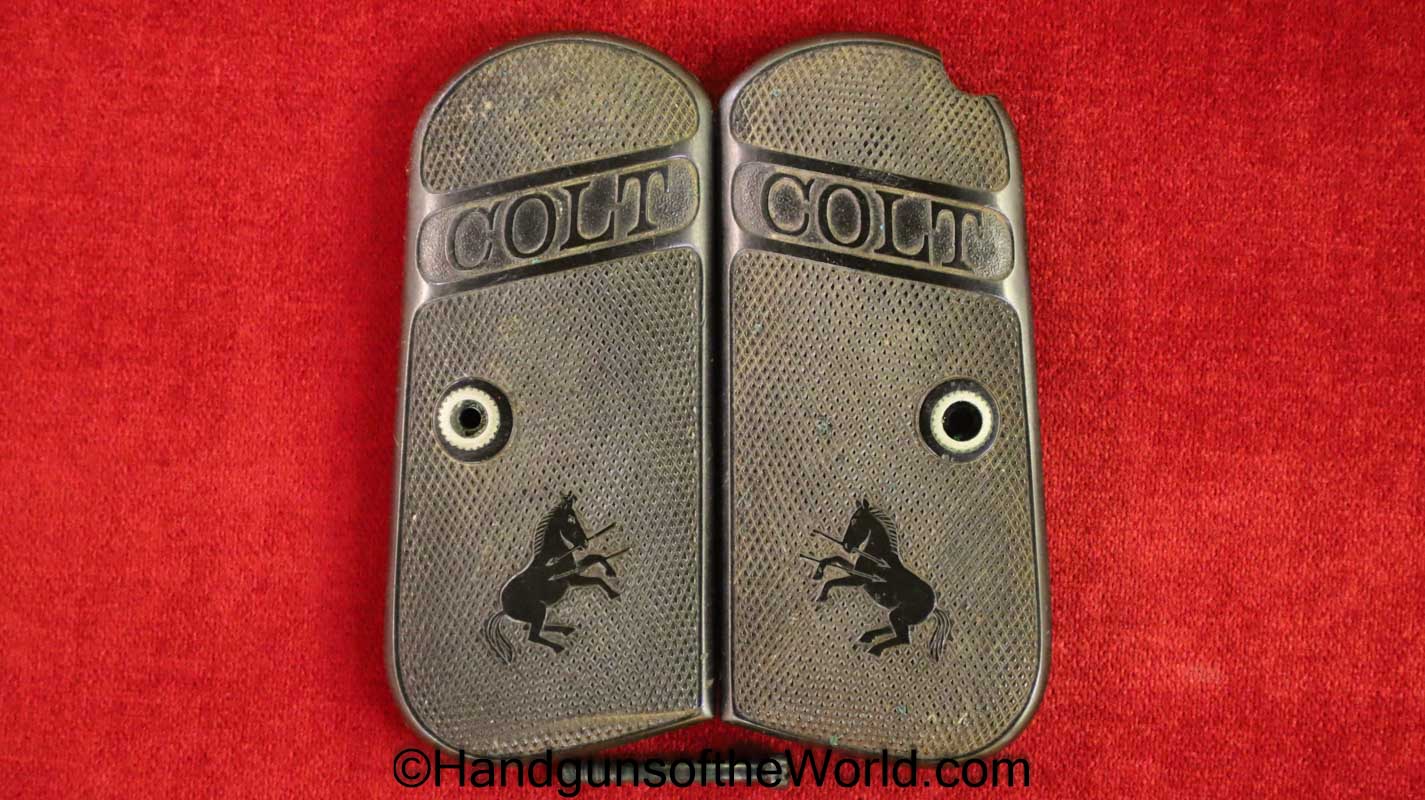 Original Colt 1903-1908 Pistol Grips. These are hard rubber with a scratch on 1 side. Otherwise VG++.