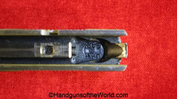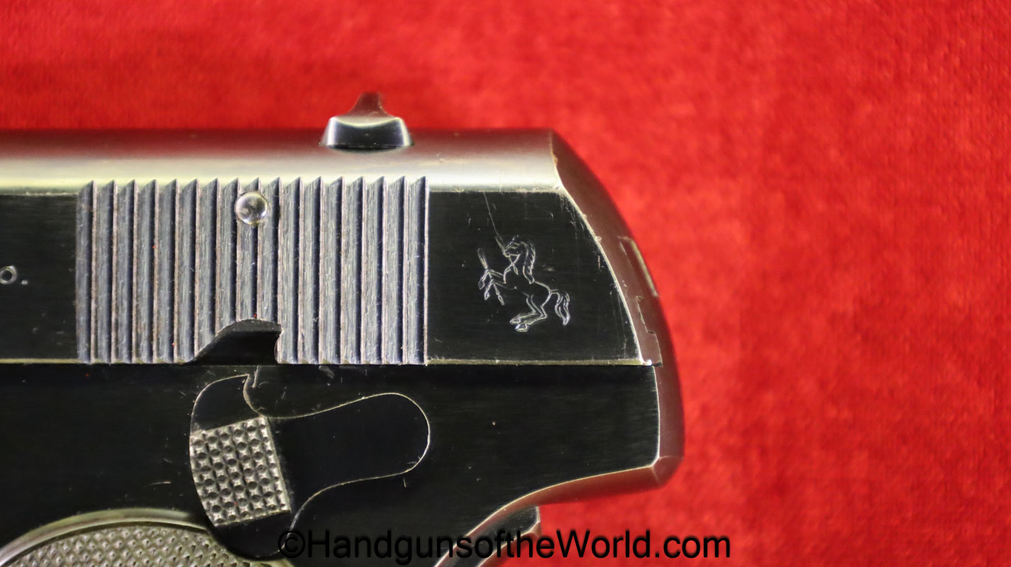 Colt 1903 Hammerless, .32acp. Built in 1920 with black hard rubber grips-the right shows a chip. This has a matching numbered slide with about 95% blue and an excellent bore.
