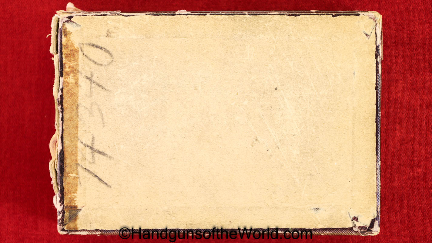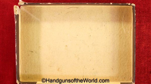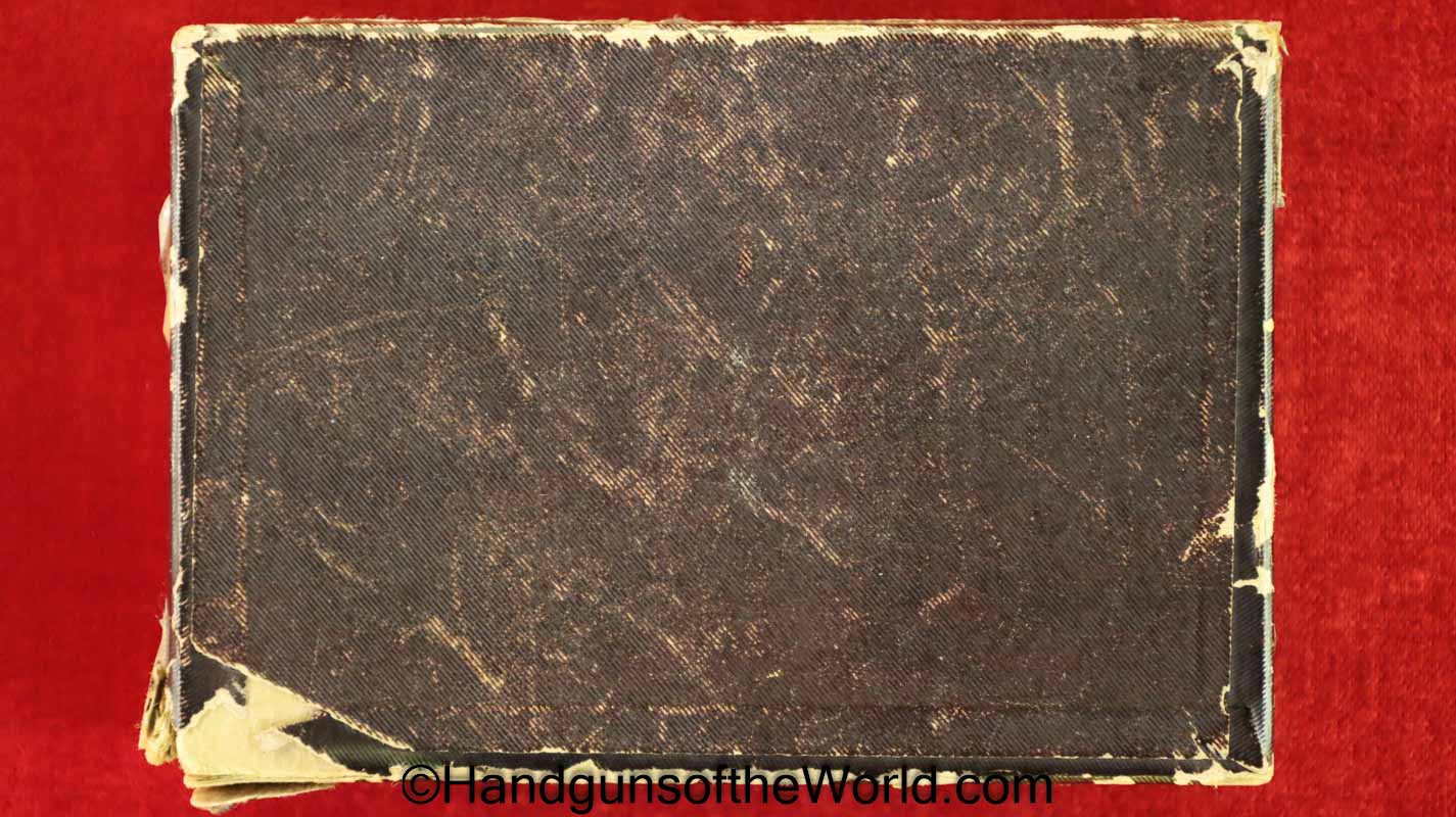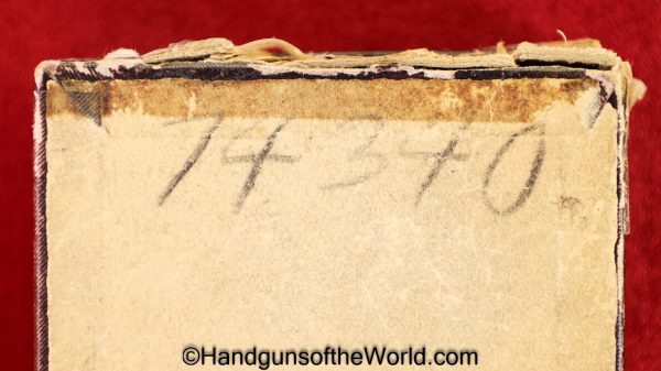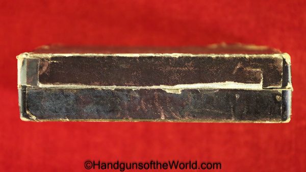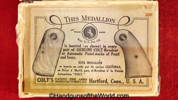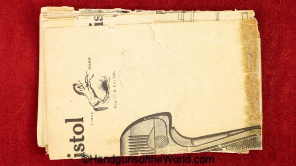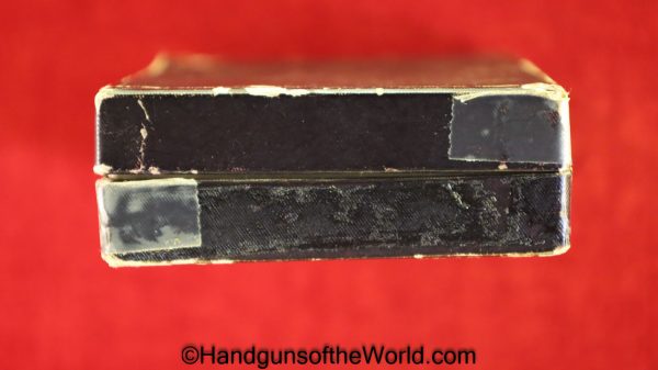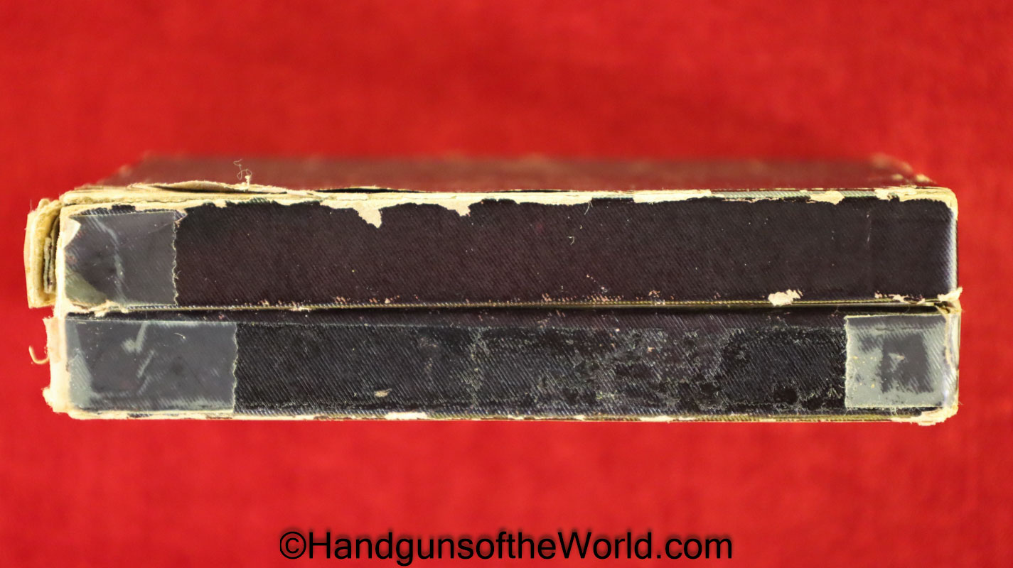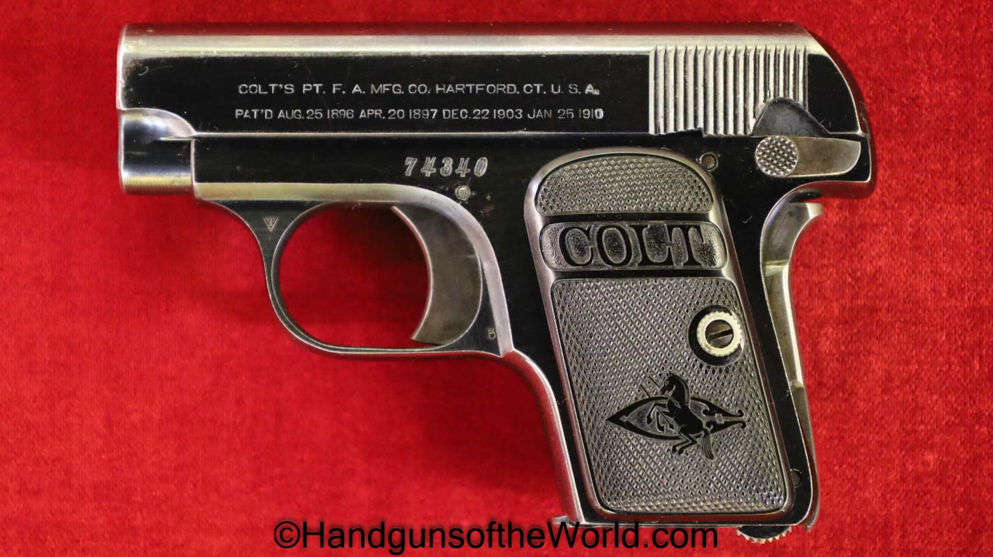 Colt 1908, .25 caliber. Built in 1912 with round top hard rubber grips. The high polish blue rates about 95% and the bore is VG-VG+. This is with its original, numbered maroon cardboard box-somewhat tattered, with a tattered manual and a cleaning brush.