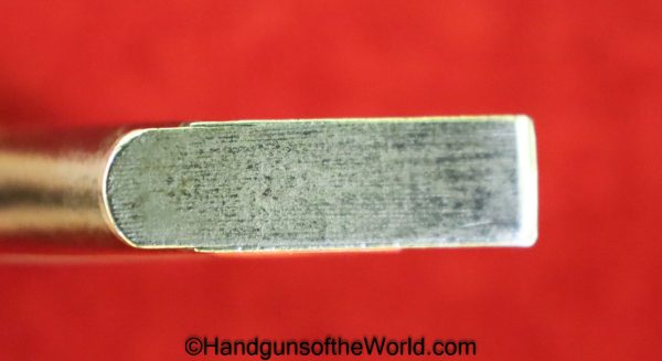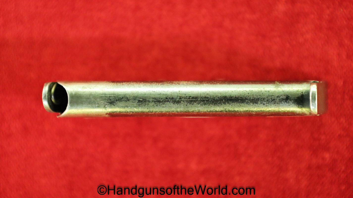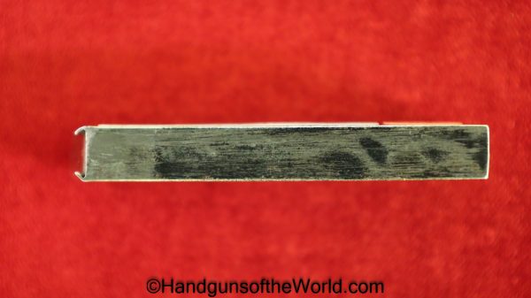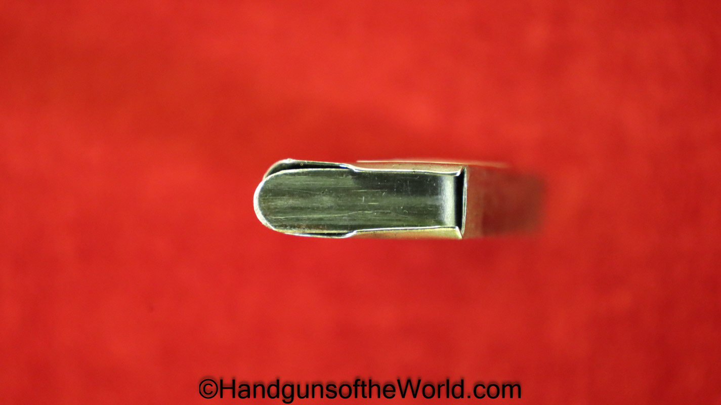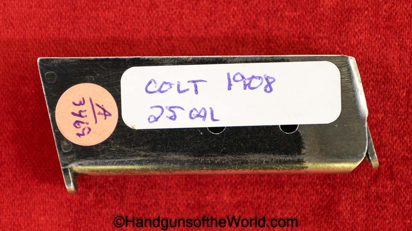 Original Colt 1908, .25 caliber Pistol Magazine. This is an early, unmarked pinned base. About 85% two-tone blue remains.