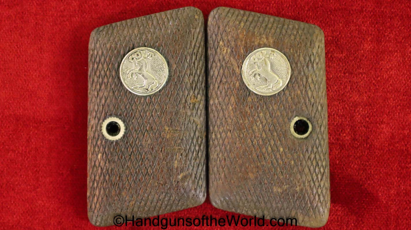 Original Colt 1908, 25 caliber Pistol Grips. Checkered walnut with Colt medallions. Overall VG.