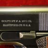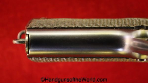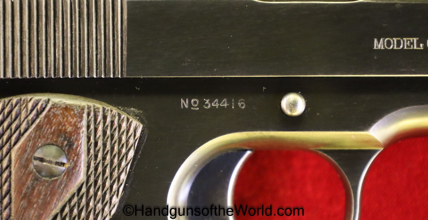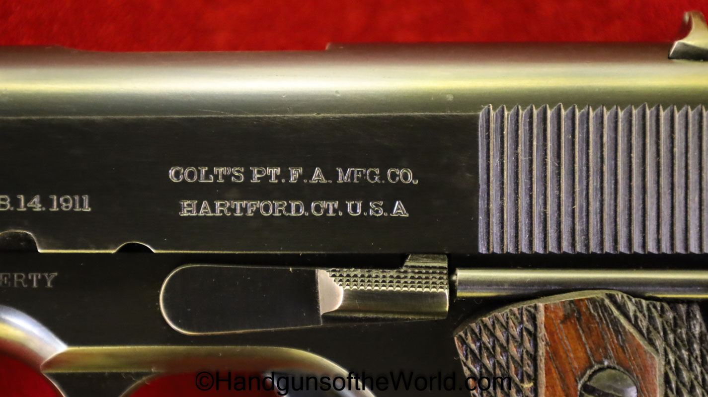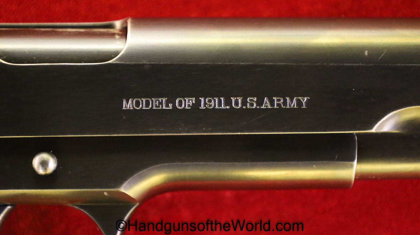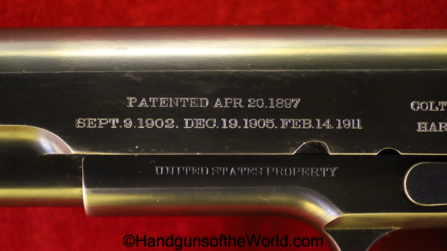 Colt 1911, .45acp. This is United States Property marked on the left frame, and is US Military inspected WGP on the left side near the magazine release. Built in 1913 this has a fire blue trigger, and all correct WWI era parts. Per Clawson, this was shipped in a 1000 batch, 6-11.1913 to Rock Island Arsenal. The restored High Polish blue rates 99% and the bore is VG+. A new made Kraft box, and an extra lanyard loop magazine.