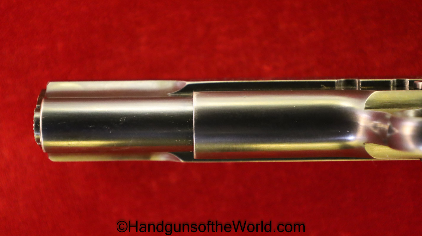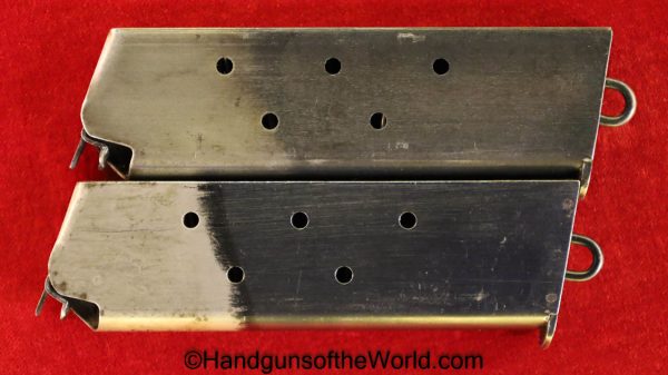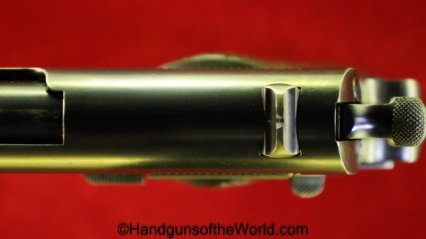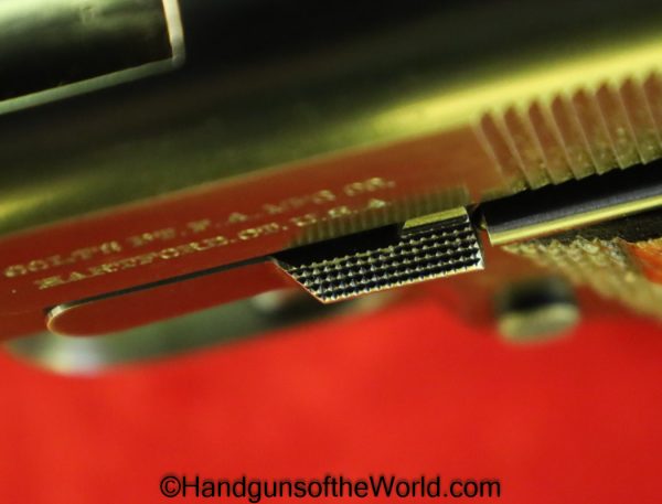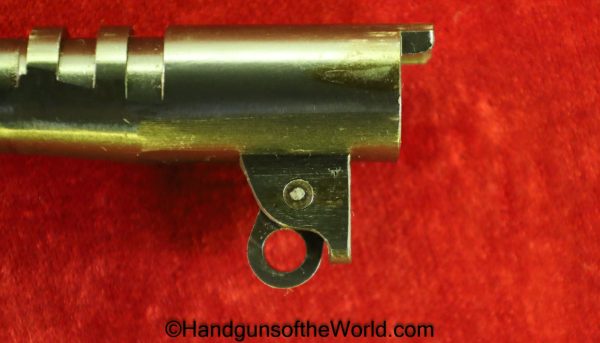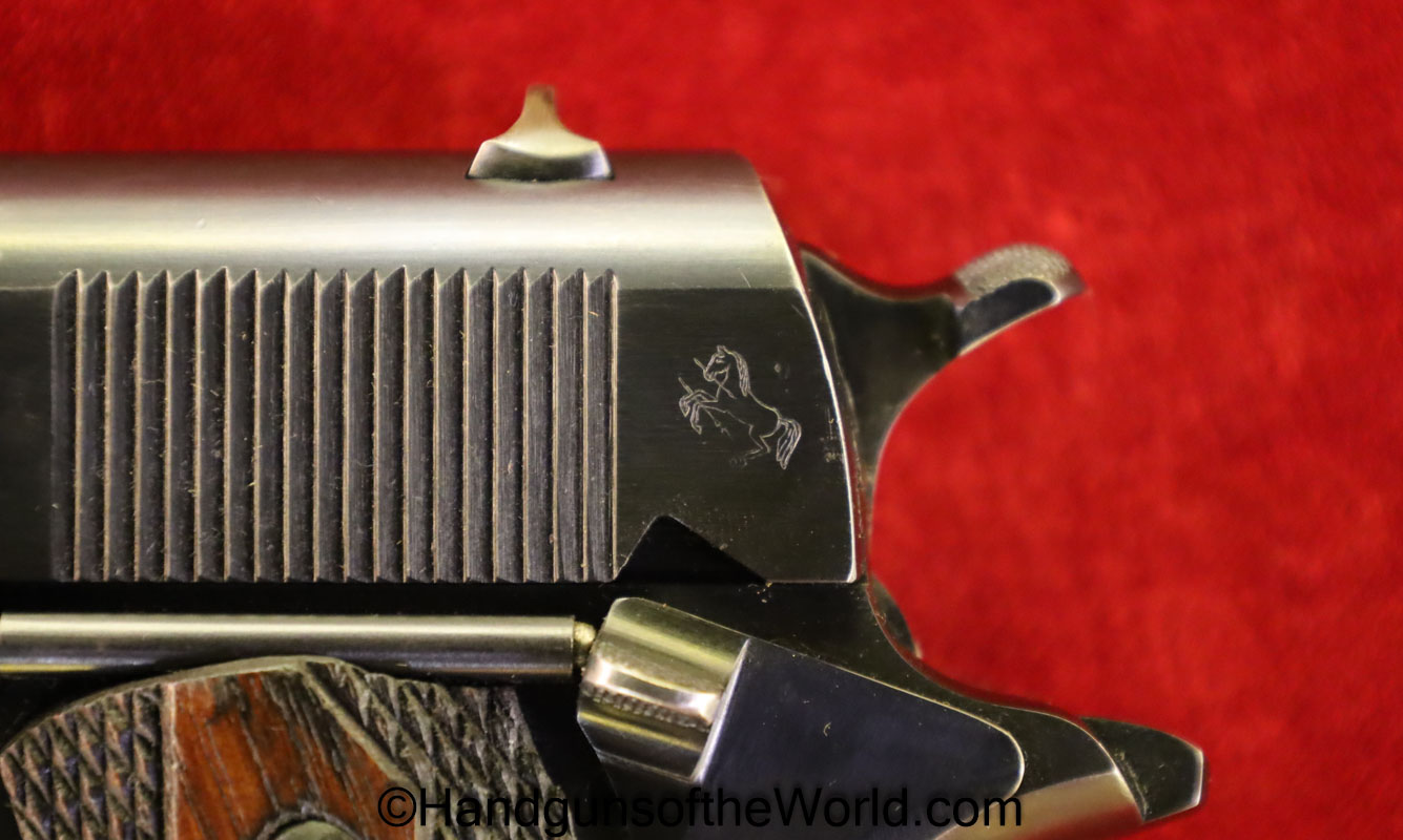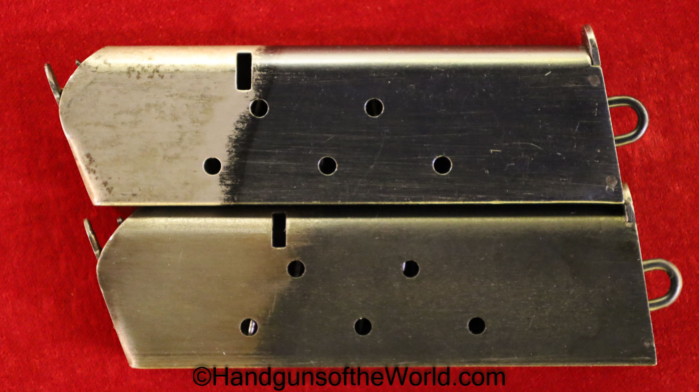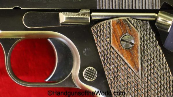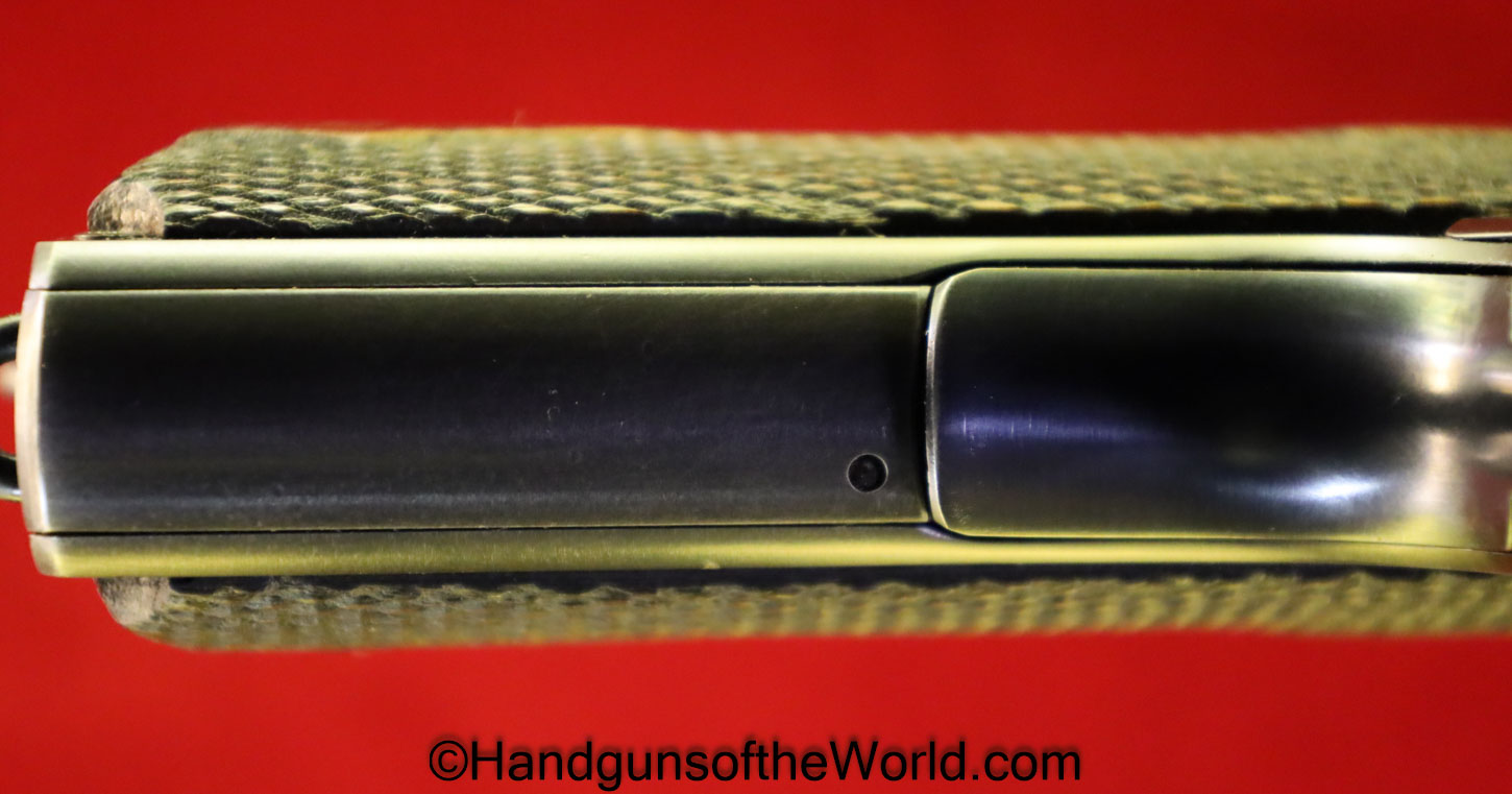 Colt 1911, .45acp. This is United States Property marked on the left frame, and is US Military inspected WGP on the left side near the magazine release. Built in 1913 this has a fire blue trigger, and all correct WWI era parts. Per Clawson, this was shipped in a 1000 batch, 6-11.1913 to Rock Island Arsenal. The restored High Polish blue rates 99% and the bore is VG+. A new made Kraft box, and an extra lanyard loop magazine.
