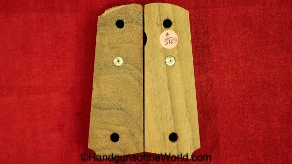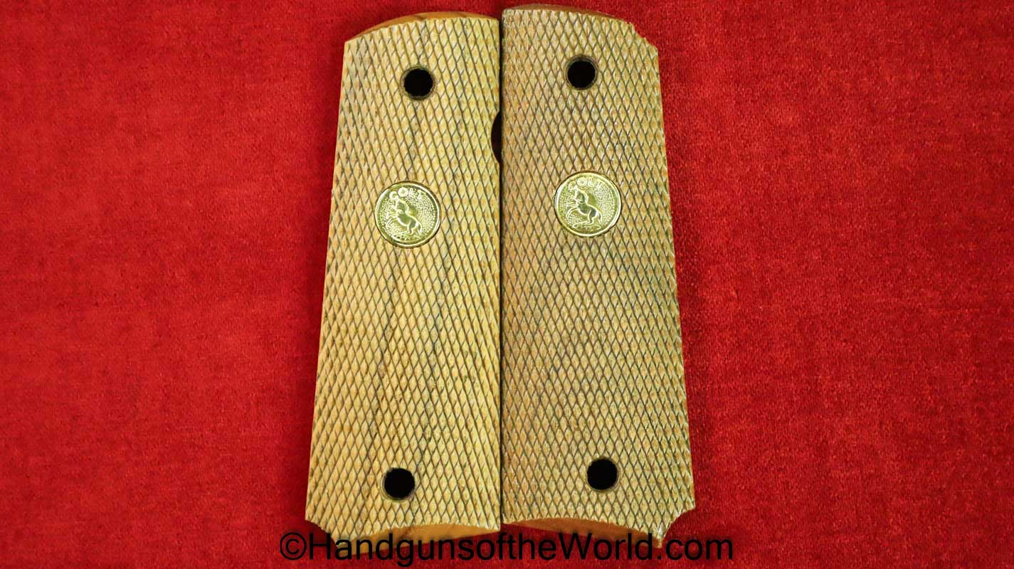 Original Colt 1911 or Government Model Pistol Grips. These are checkered walnut with Gold plated Colt medallions. Overall Excellent.