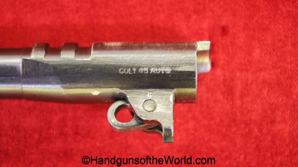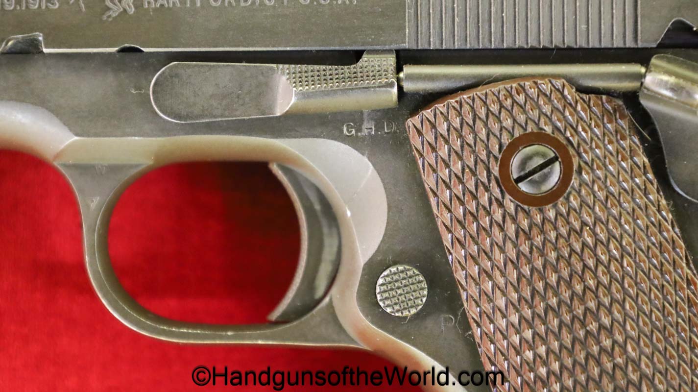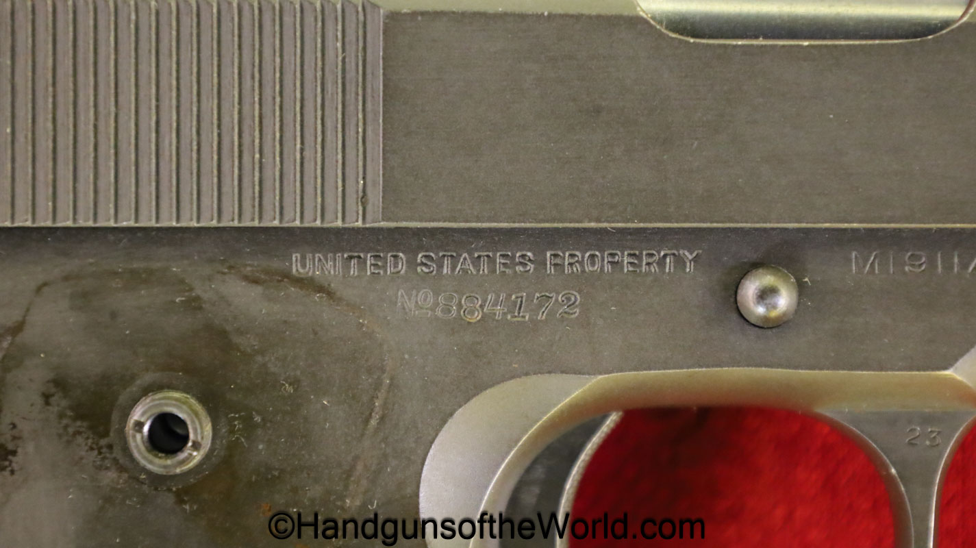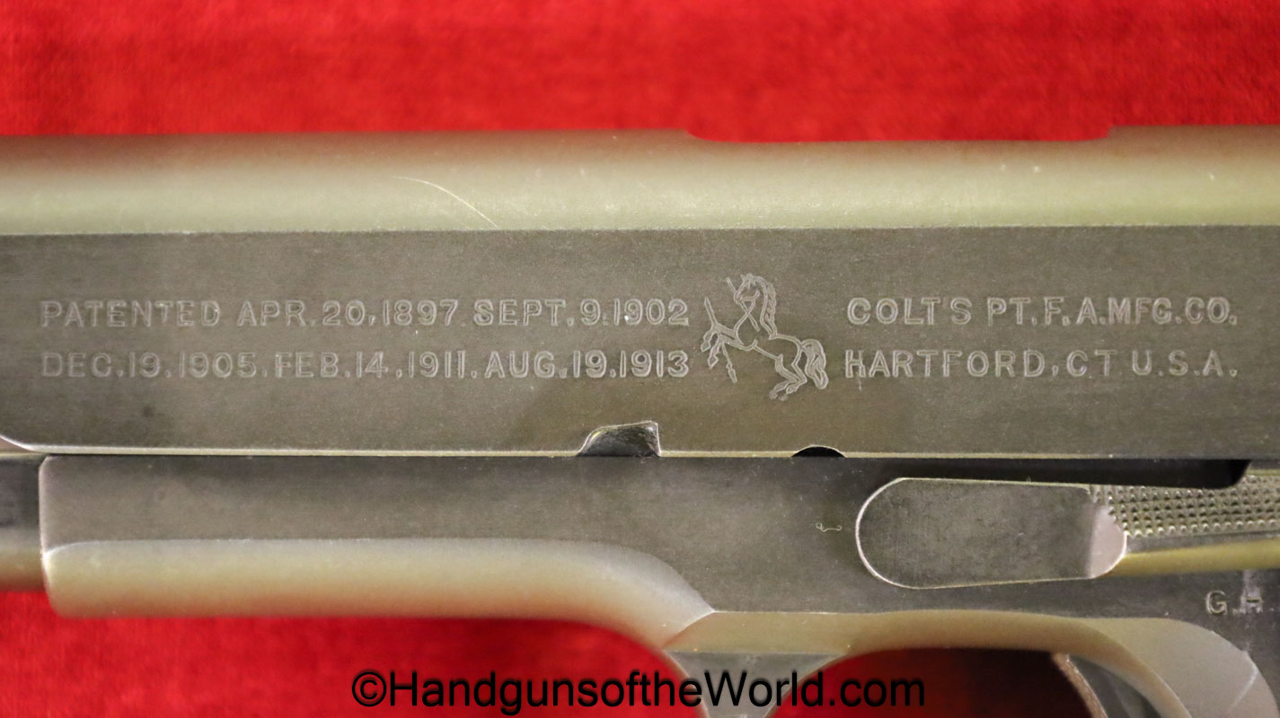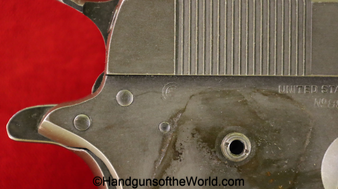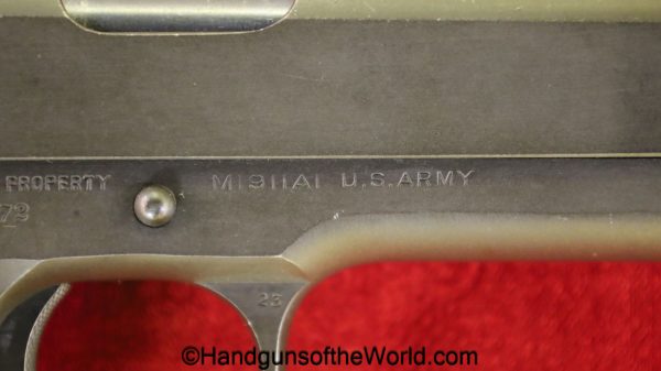 Colt 1911A1, .45acp. Built in 1943, this is United States Property marked on the right frame. This is GHD inspected on the left side of the frame. This has all correct, WWII era parts to include the matching numbered slide, a Colt Auto 45 marked barrel and an R marked magazine. The finish rates about 97% and the bore is VG+.