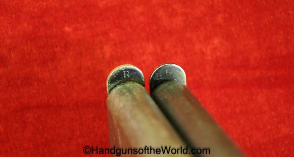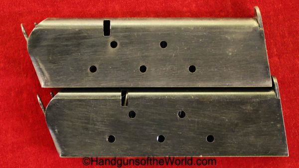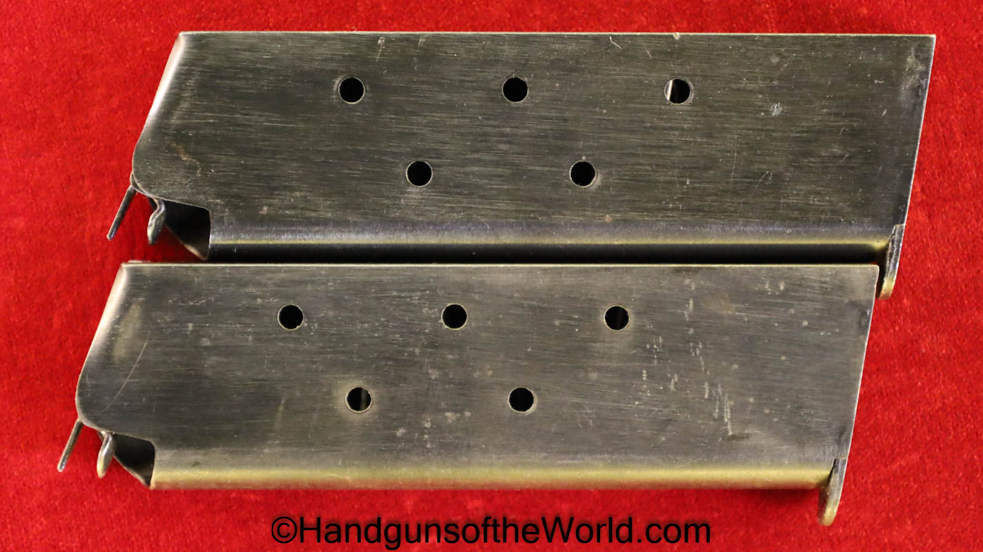 Colt 1911A1, .45 acp. This is United States property marked on the right frame, and is GHD inspected on the left frame. Built in 1943, this has all correct WWII parts with a Colt 45 Auto marked barrel, and 2 R marked magazines. The restored finish rates highly at 99% and the bore is VG. This comes with a new made Kraft box.