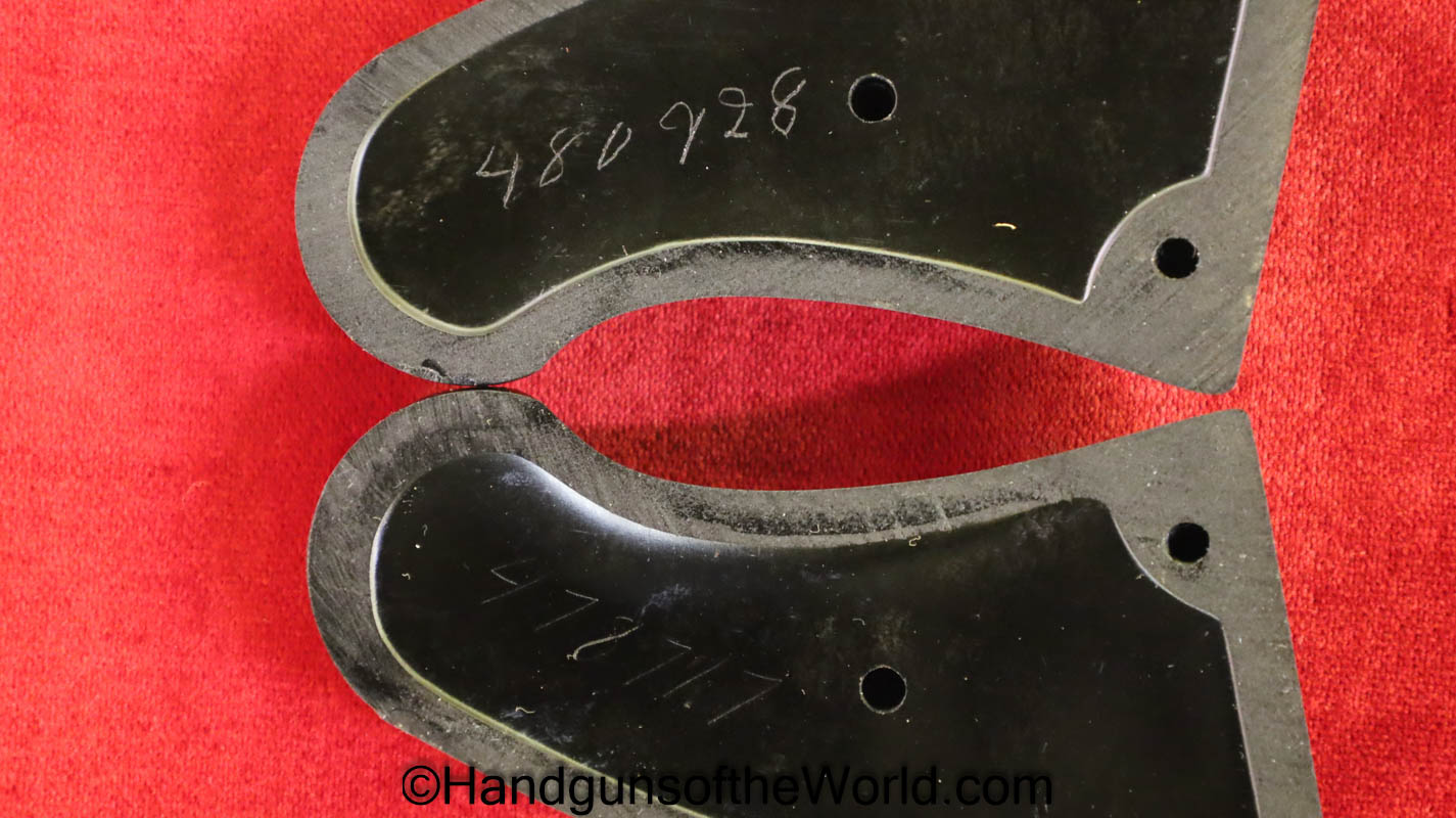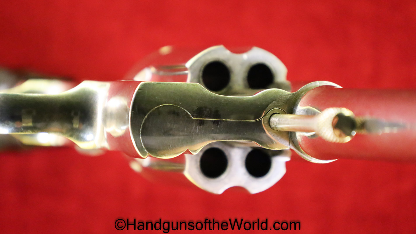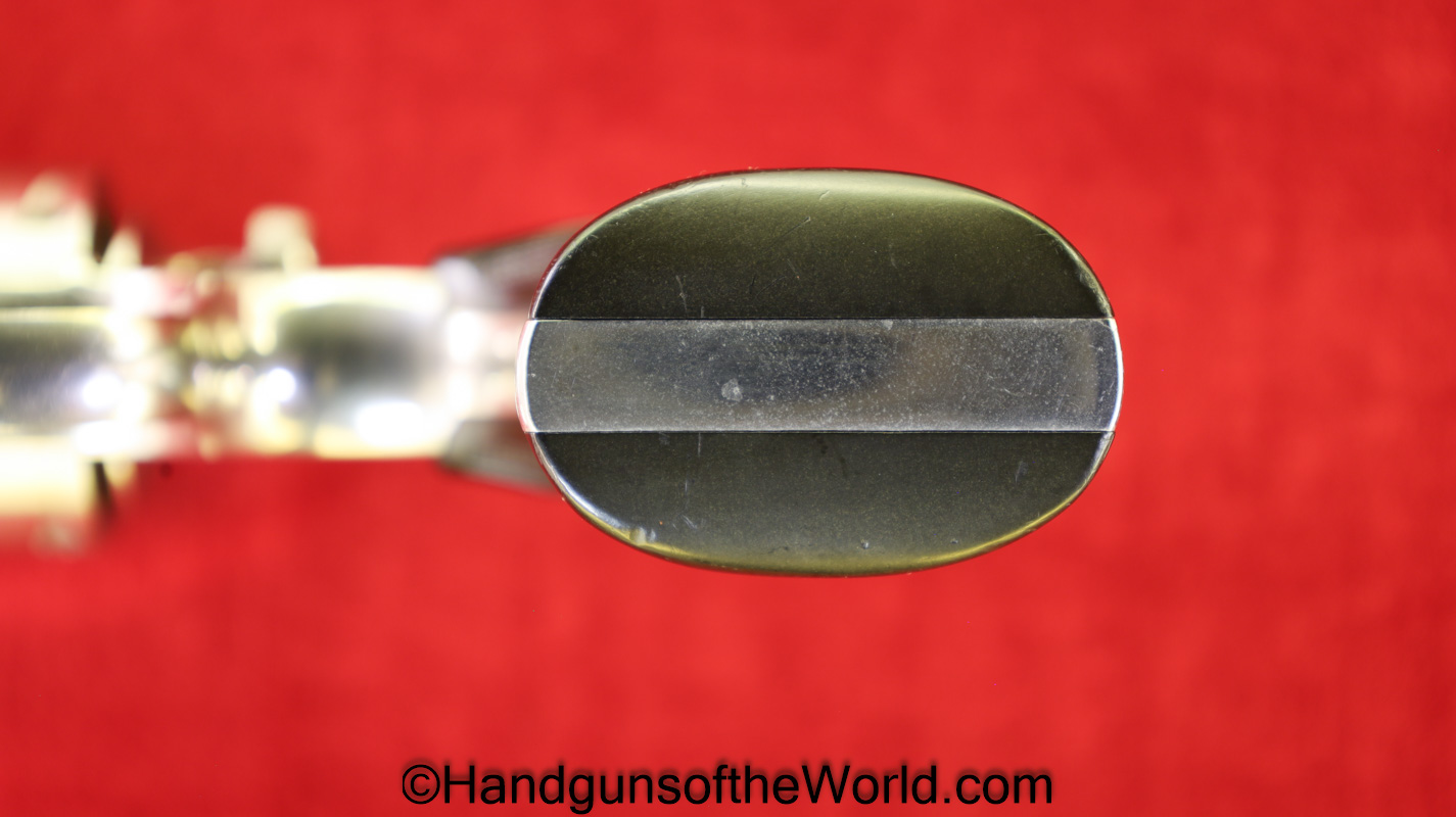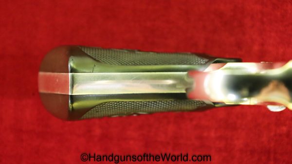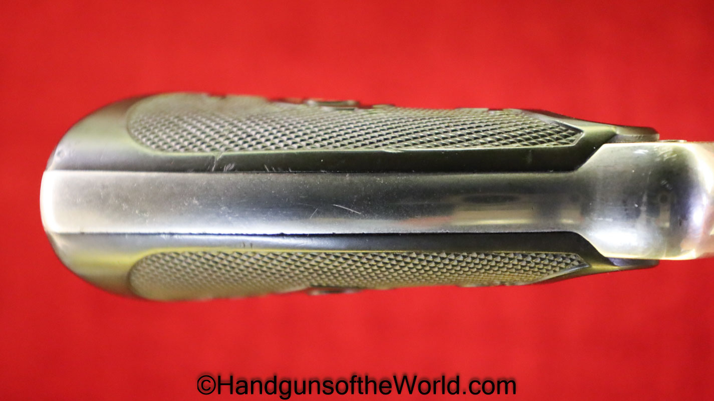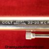 Colt Army Special, .32-20 WCF caliber. Built in 1921 with a 5″ barrel and now replaced hard rubber grips. This has 99+% factory nickel, and the bore is VG+.