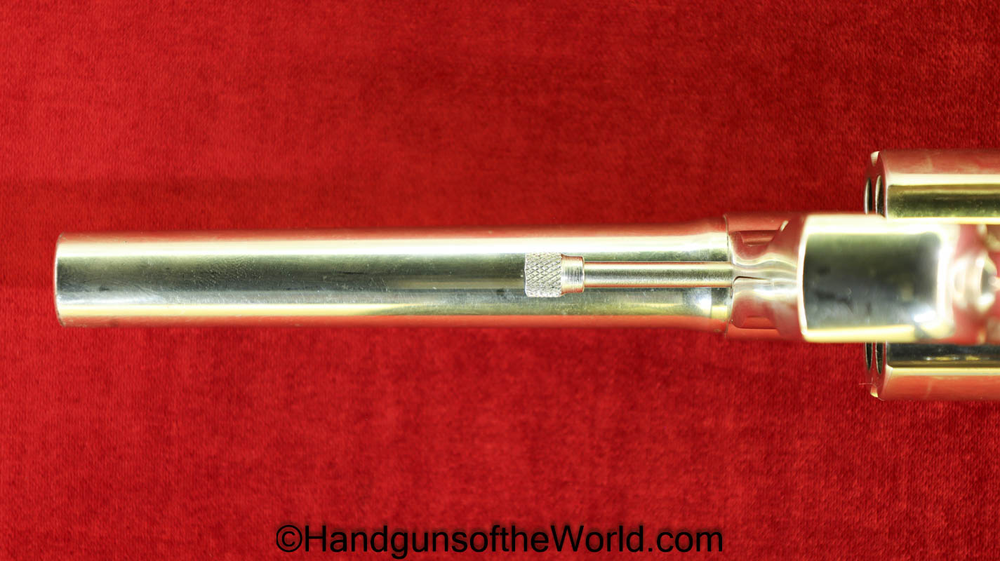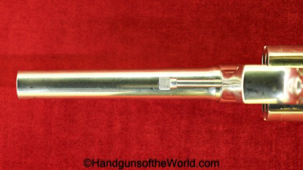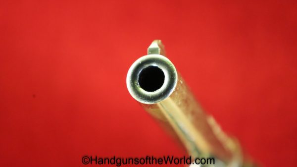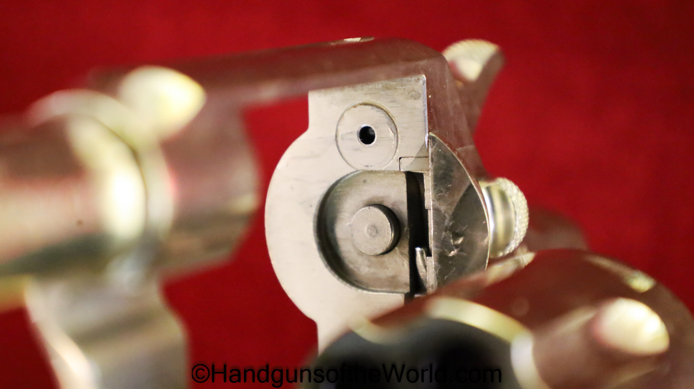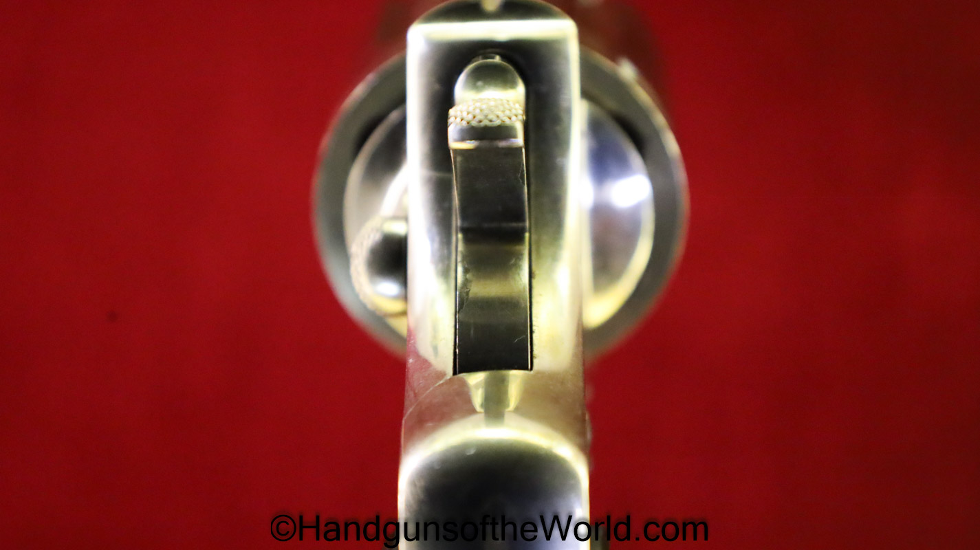 Colt Army Special, .32-20 WCF caliber. Built in 1921 with a 5″ barrel and now replaced hard rubber grips. This has 99+% factory nickel, and the bore is VG+.