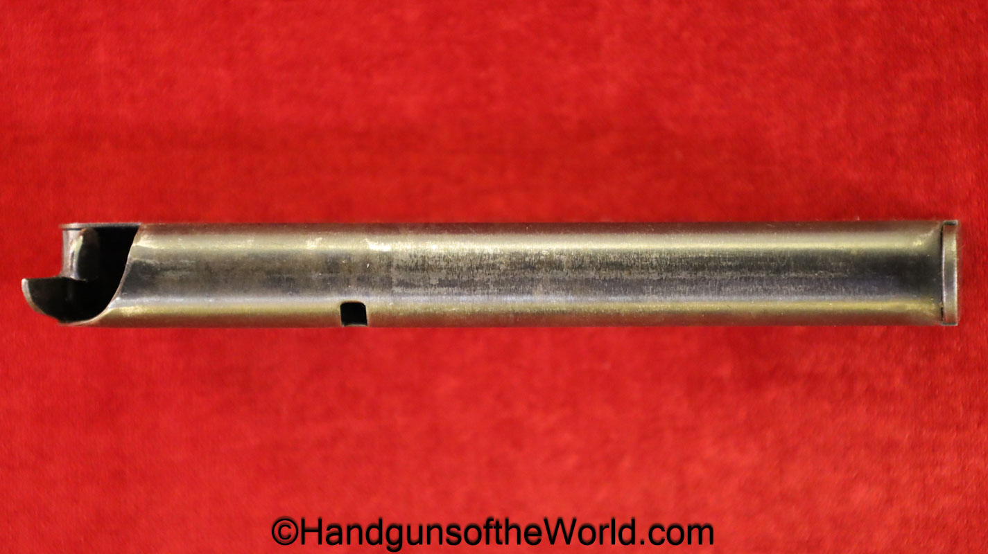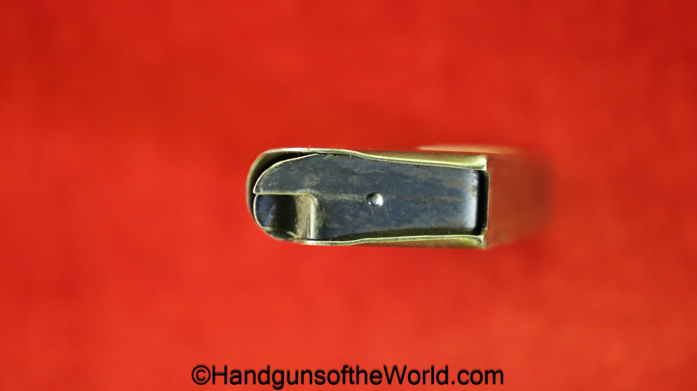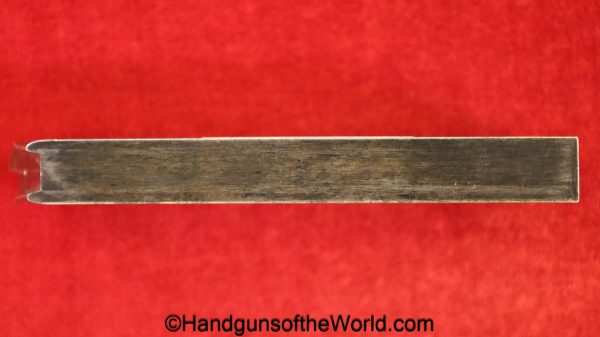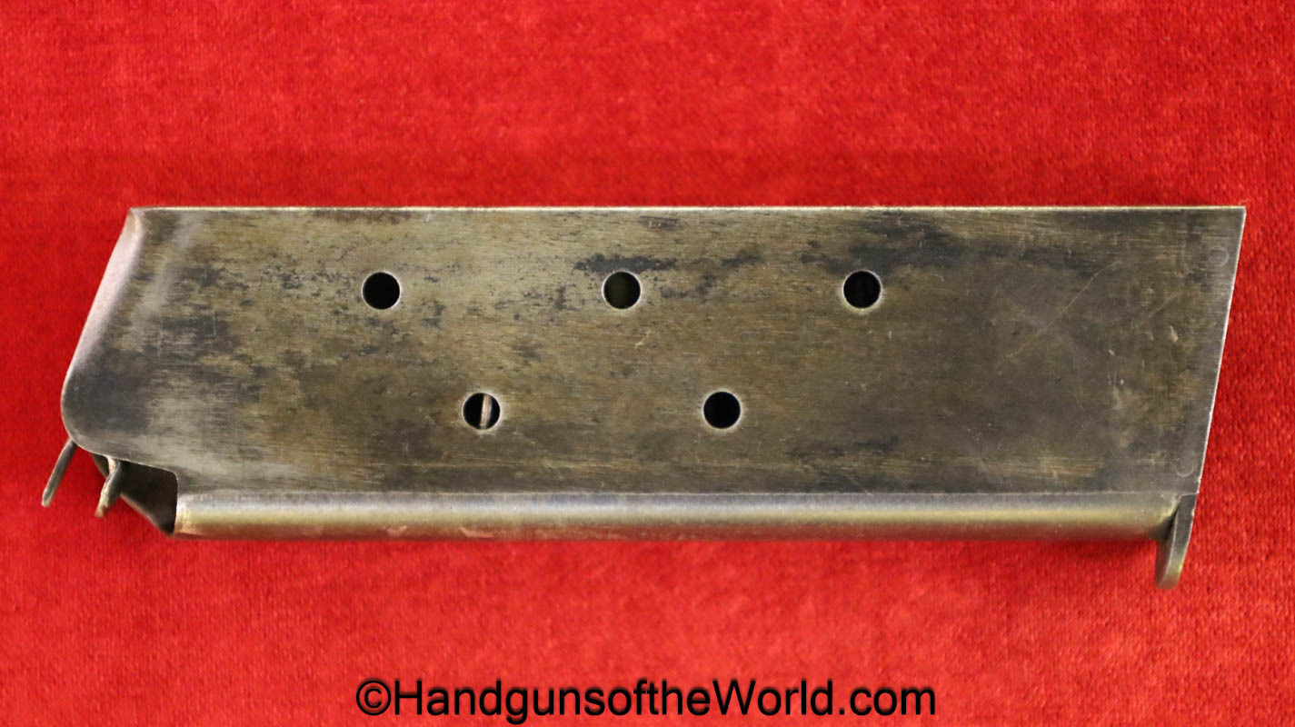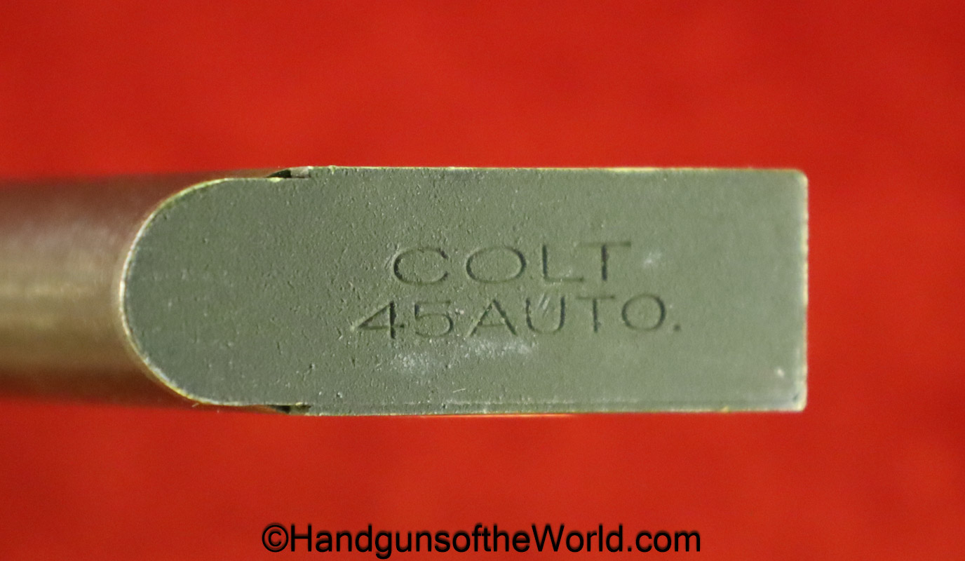 Original Colt Government Model Pistol magazine. Marked “45 Auto Colt” on the base. No drain hole in front spine. About 60% blue remains.
