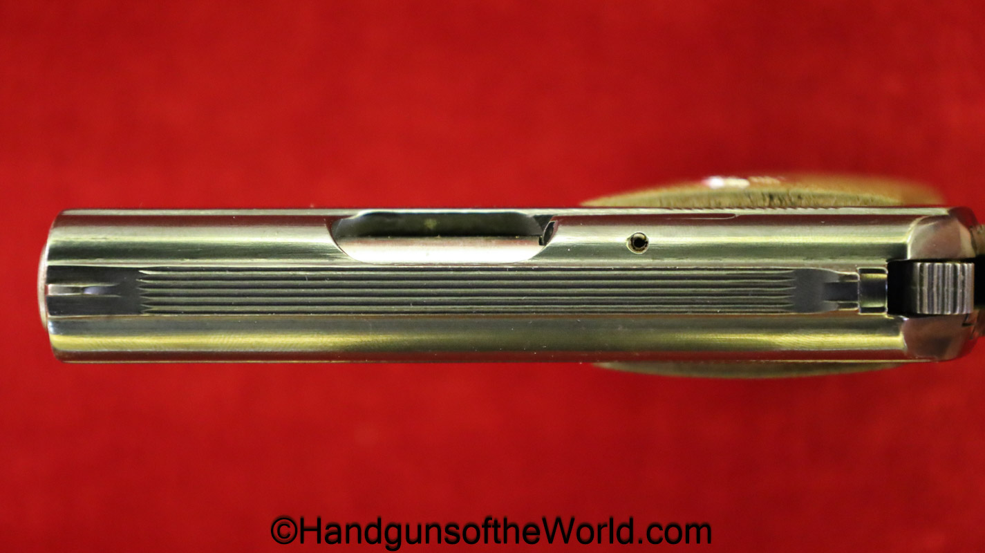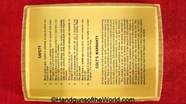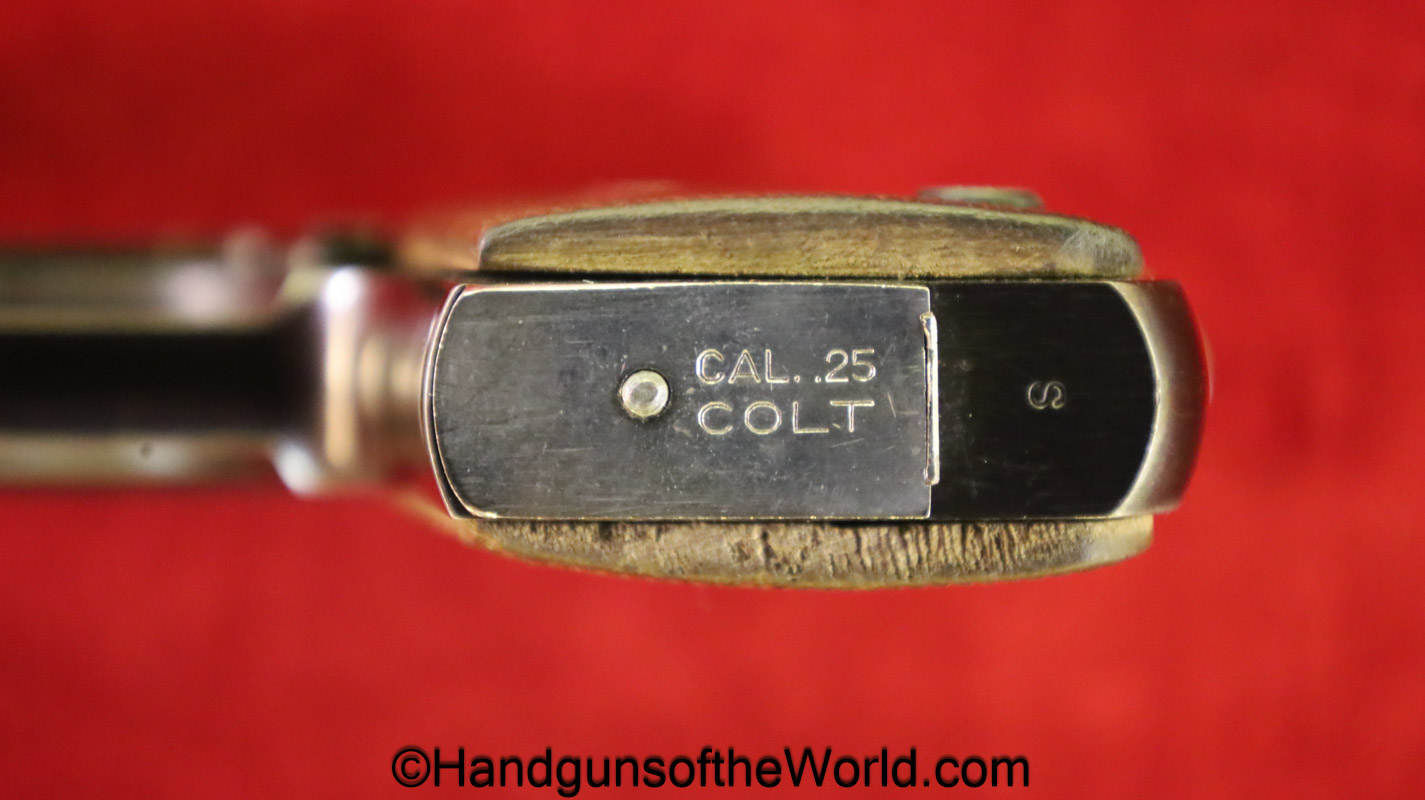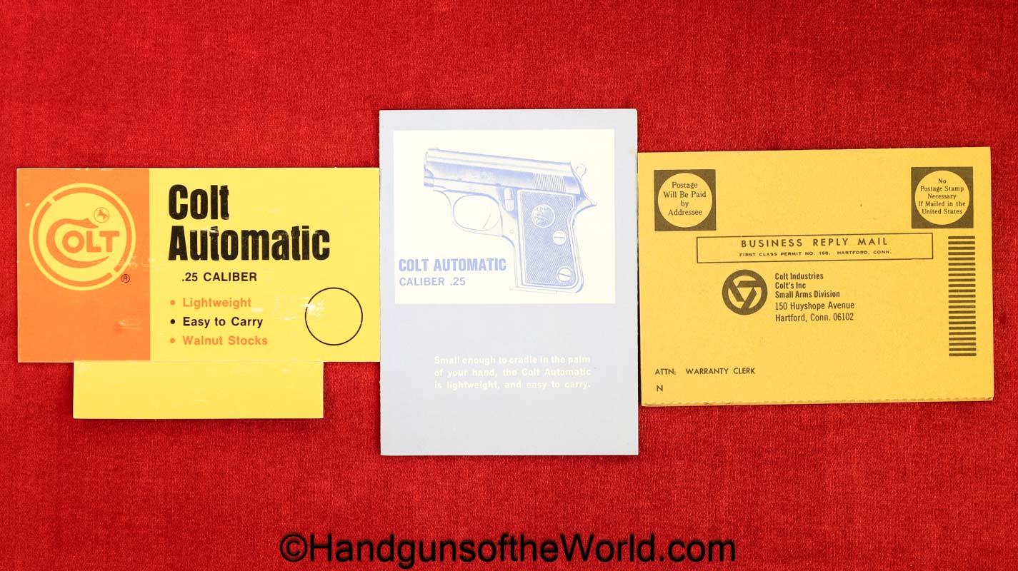 Colt Junior, .25 caliber. Built in 1970 with checkered walnut grips with Colt medallions. This retains about 99% blue and the bore is excellent. this comes with its original, number woodgrain pattern cardboard box with the manuals.