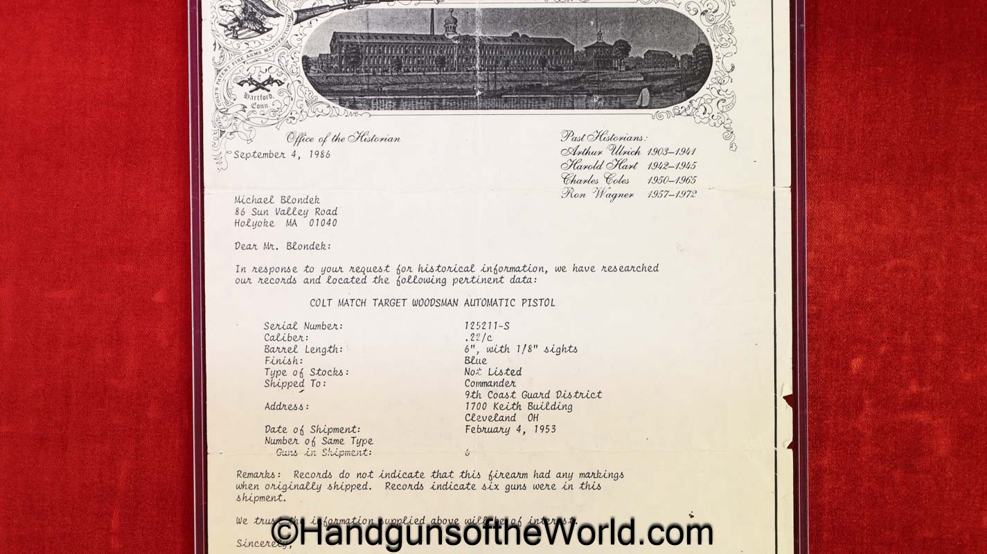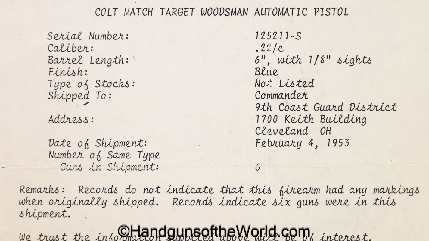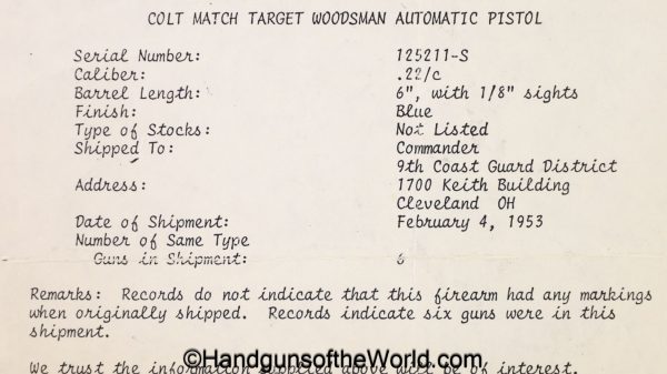 Colt Match Target Woodsman, 2nd Model .22lr. Built in 1953 with a 6″ barrel and black plastic grips with a thumb rest. This is marked on the right receiver “US COAST GUARD”, and was 1 of 6 shipped to the 9th Coast Guard District in Cleveland OH, per the included Colt factory archive letter. The blue rates about 85% and the bore is excellent.