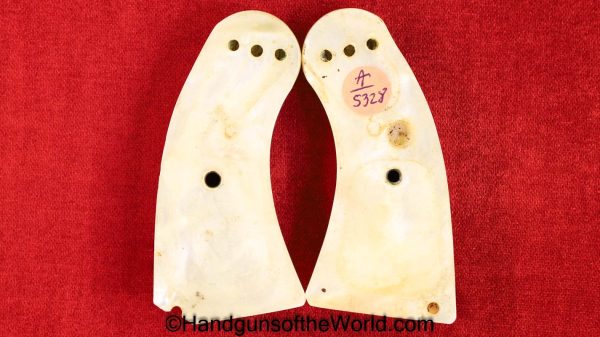 Original Colt Police Positive Revolver Grips. These are smooth mother of Pearl with Colt medallions. The left panel show a chip on the left rear. VG-VG+ overall.