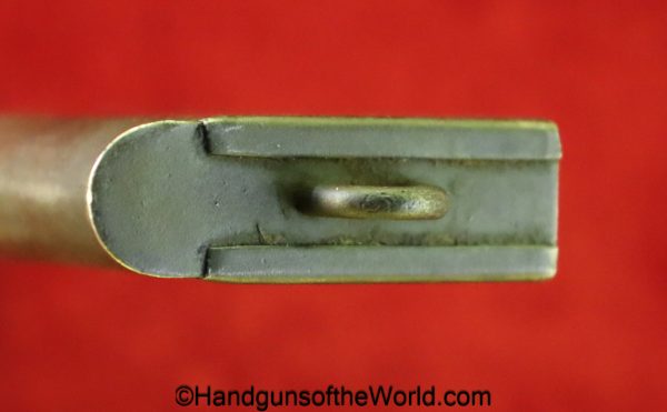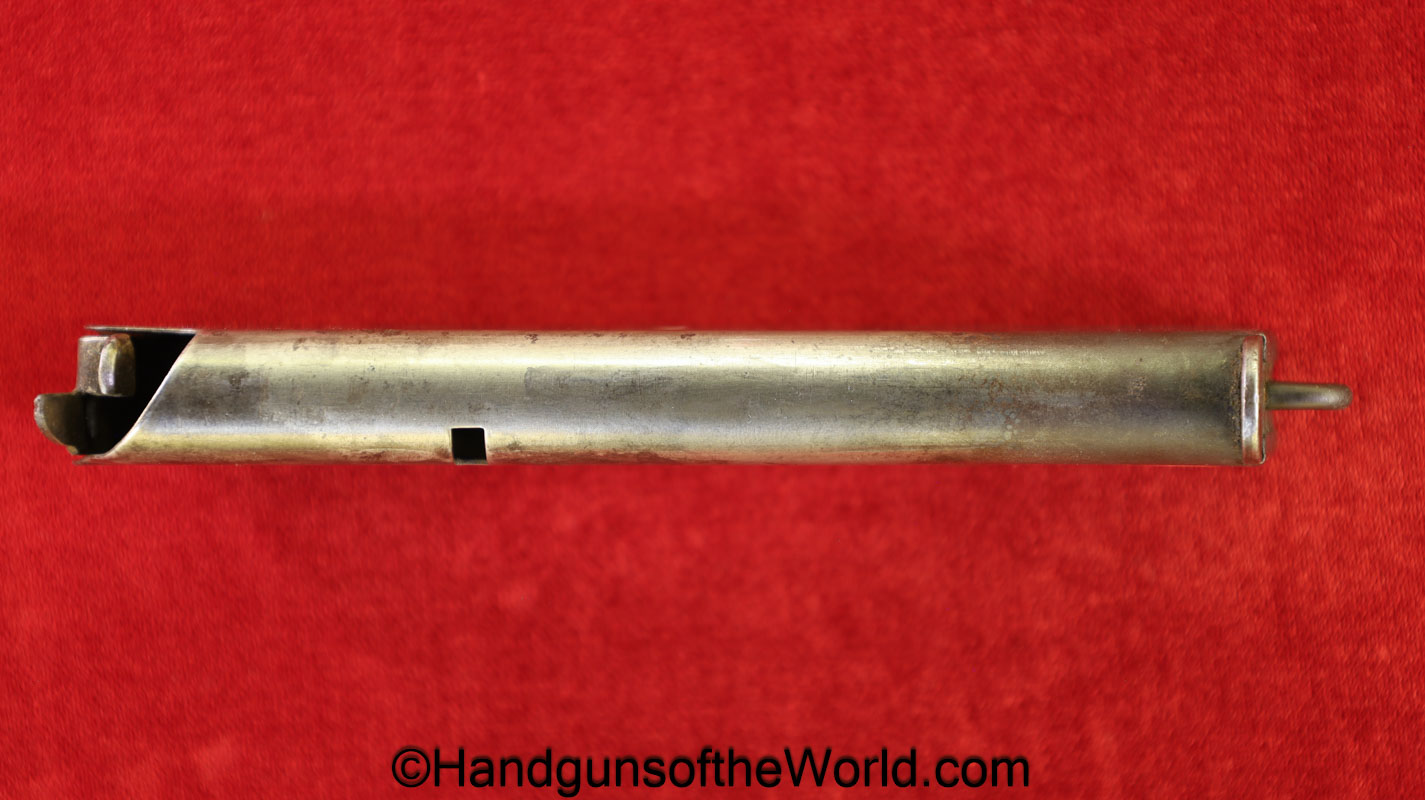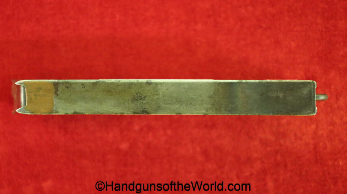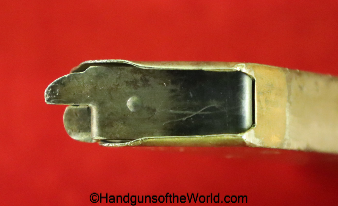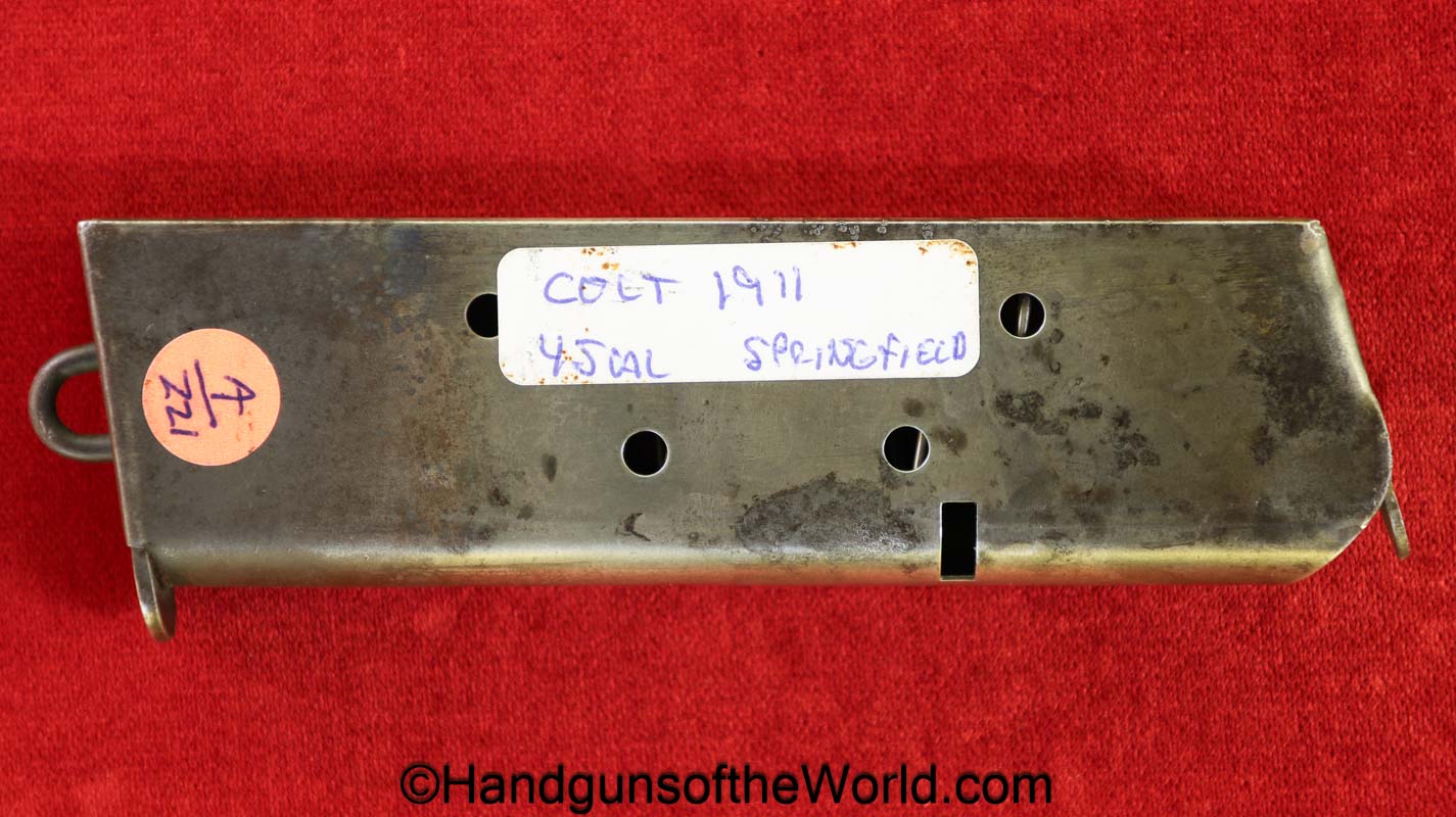 Original Springfield 1911, 45acp Pistol magazine. This has the folded base with a lanyard loop and also has the bronzed reinforced feed lip area. This has about 95% two-tone blue.