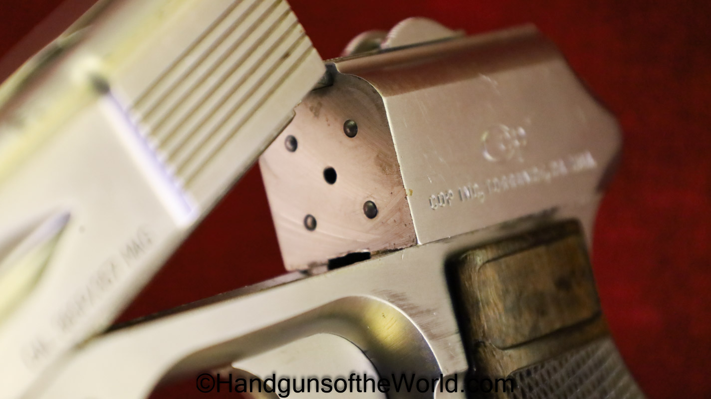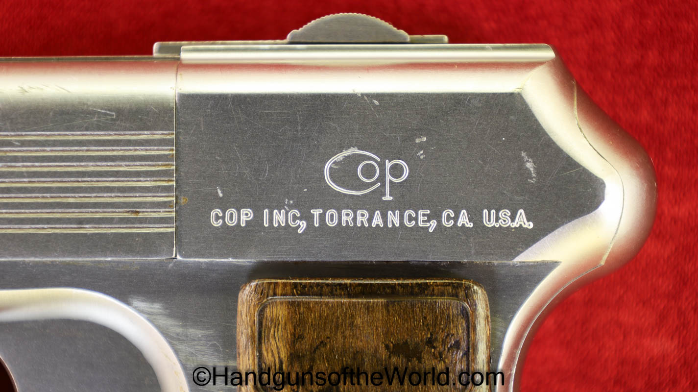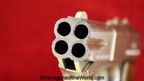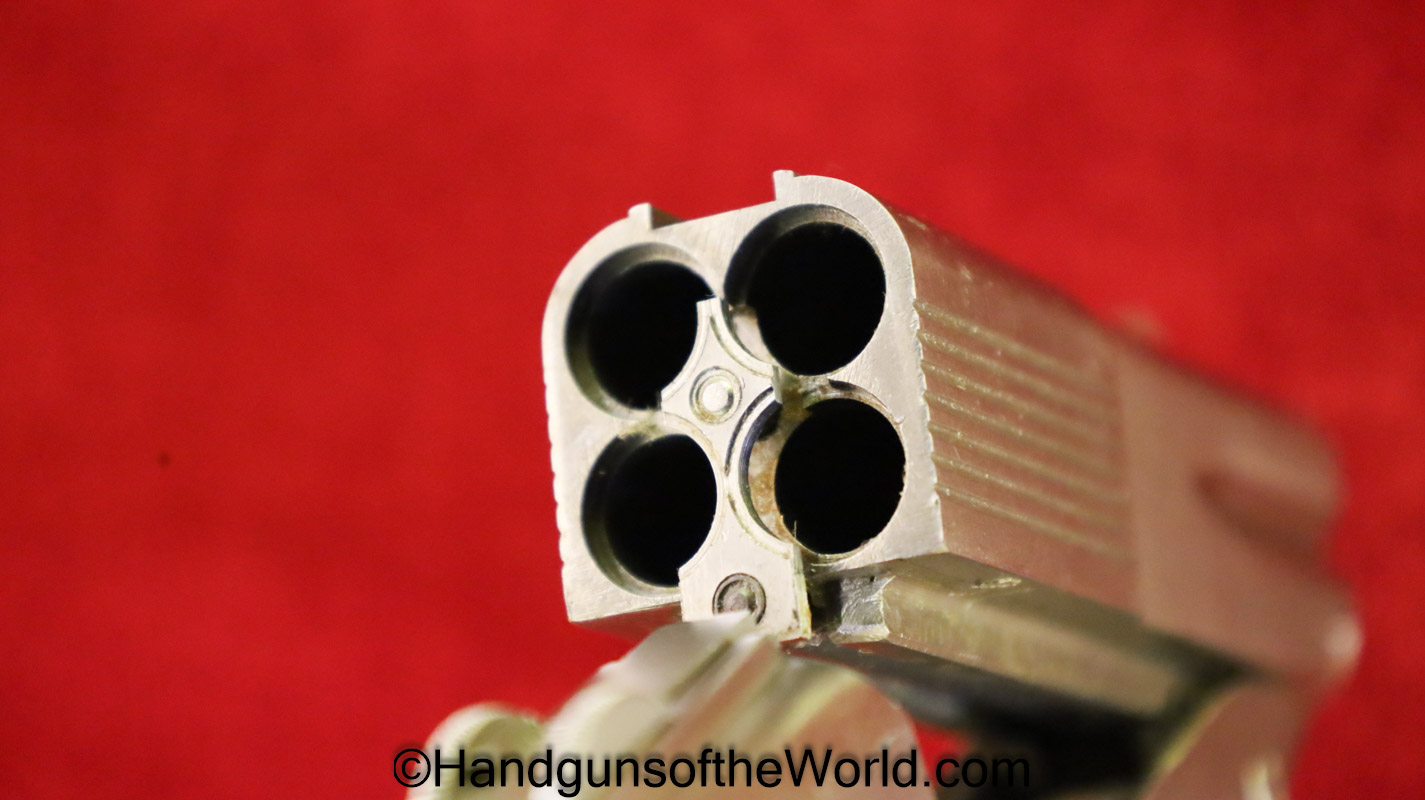 COP SS-1, .38 Special/.357 Magnum. This 4 barrel is full stainless with checkered walnut grips. Overall VG+ with Excellent bores.