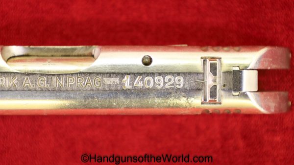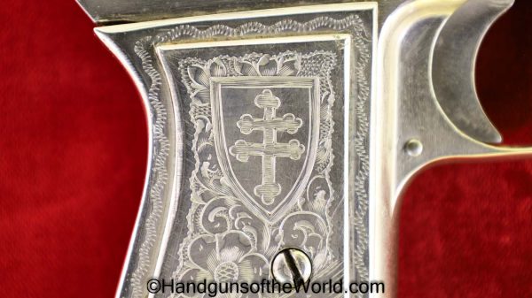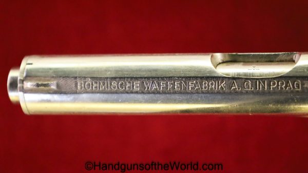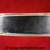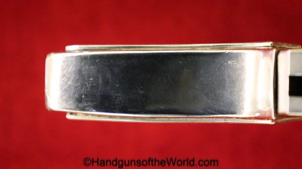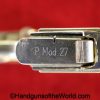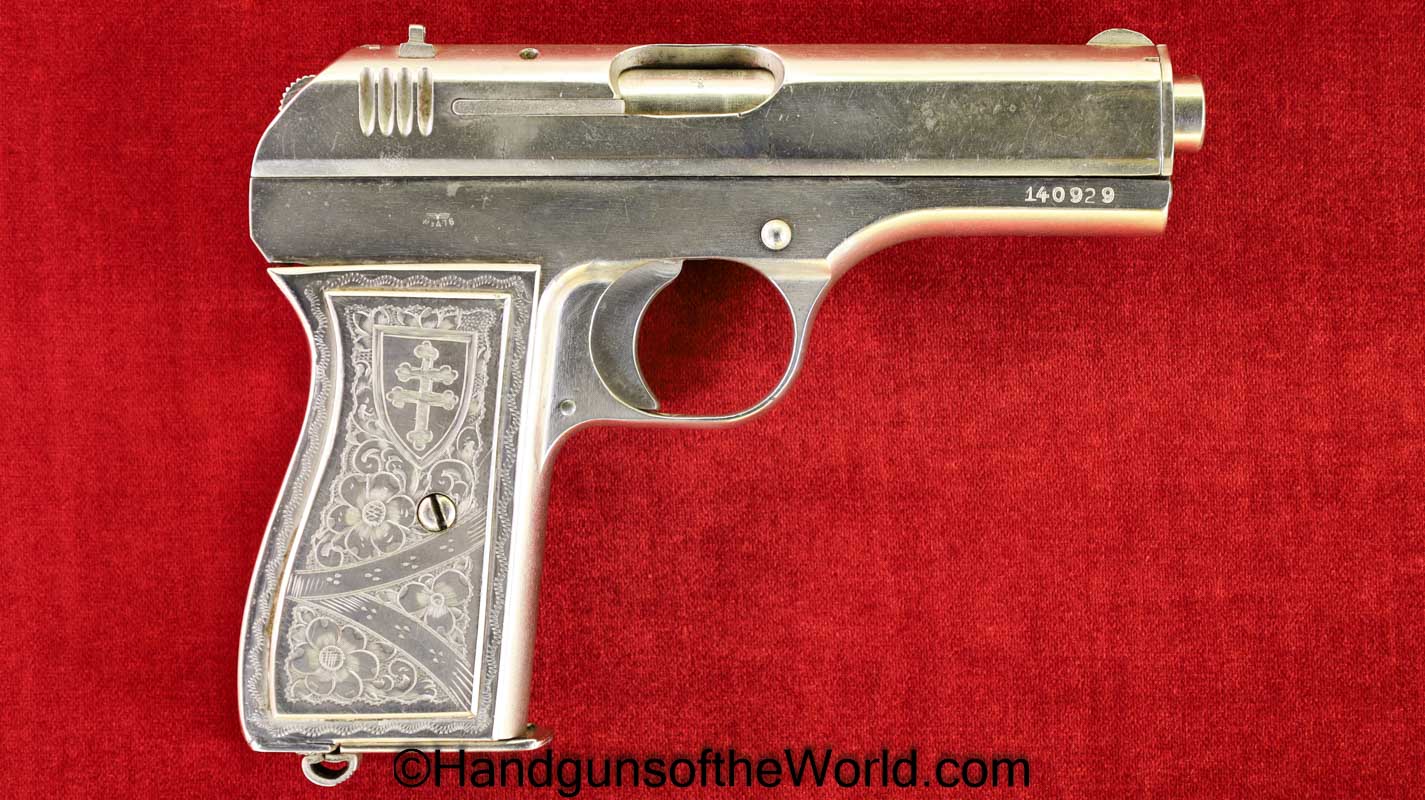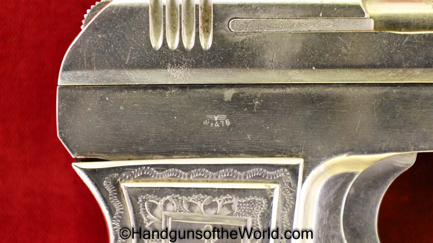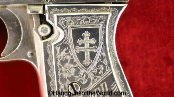 CZ-27, 7.65mm. This is German WaA76 proofed and has the full slide legend. This has been US GI altered with a nickel-plated brass grip, which has been engraved with the Cross of Lorain, which is the logo for the 79th Division during WWII. This also has been nickel plated with 99% remaining and the bore is excellent. Nice History.