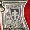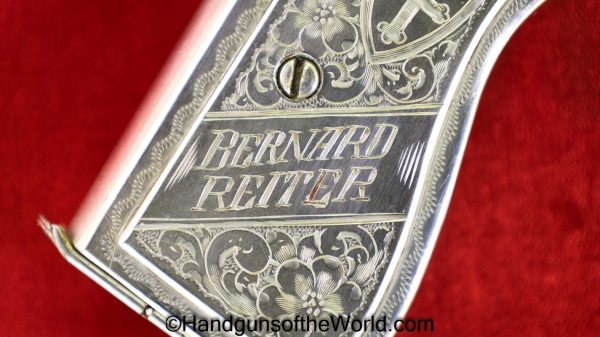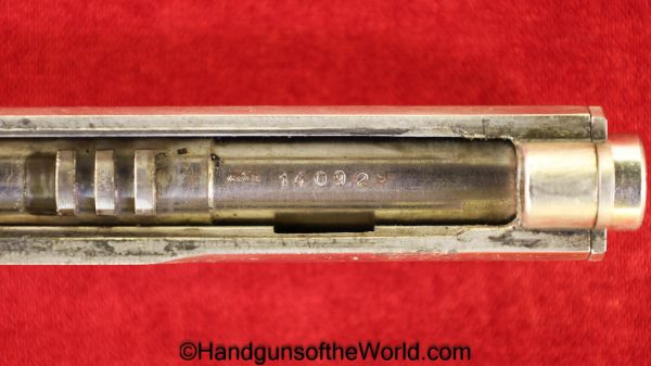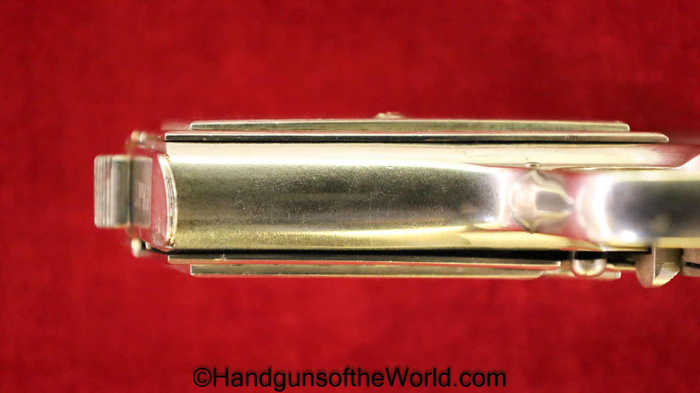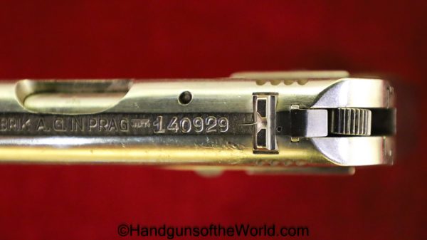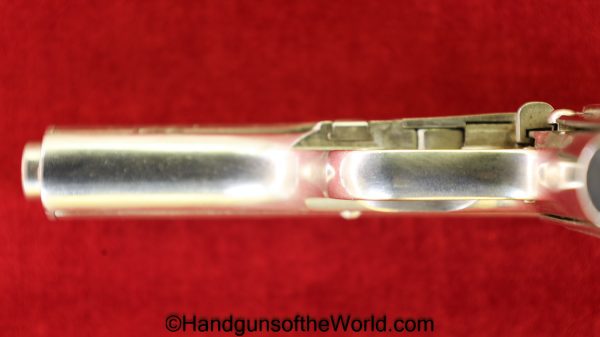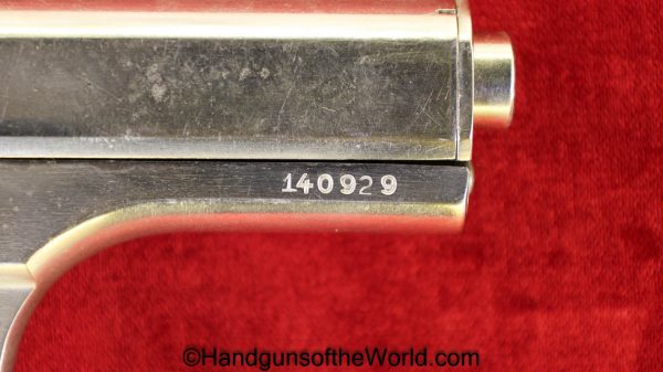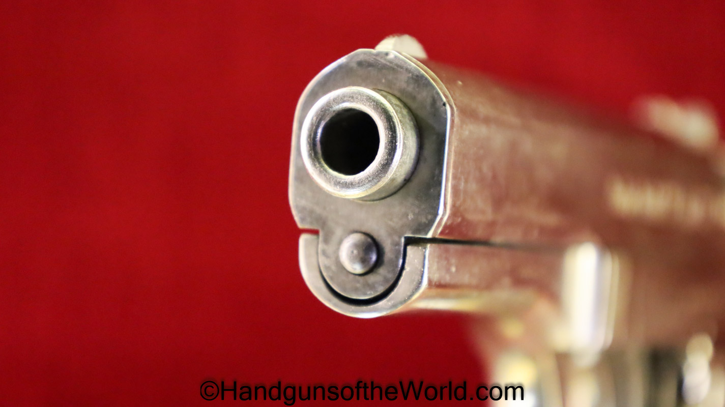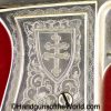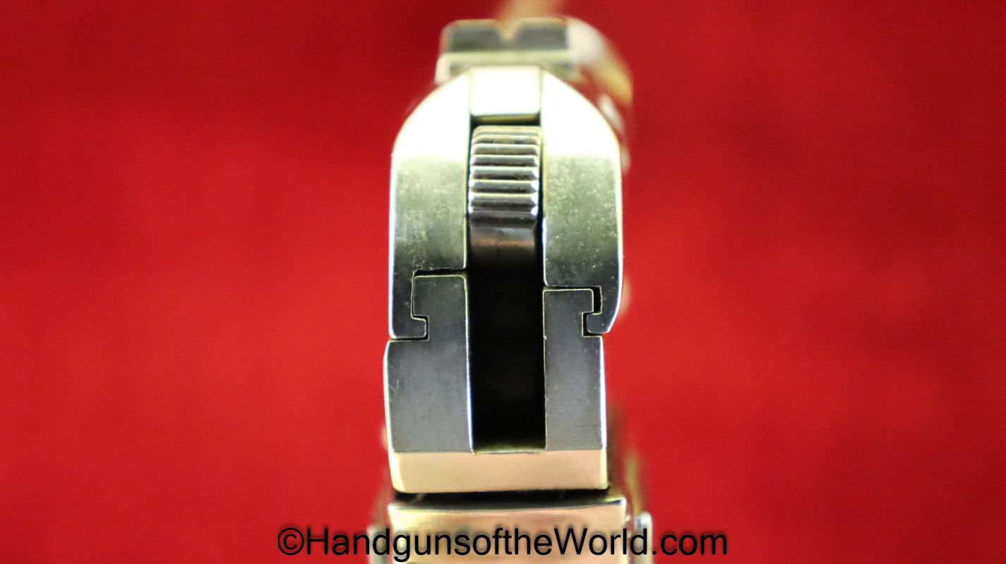 CZ-27, 7.65mm. This is German WaA76 proofed and has the full slide legend. This has been US GI altered with a nickel-plated brass grip, which has been engraved with the Cross of Lorain, which is the logo for the 79th Division during WWII. This also has been nickel plated with 99% remaining and the bore is excellent. Nice History.