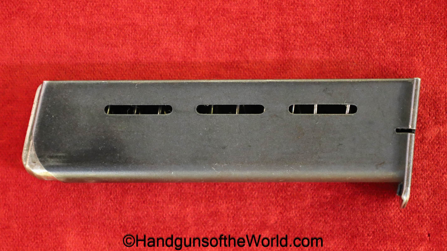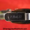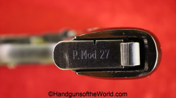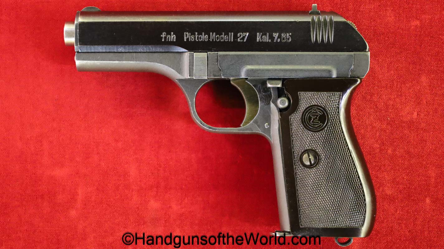 CZ-27, 7.65mm. This has the proper brown Bakelite grips with the CZ logo, and the FNH slide legend. This is German WWII WaA76 proofed on the right side of the frame. This has all matching numbers, 99+% blue and the bore is excellent.