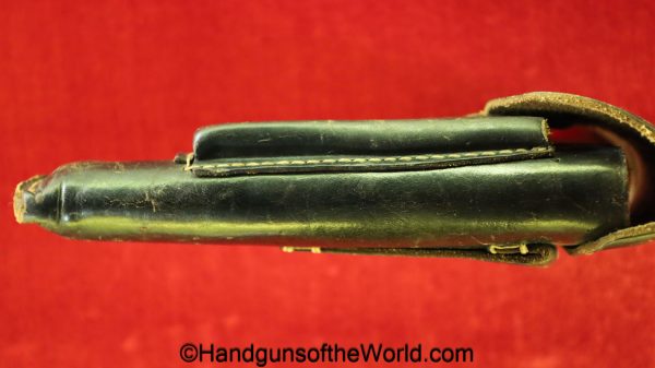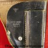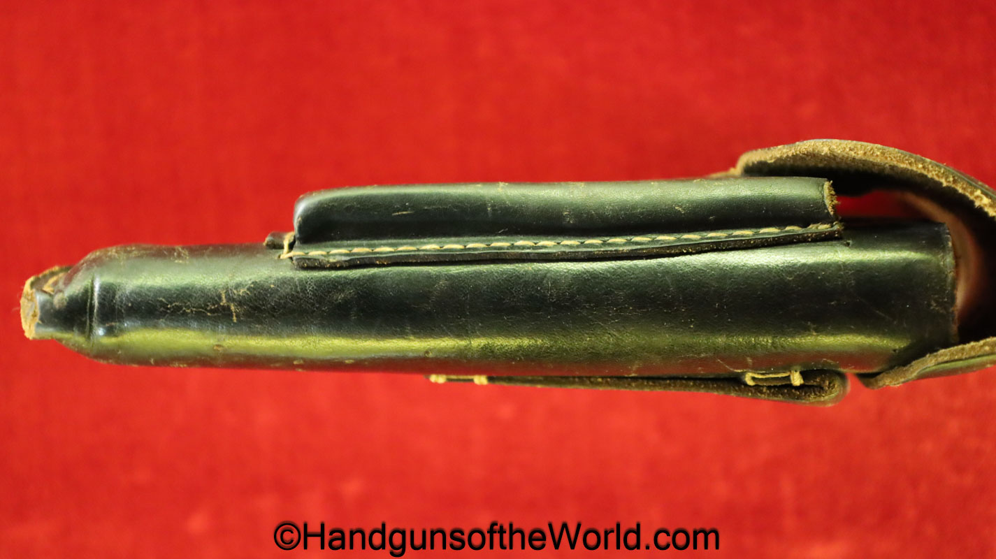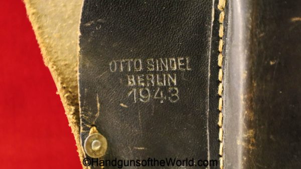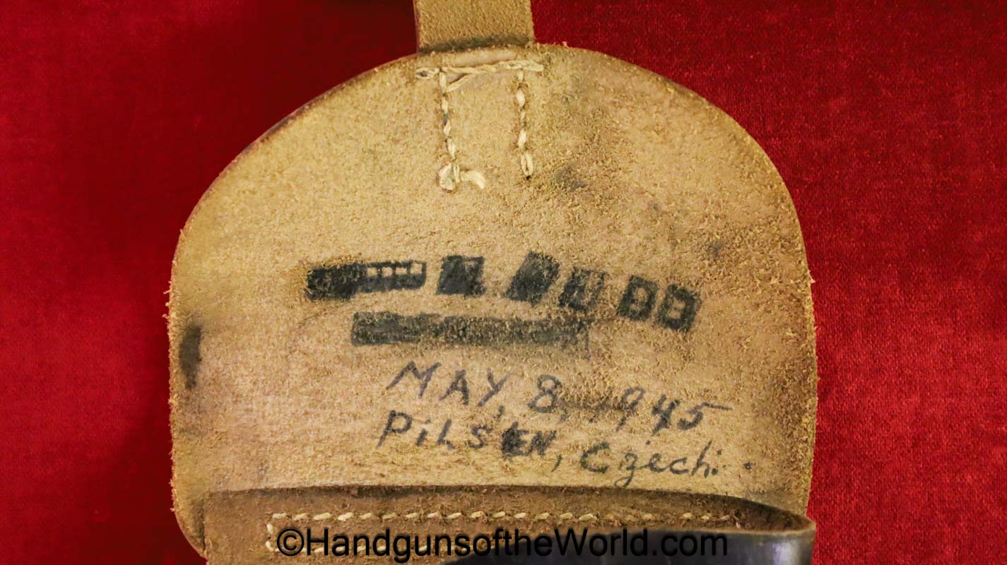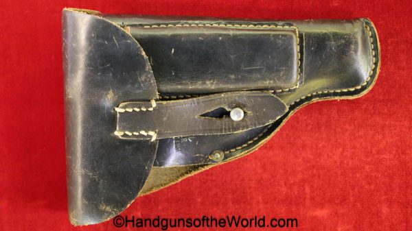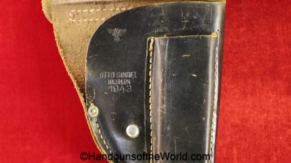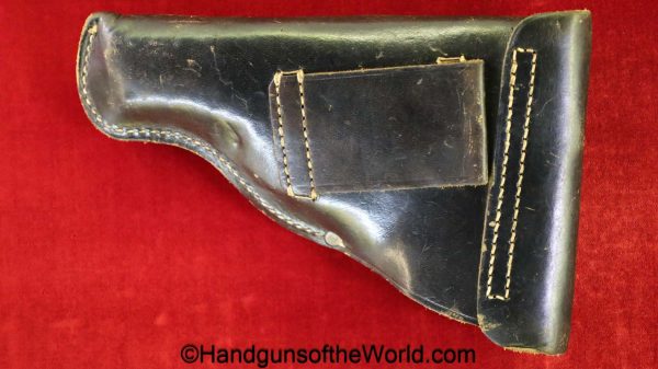 CZ-27, 7.65mm. This has the full slide legend with brown Bakelite grips with the CZ logo. This is German WWII WaA76 proofed on the right side of the slide. This has all matching numbers with the side plate showing a factory adjustment. The high polish blue rates about 98% and the bore is Mint. This comes with an original Police pattern black leather holster marked otto Sindel-Berlin 1943 on the front, and its hold down tab shows an adjustment.