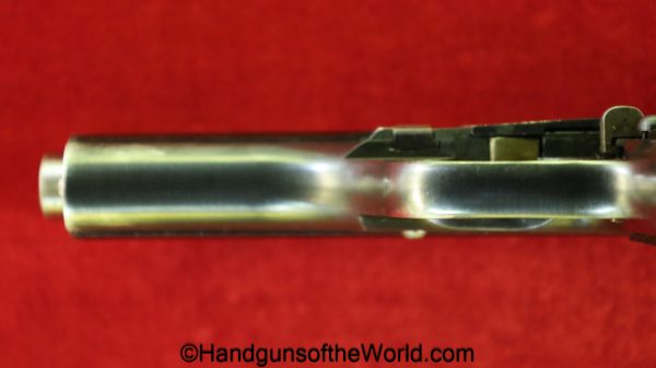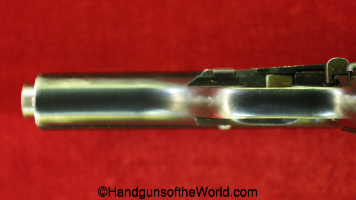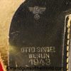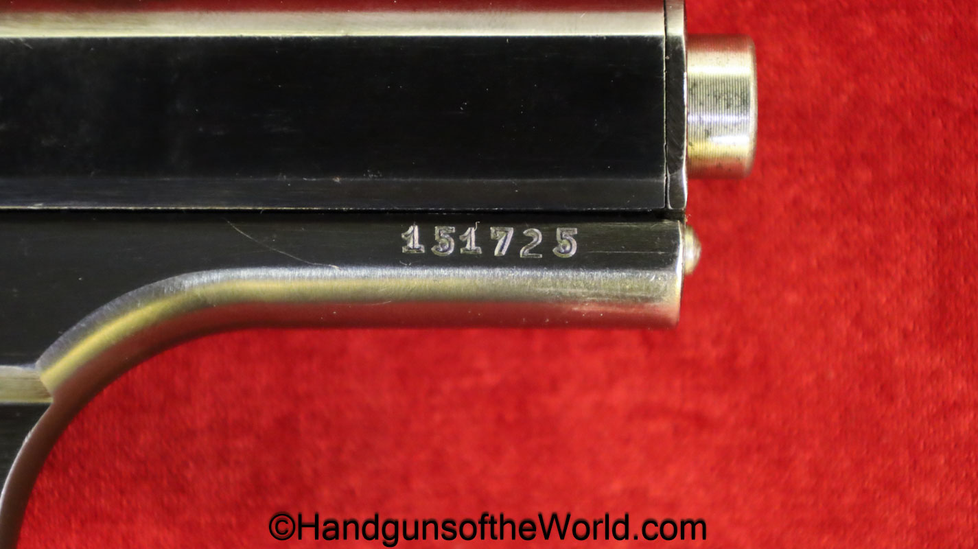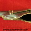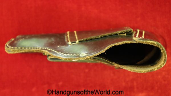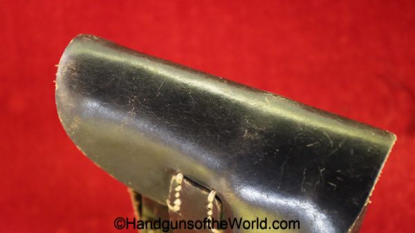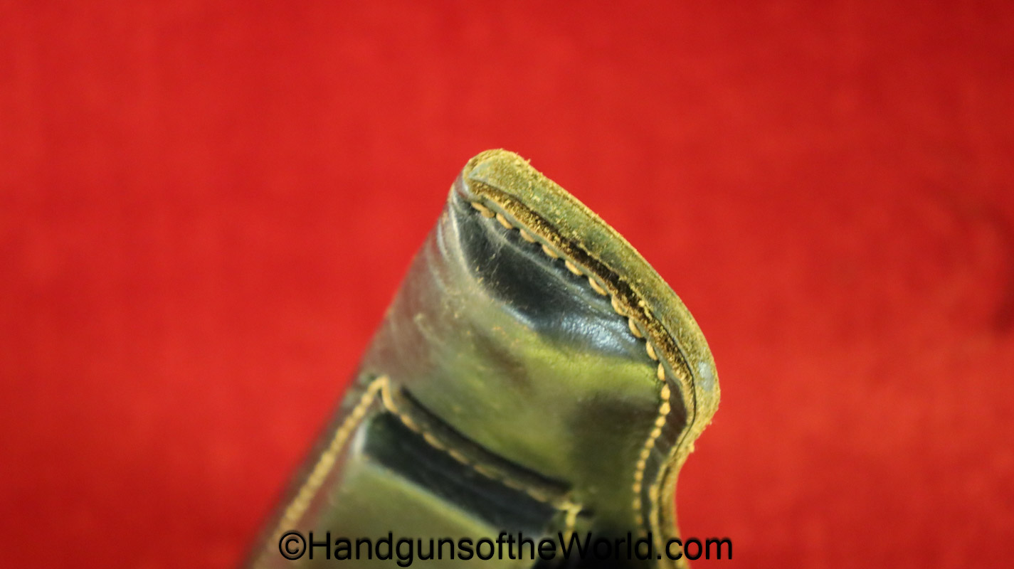 CZ-27, 7.65mm. This has the full slide legend with brown Bakelite grips with the CZ logo. This is German WWII WaA76 proofed on the right side of the slide. This has all matching numbers with the side plate showing a factory adjustment. The high polish blue rates about 98% and the bore is Mint. This comes with an original Police pattern black leather holster marked otto Sindel-Berlin 1943 on the front, and its hold down tab shows an adjustment.