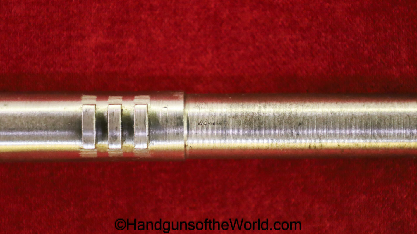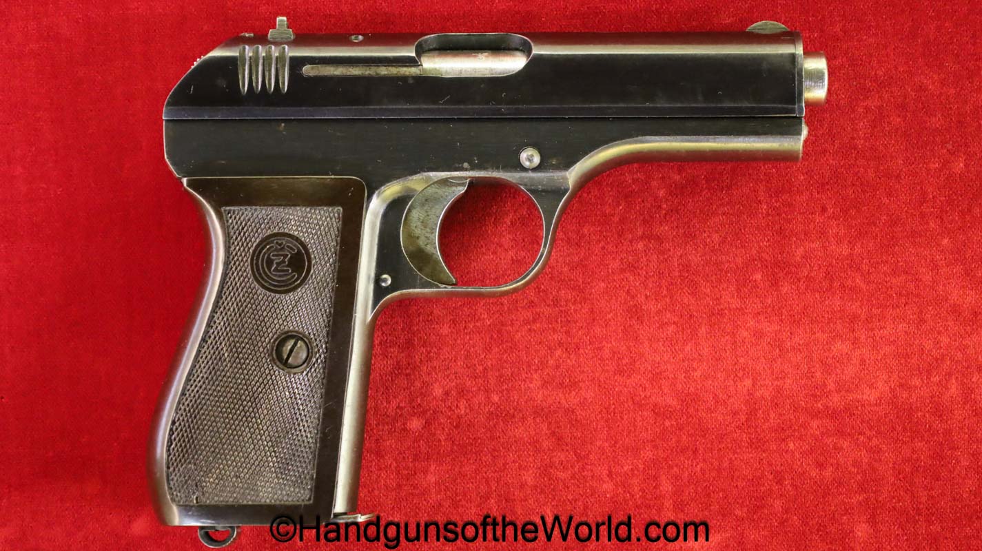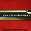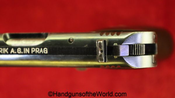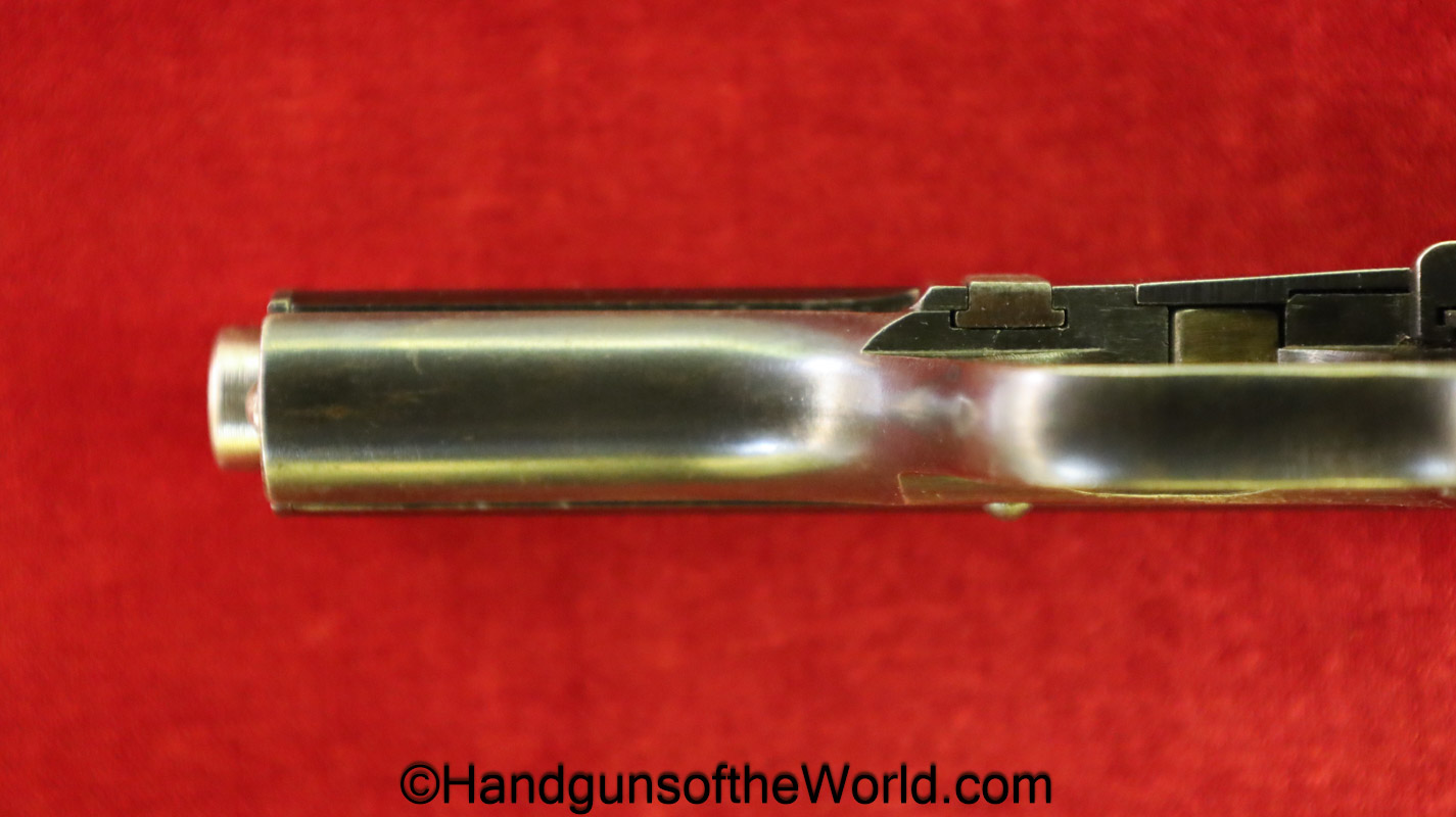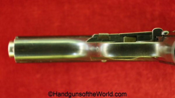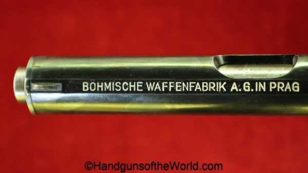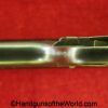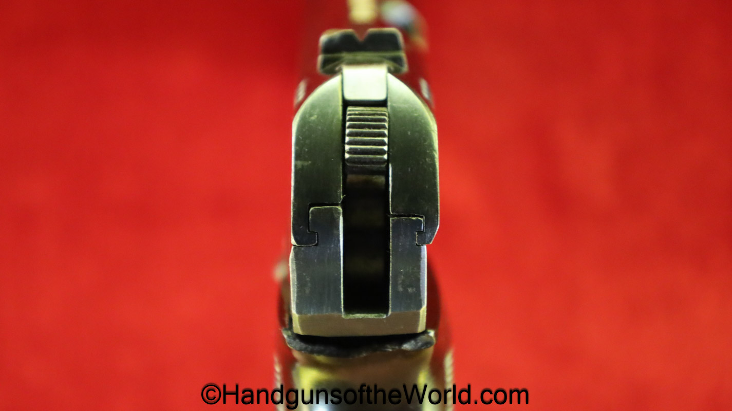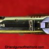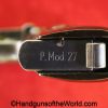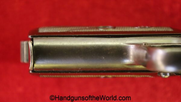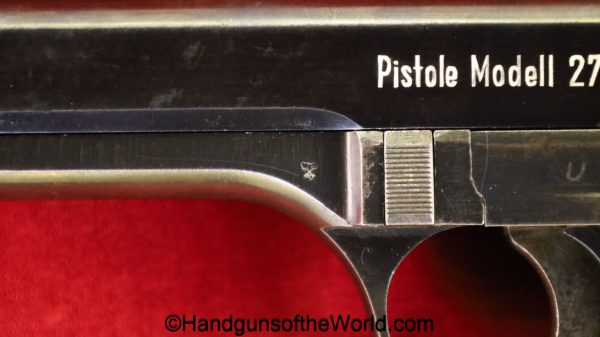 CZ-27, 7.65mm. This has “U1130” etched on the side plate and is German Eagle 4 test proofed on the left side of the frame. Also, there is no Test proof on the top of the slide, nor a WaA76 proof on the right side of the frame. This has the CZ logo, brown Bakelite grips with a chip at the rear top. The high polish blue rates about 95% and the bore is excellent.