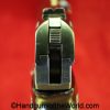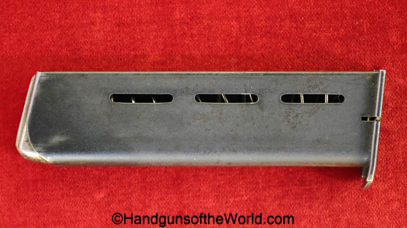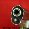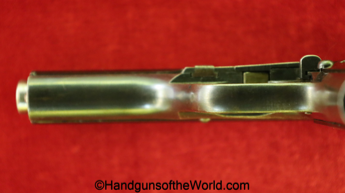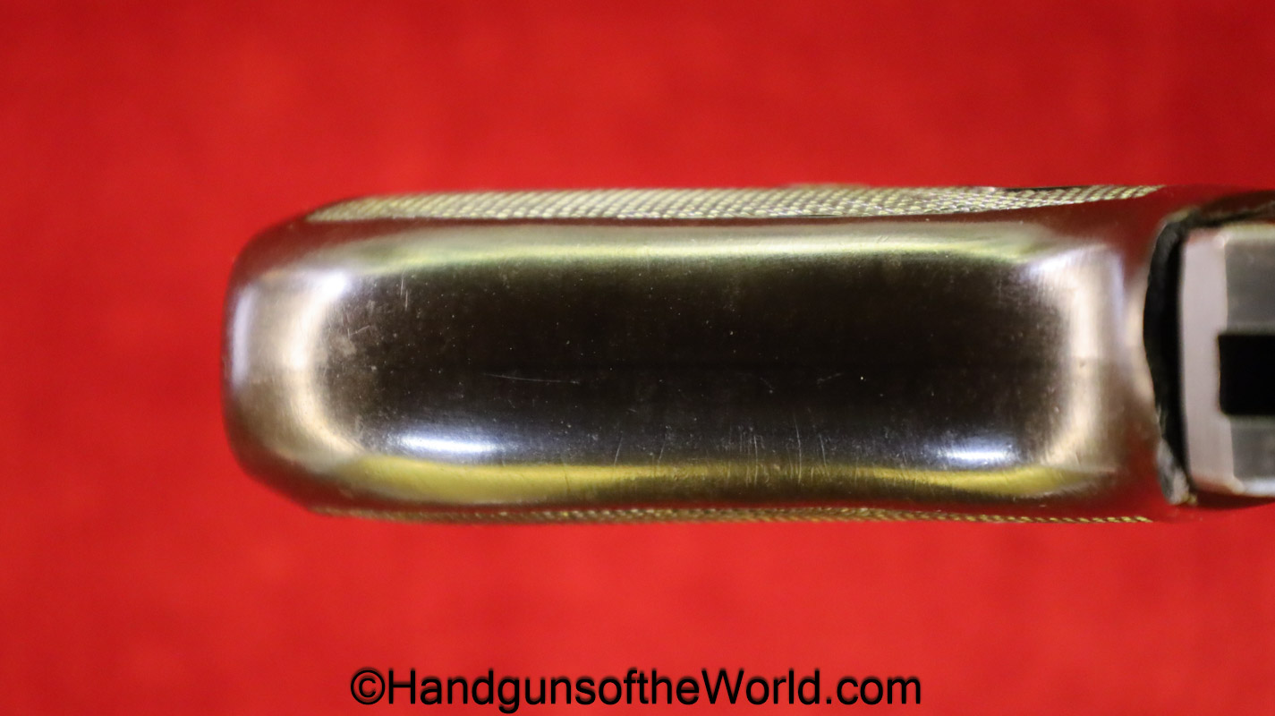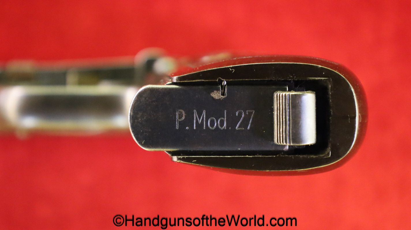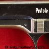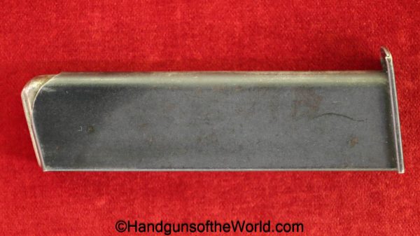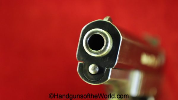 CZ-27, 7.65mm. This has “U1130” etched on the side plate and is German Eagle 4 test proofed on the left side of the frame. Also, there is no Test proof on the top of the slide, nor a WaA76 proof on the right side of the frame. This has the CZ logo, brown Bakelite grips with a chip at the rear top. The high polish blue rates about 95% and the bore is excellent.